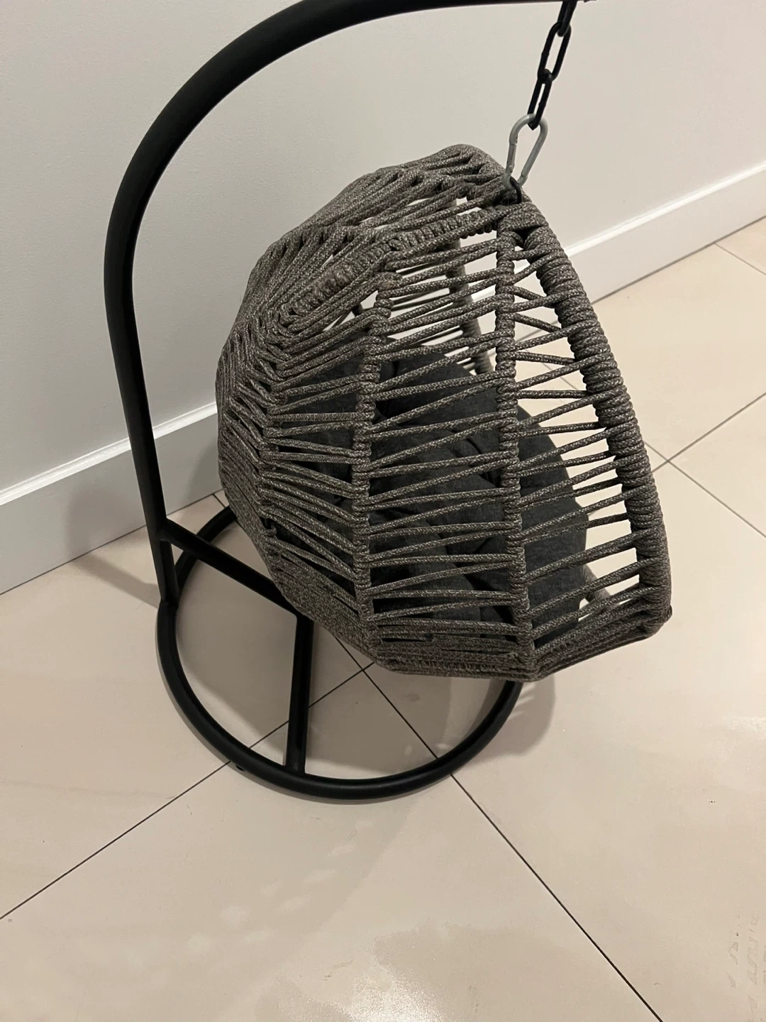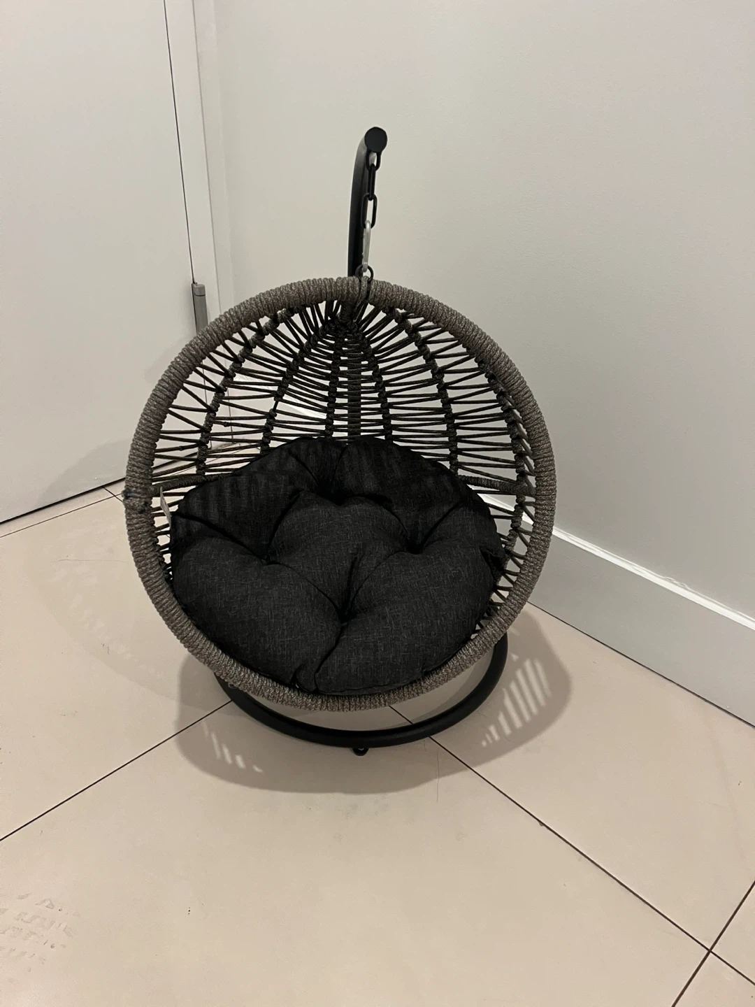 This small dog/cat hanging egg chair features a durable woven rattan exterior and a comfortable dark gray cushion. It includes a sturdy metal stand for stability. Must pick up