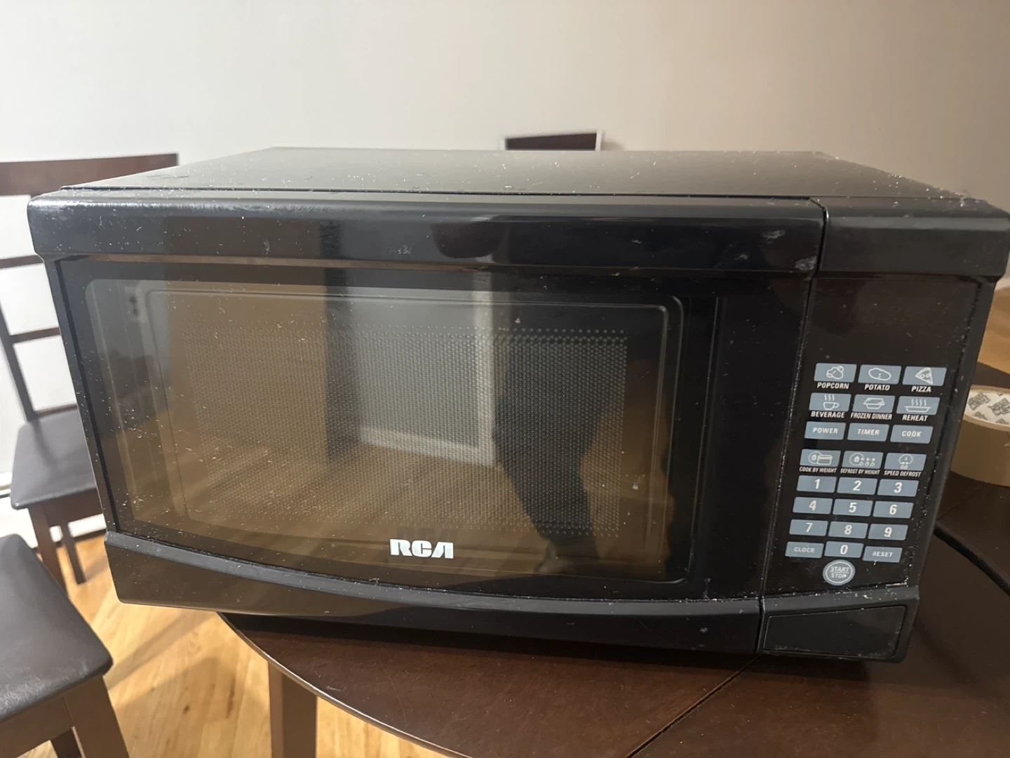 This is a black RCA microwave oven. It has preset buttons for popcorn, potato, and pizza. Also includes power, timer, and cook functions.