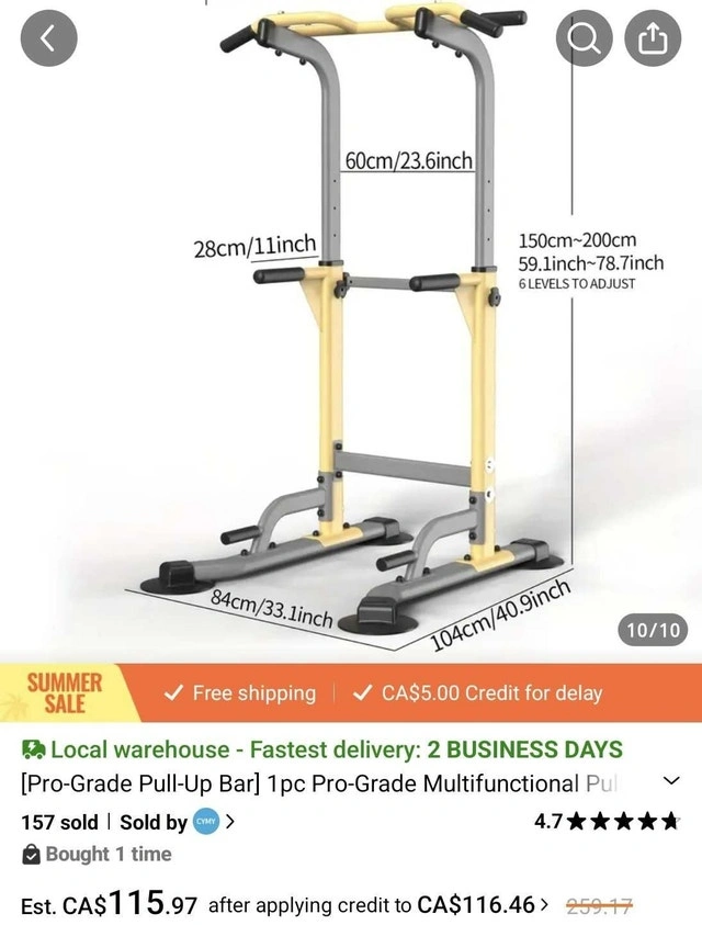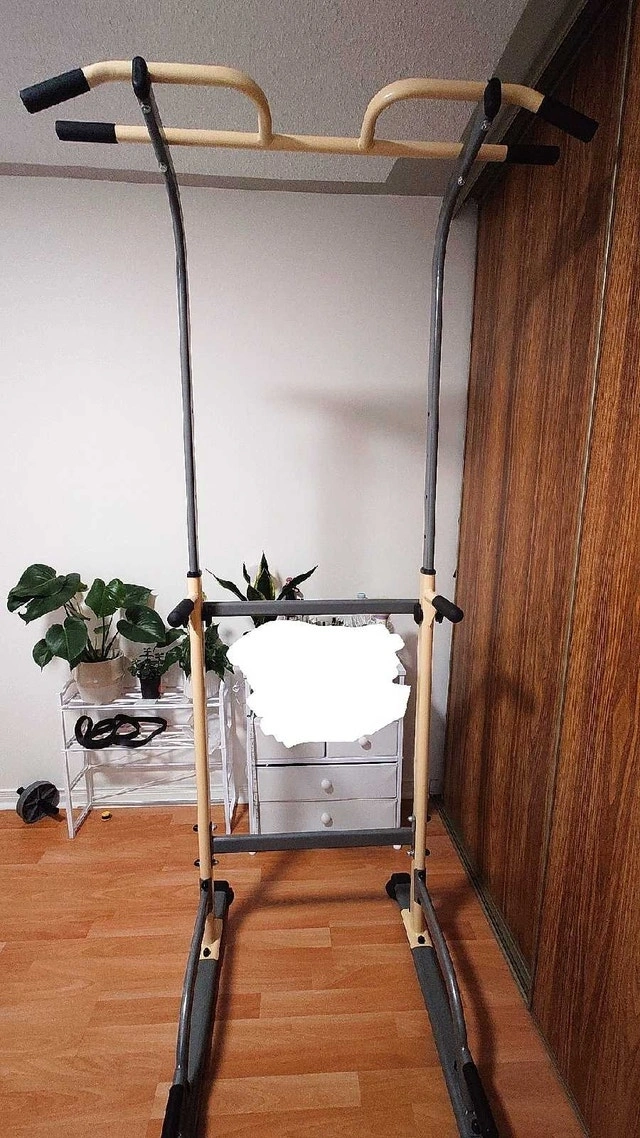 Pull-up and dip station, perfect for home fitness enthusiasts! This used station is in excellent condition and ready to help you build strength and tone your upper body. Adjustable height to suit various fitness levels, sturdy construction for safe workouts, and a compact design to save space. I will dismantle it and try to put it back like picture 3 for transportation, and will provide the original manual to assemble. I estimate the value of this item between $75-$125 CAD based on similar listings I've seen on Kijiji. If this ad is still up, then yes, it’s still available.