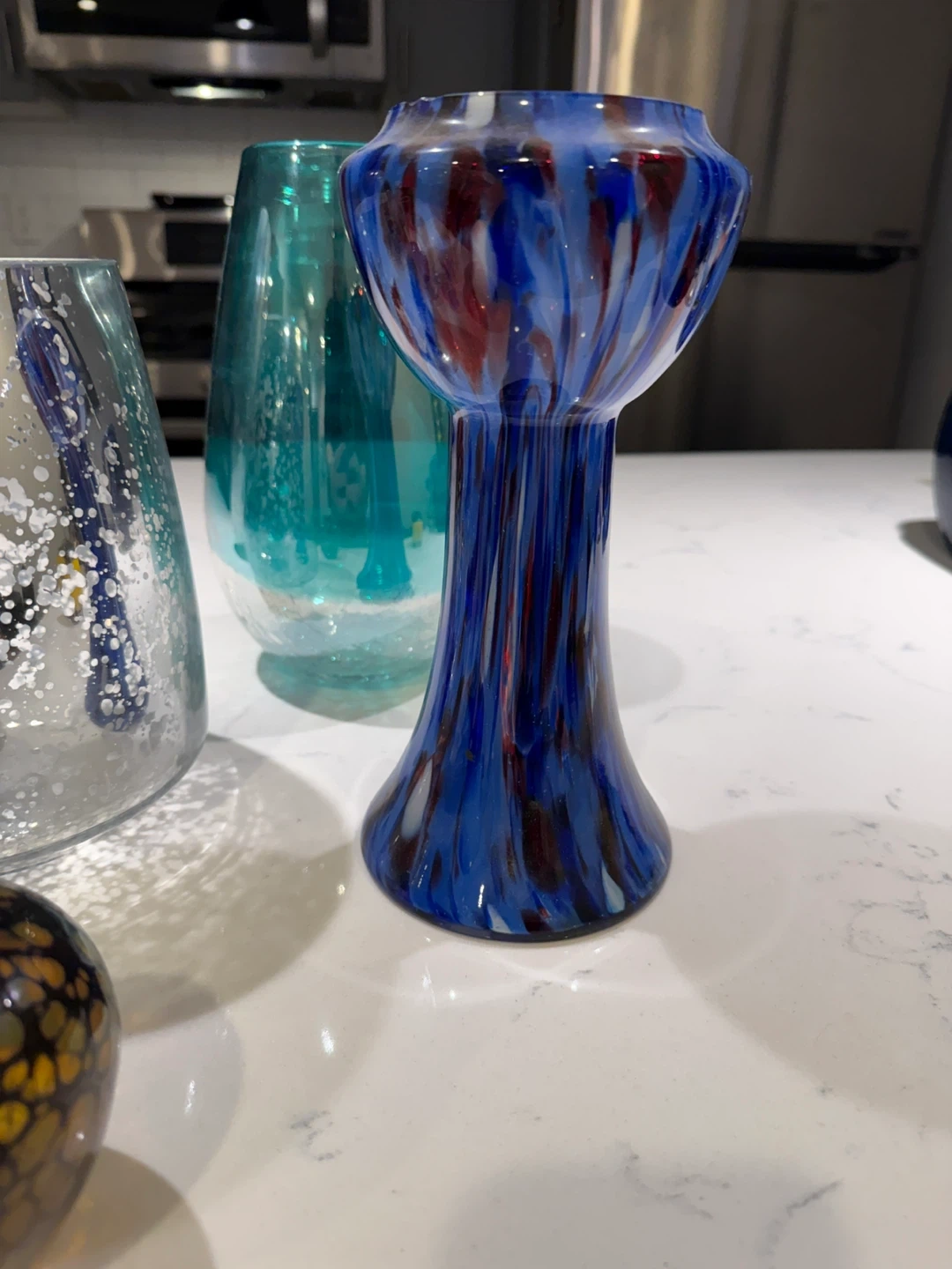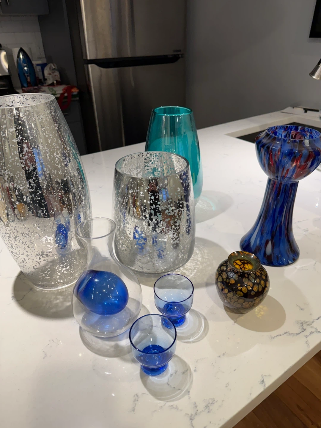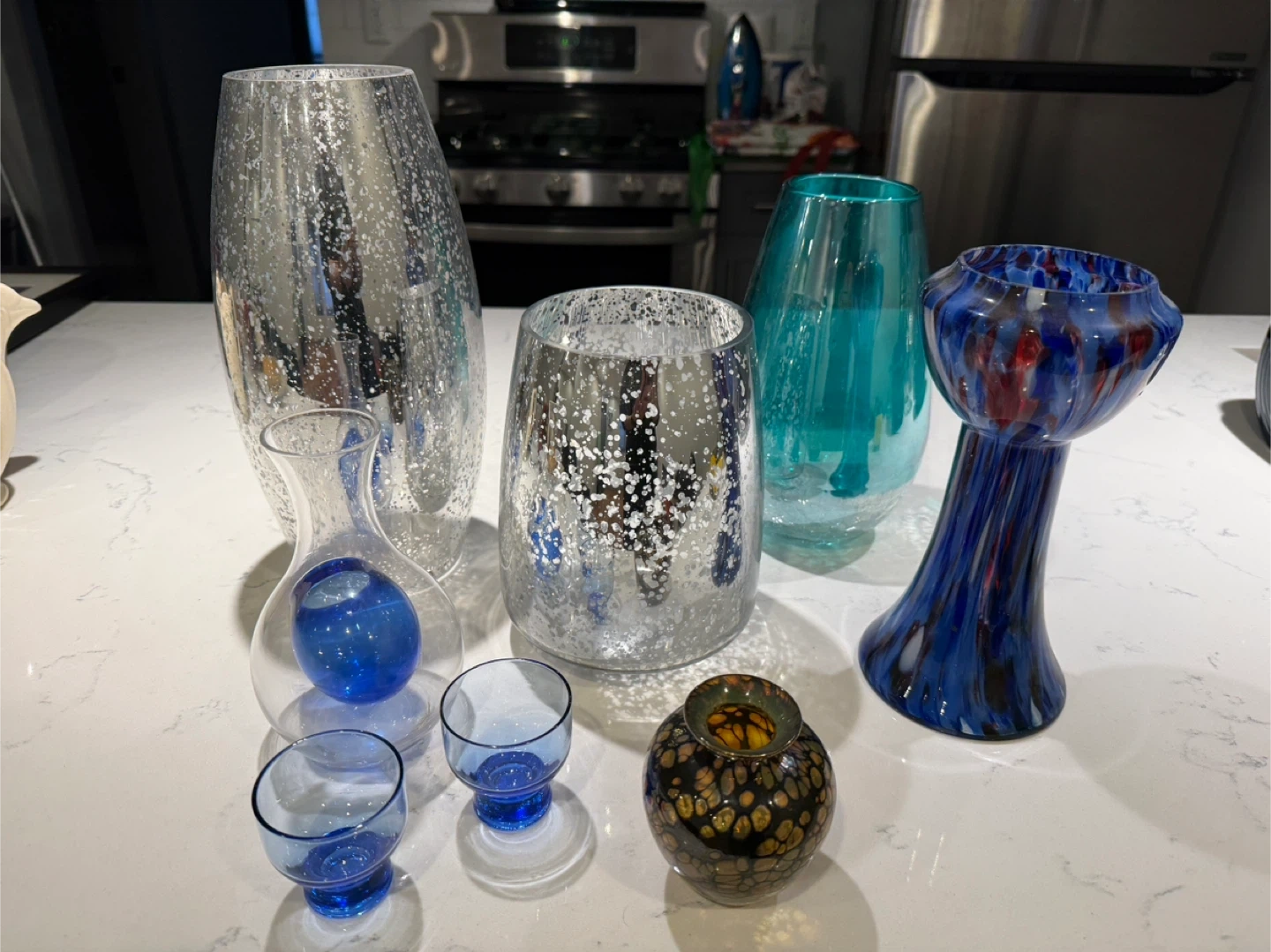 Selling a collection of decorative glass vases in various styles and colors. They would look great as centerpieces or accent pieces in your home! There are silver, blue, and multi-colored designs available.