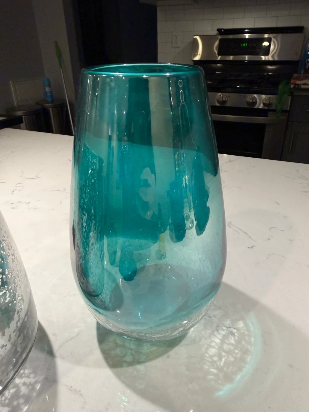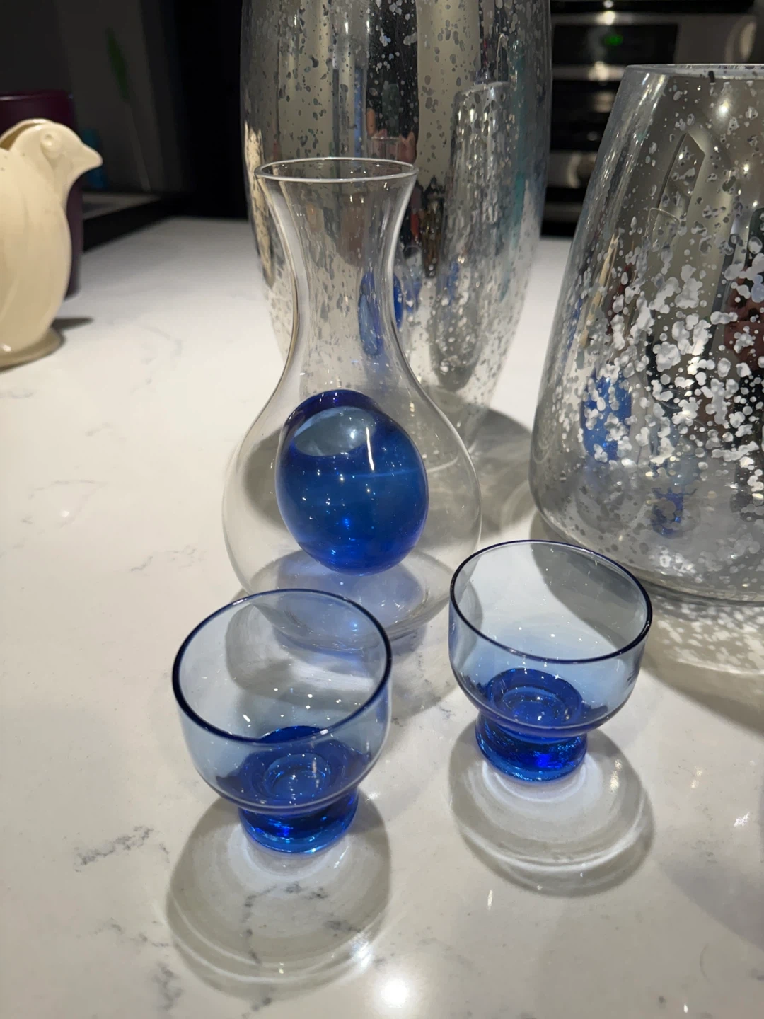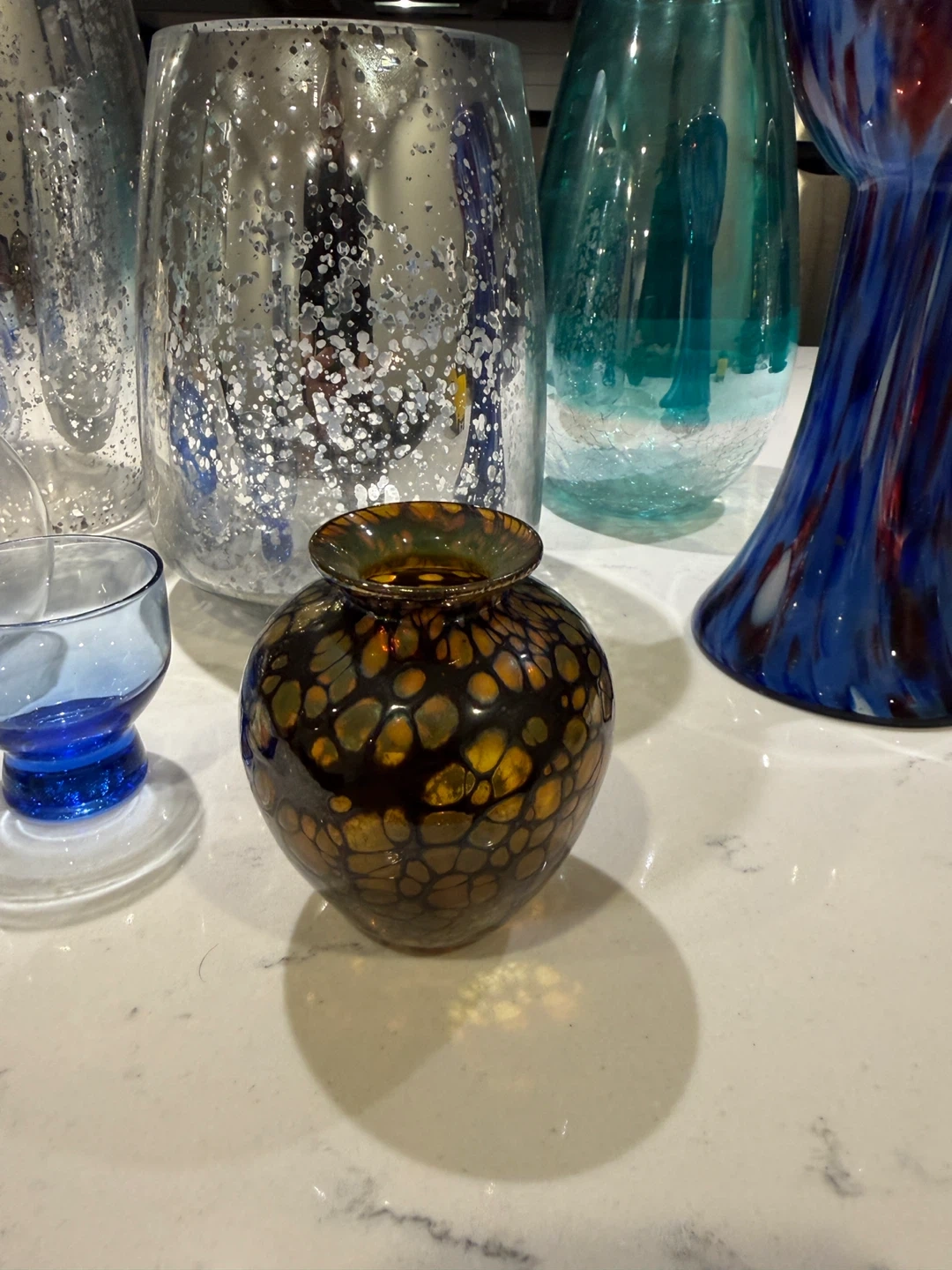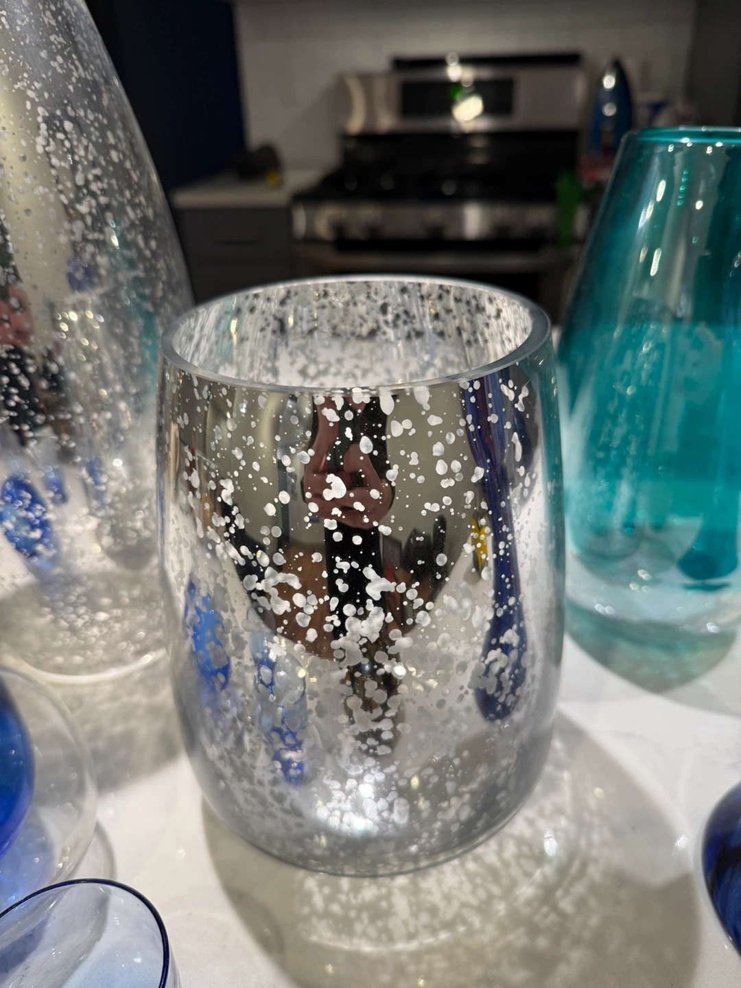 Selling a collection of decorative glass vases in various styles and colors. They would look great as centerpieces or accent pieces in your home! There are silver, blue, and multi-colored designs available.
