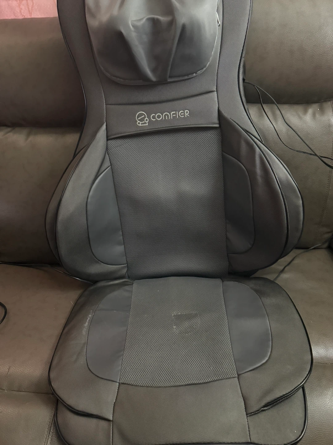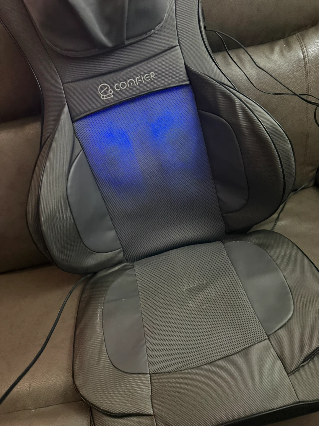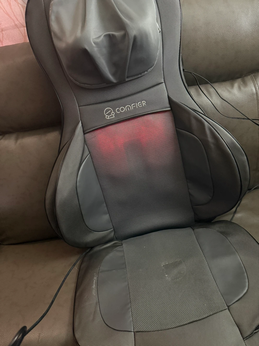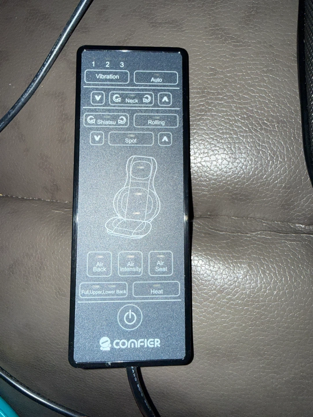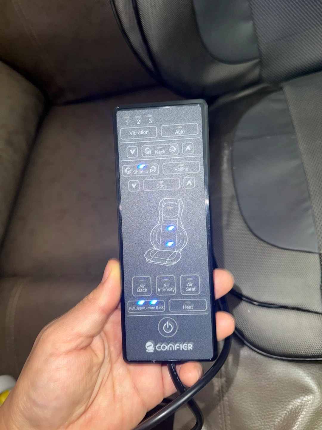 This Comfier shiatsu massager targets your neck and back. It's a model CF-2307A. Includes a remote for easy control of vibration, neck, rolling, and shiatsu settings. Air intensity and heat options are also available.
