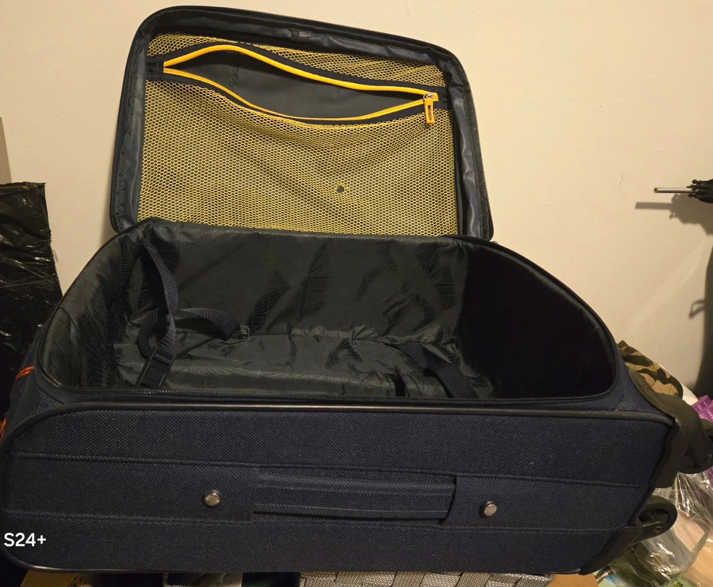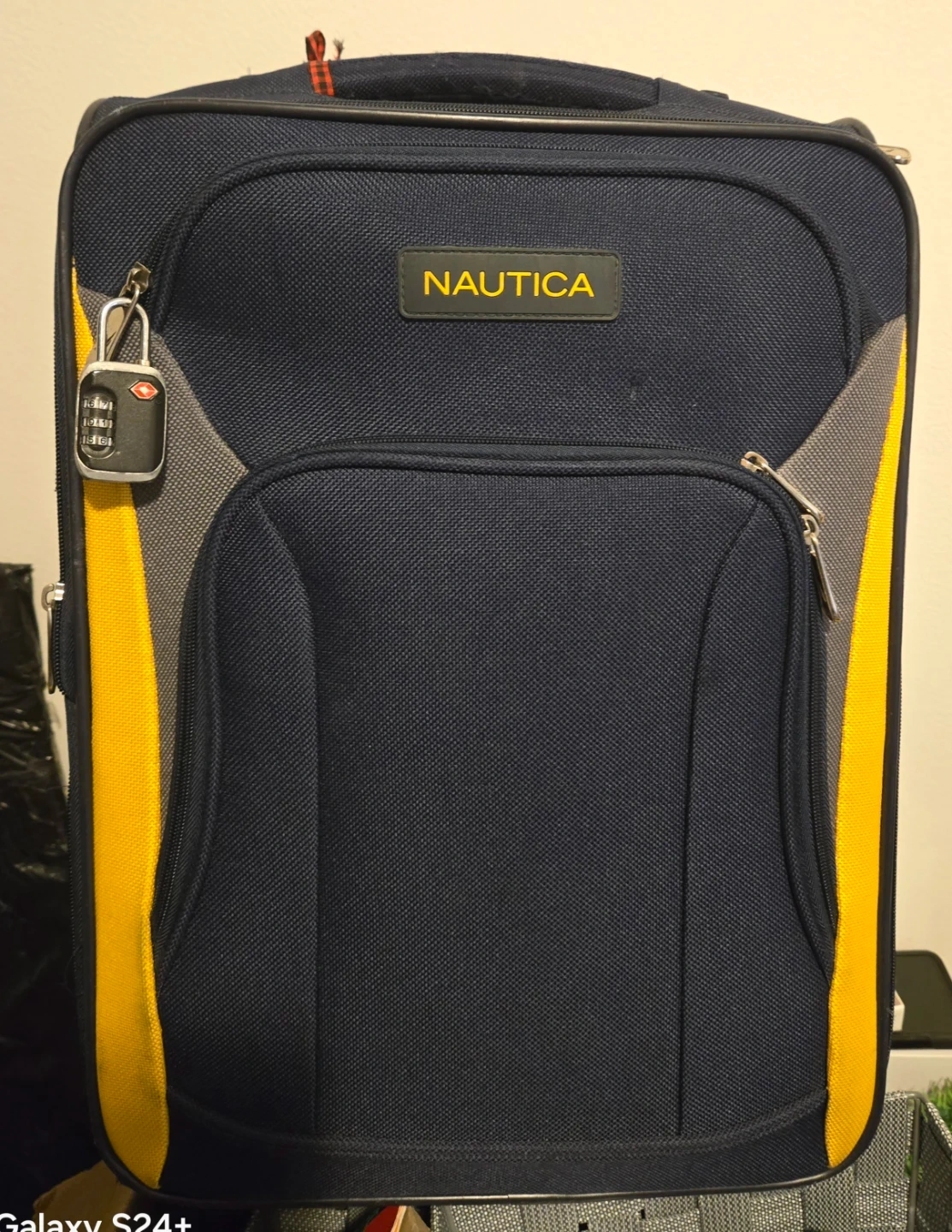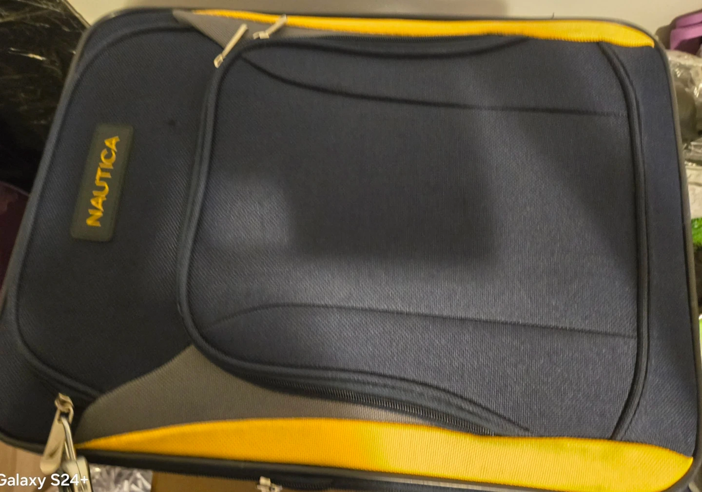 This is a Nautica navy blue and yellow spinner carry on. It has a durable fabric exterior and four spinner wheels for easy manoeuvring. The telescopic handle is adjustable for comfortable use. It's perfect for carrying your travel essentials! Offers aceptable