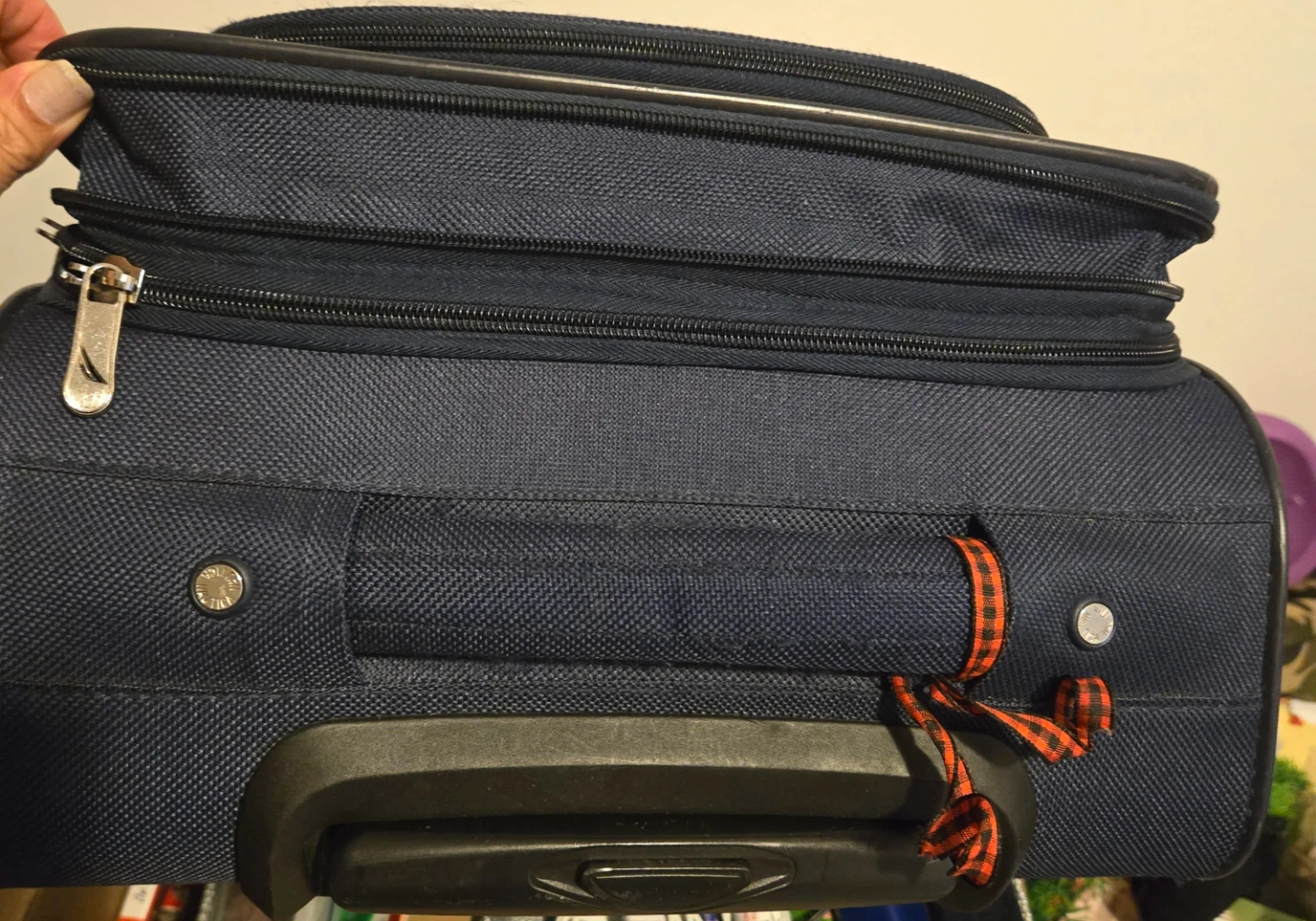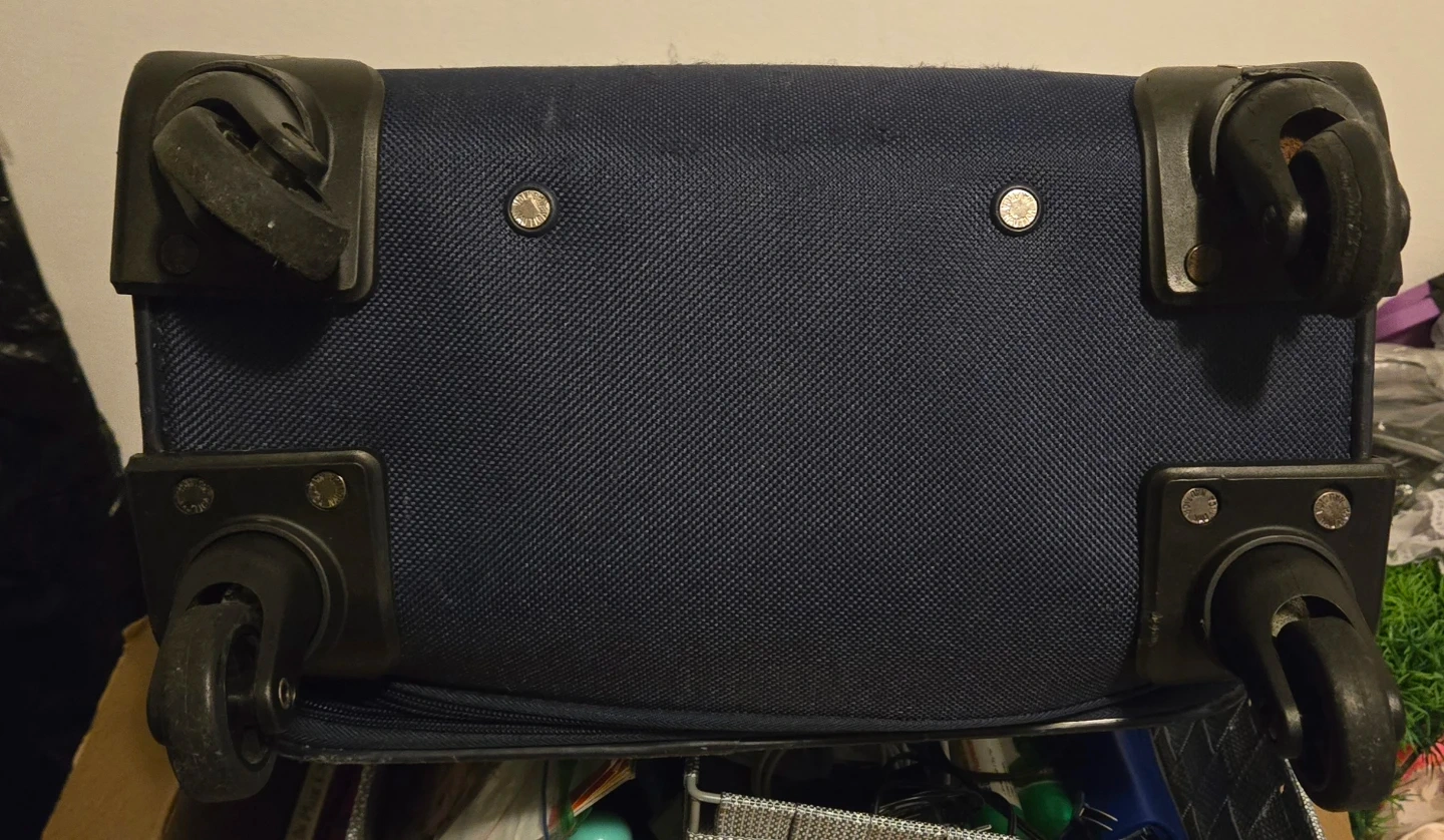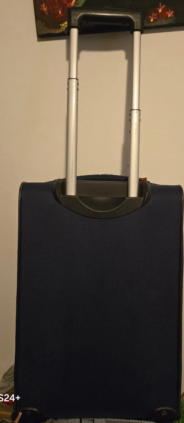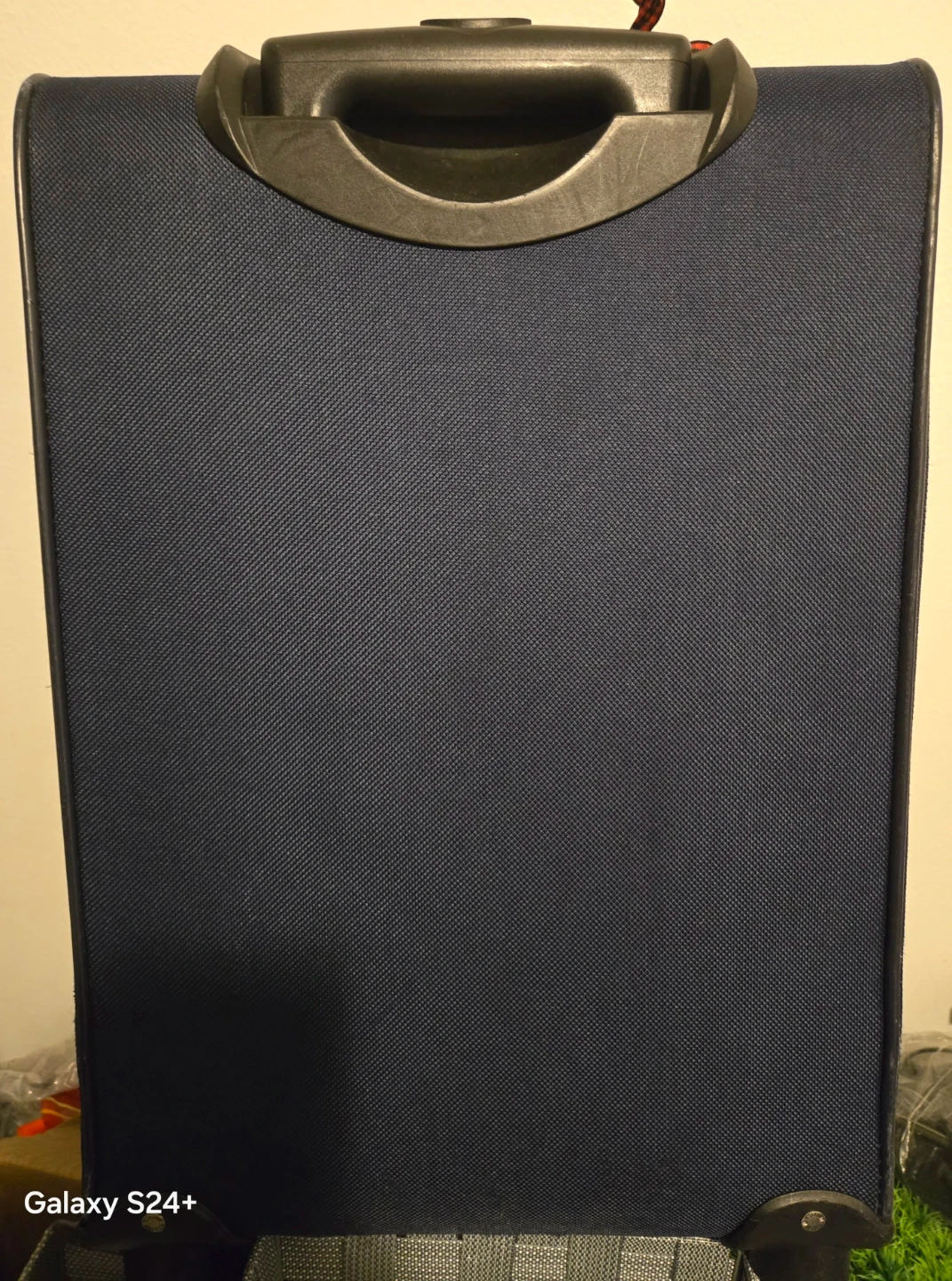 This is a Nautica navy blue and yellow spinner carry on. It has a durable fabric exterior and four spinner wheels for easy manoeuvring. The telescopic handle is adjustable for comfortable use. It's perfect for carrying your travel essentials! Offers aceptable