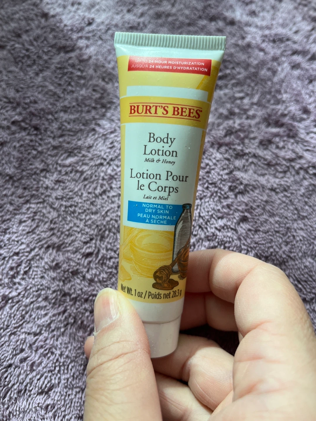 Burt's Bees body lotion with milk and honey. It's for normal to dry skin. Provides up to 24-hour moisturization. Net weight is 1 oz or 28.3g.