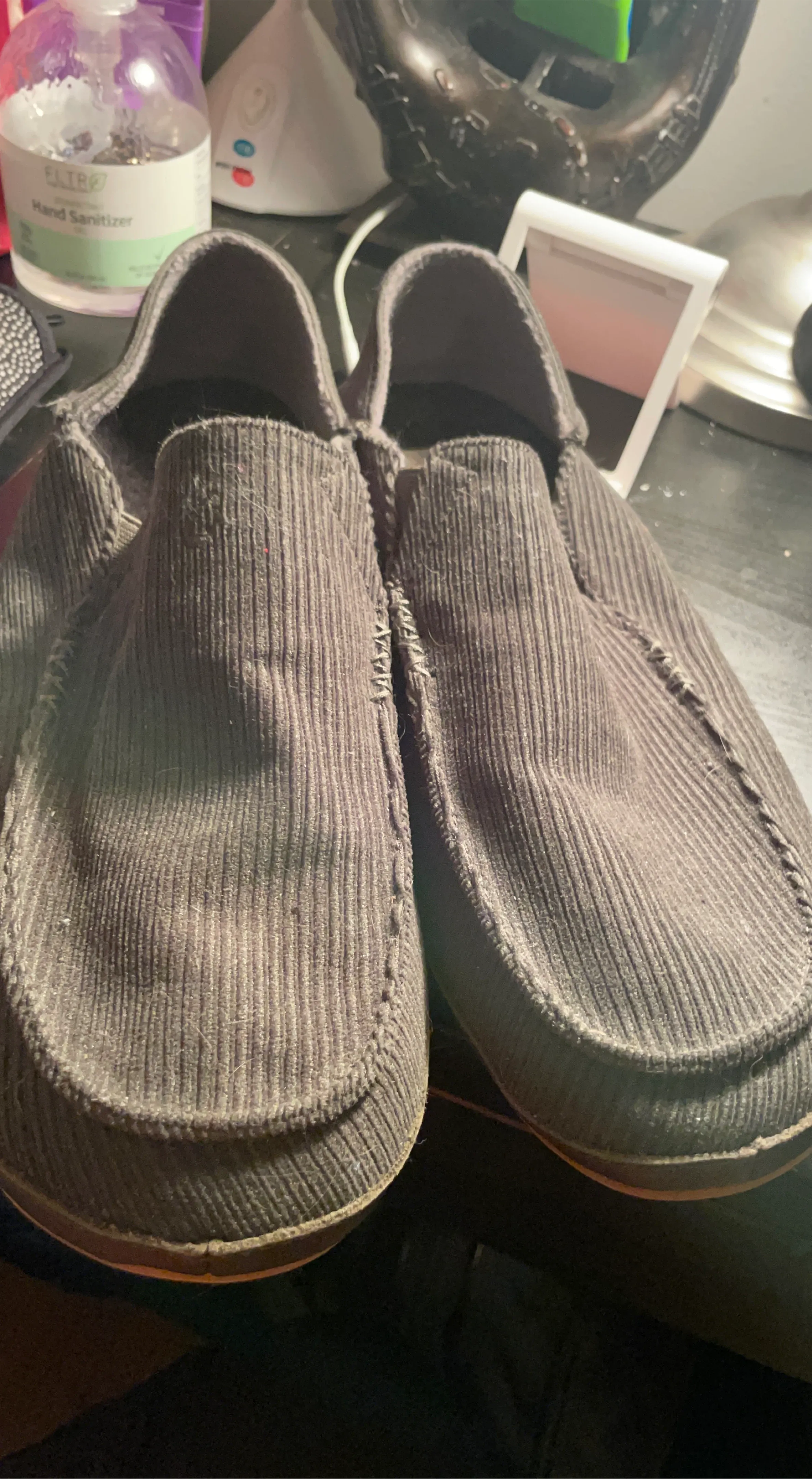 These are a pair of corduroy slip-on shoes! They look comfy and casual, perfect for everyday wear