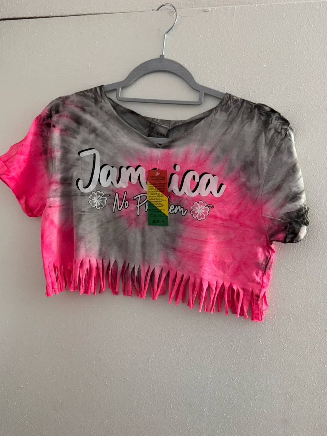 This is a fun tie-dye crop top with a "Jamaica No Problem" graphic. It features short sleeves and a fringed hem. Size medium. It's made from a soft cotton blend.