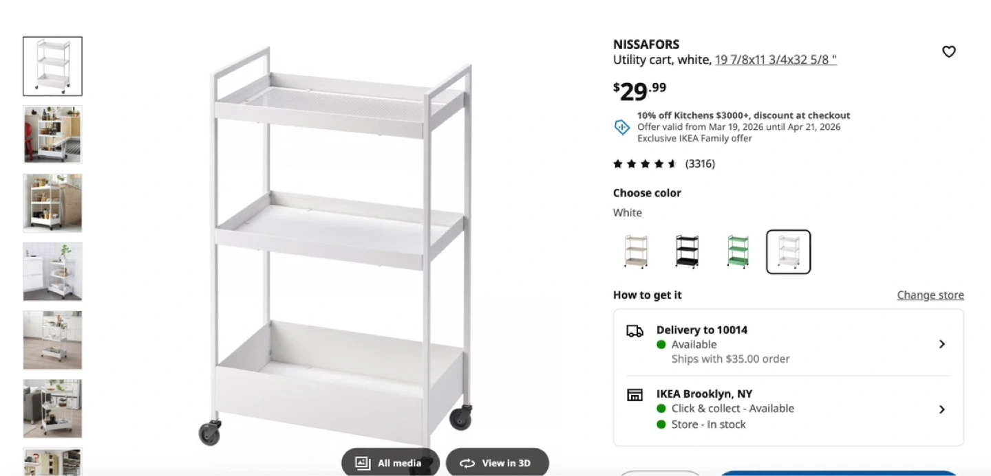 This is the NISSAFORS utility cart in white. It's 19 7/8 inches wide, 11 3/4 inches deep, and 32 5/8 inches tall. It's a great way to add extra storage and organization to any room!