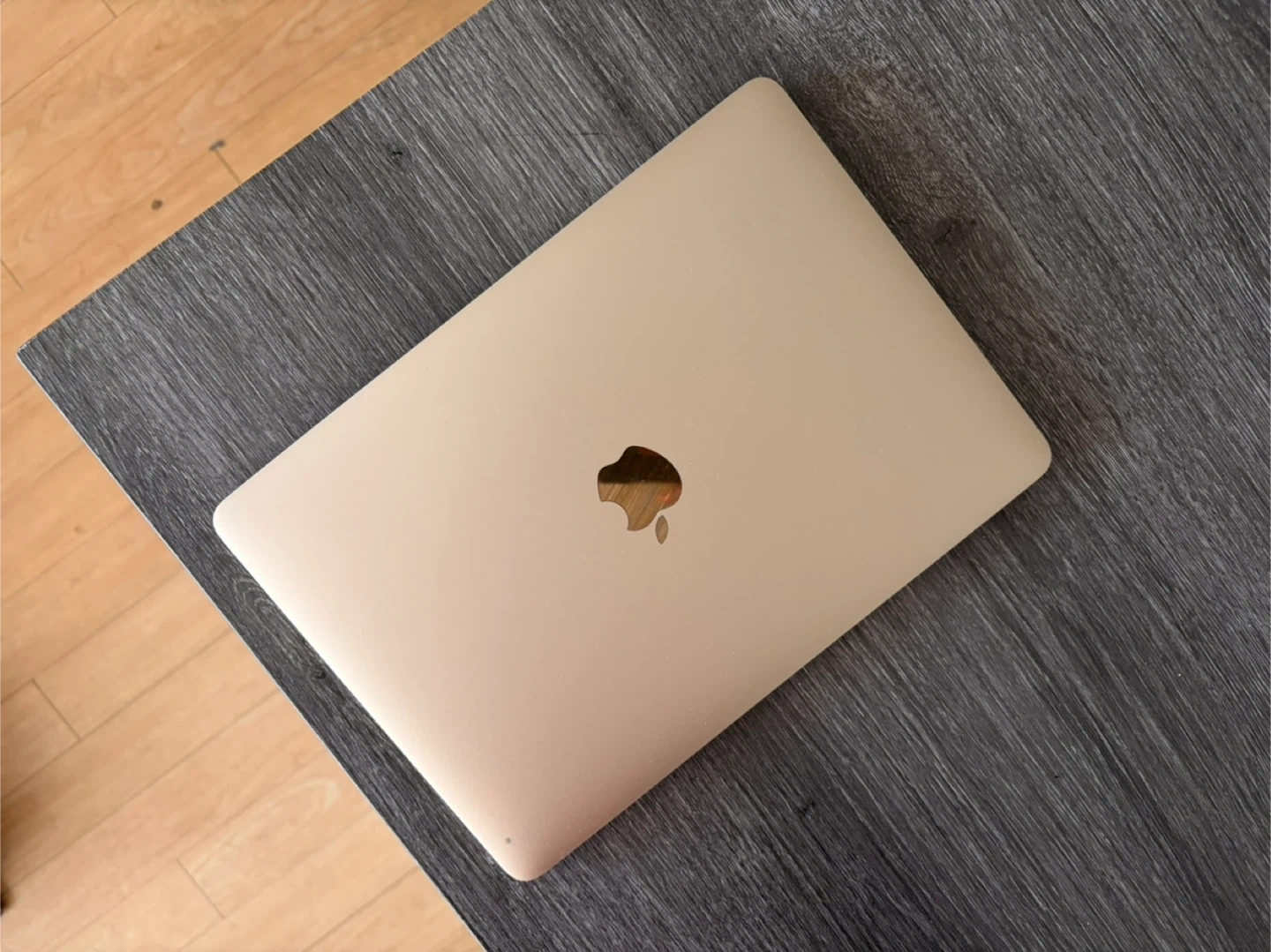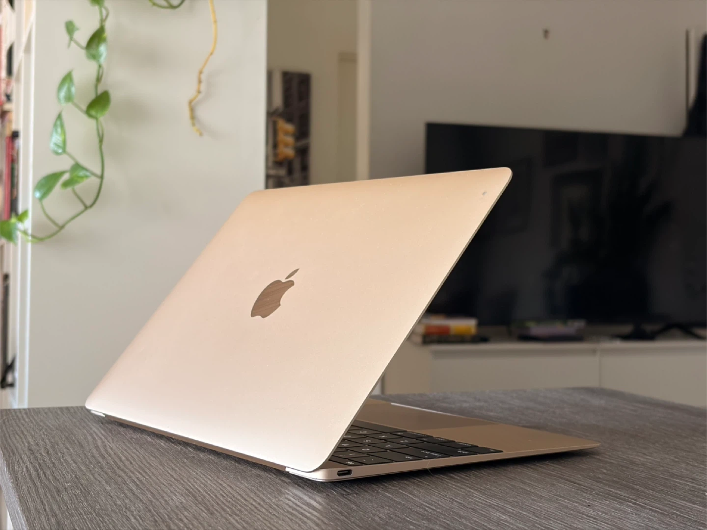 Gold Apple MacBook. It's a compact laptop with a Retina display. Includes a USB-C port.