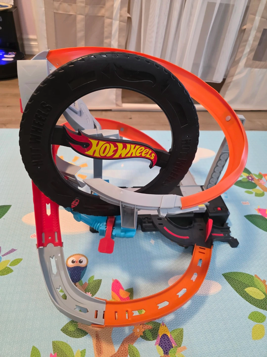 This Hot Wheels race track set features a triple loop for exciting car races. It's made of plastic and includes the track pieces needed for assembly. Kids will have a blast sending their cars through the loops!