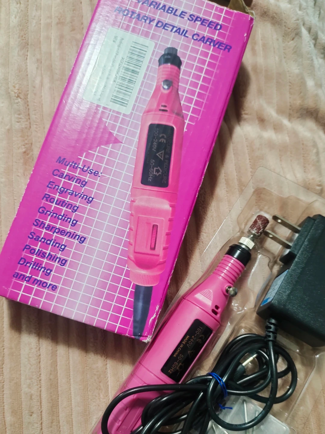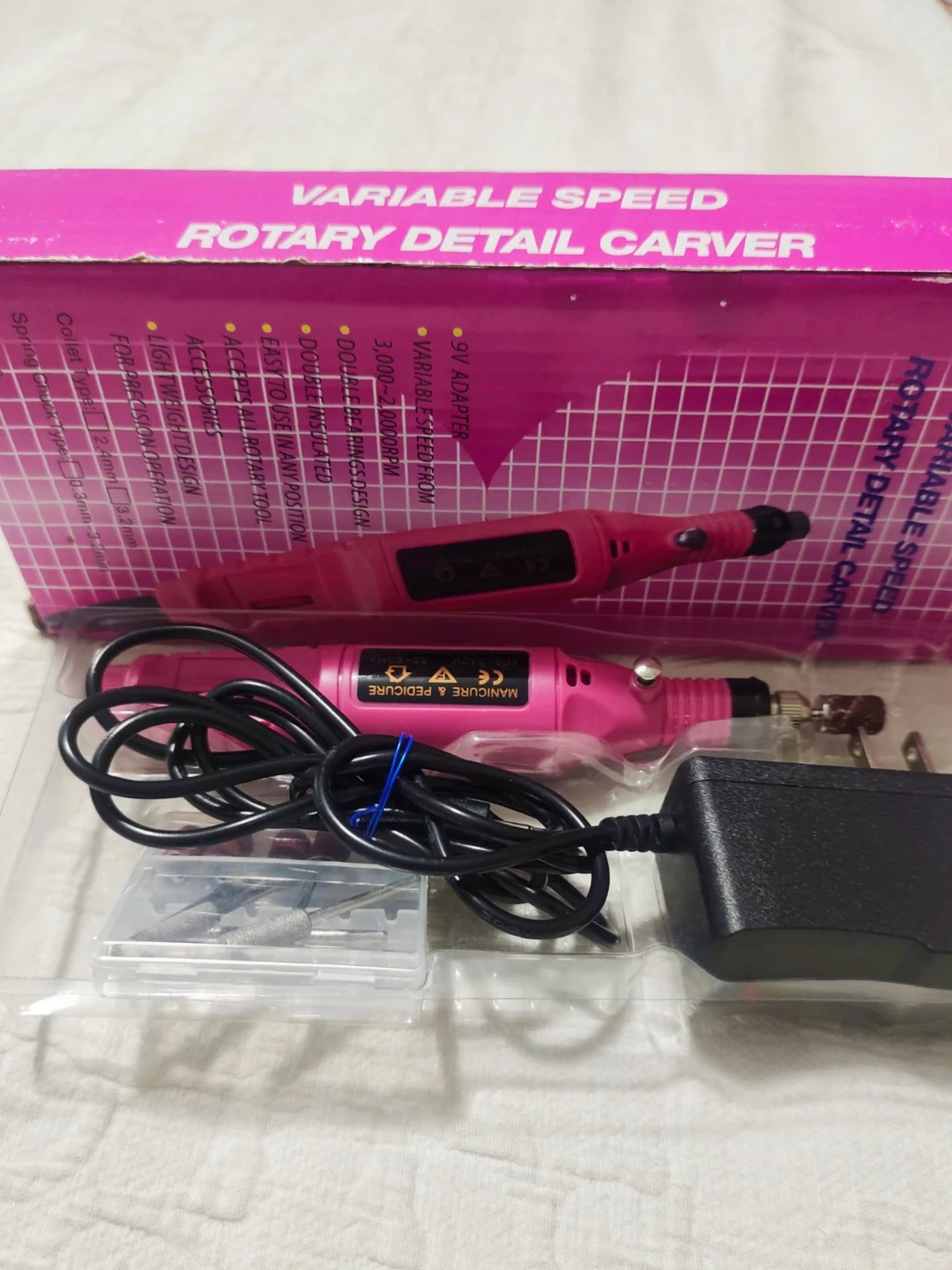 This is a pink rotary detail carver that also functions as a manicure and pedicure tool. It features variable speed control and comes with various accessories for carving, engraving, routing, grinding, sharpening, sanding, and polishing. It's great for crafts or personal grooming!