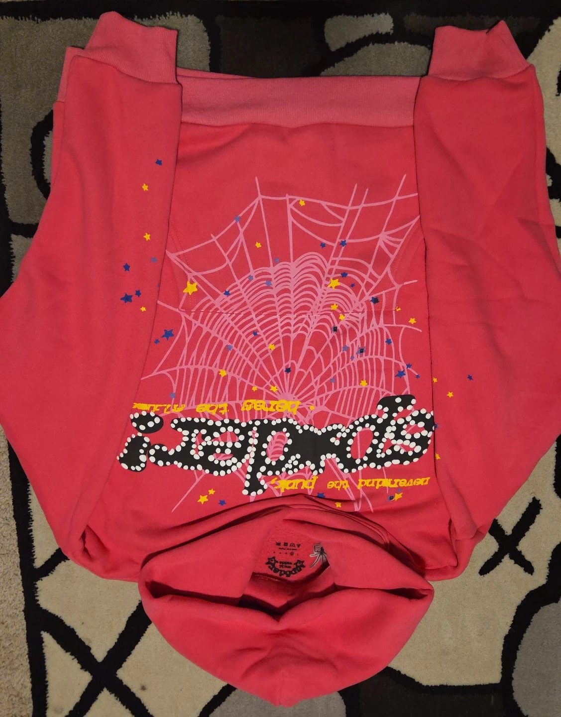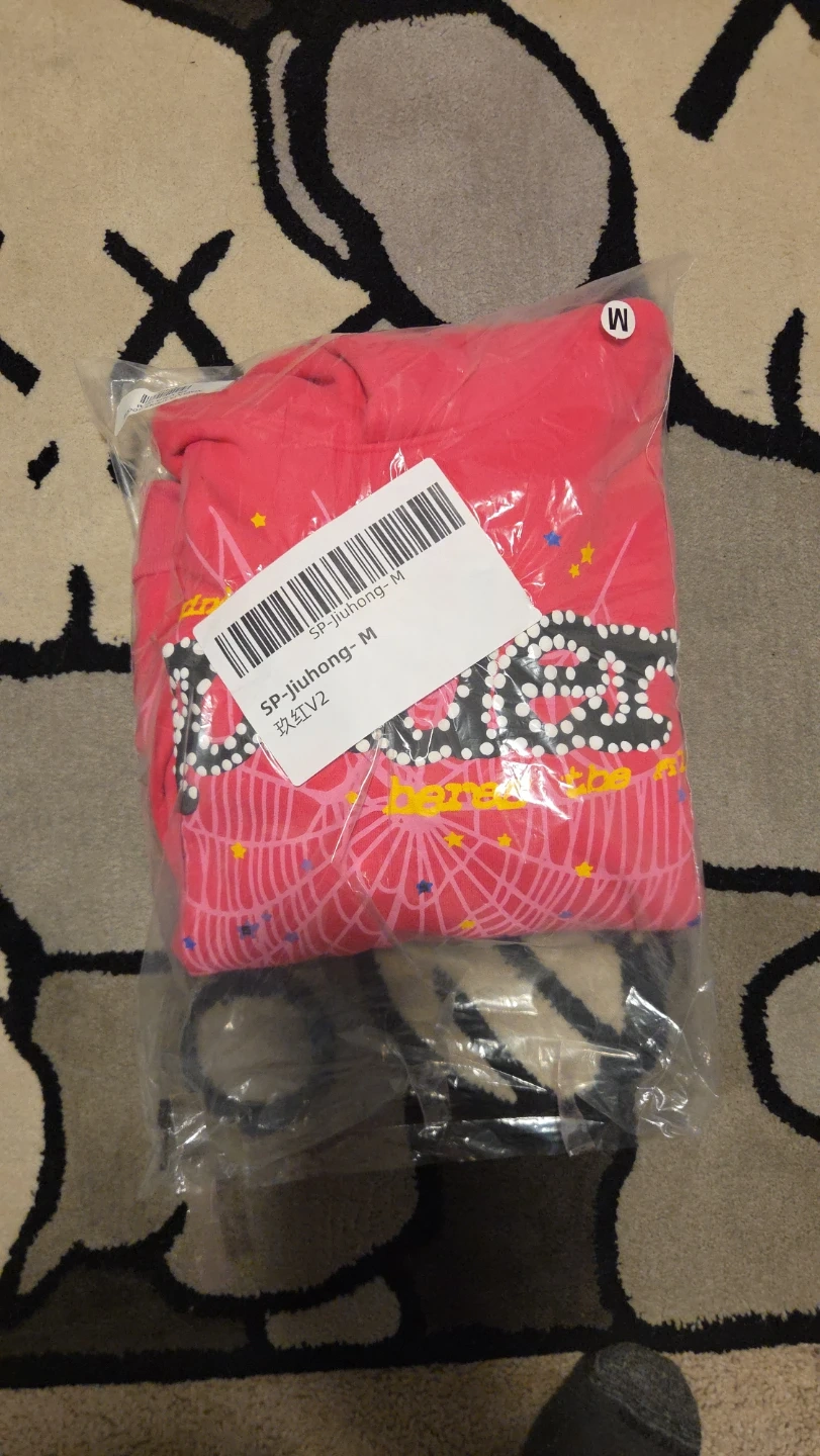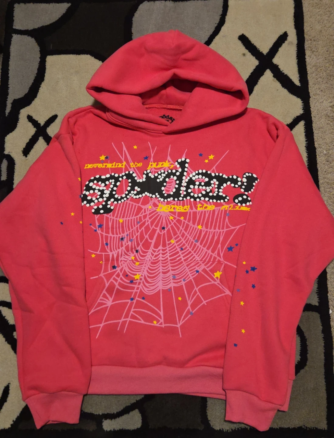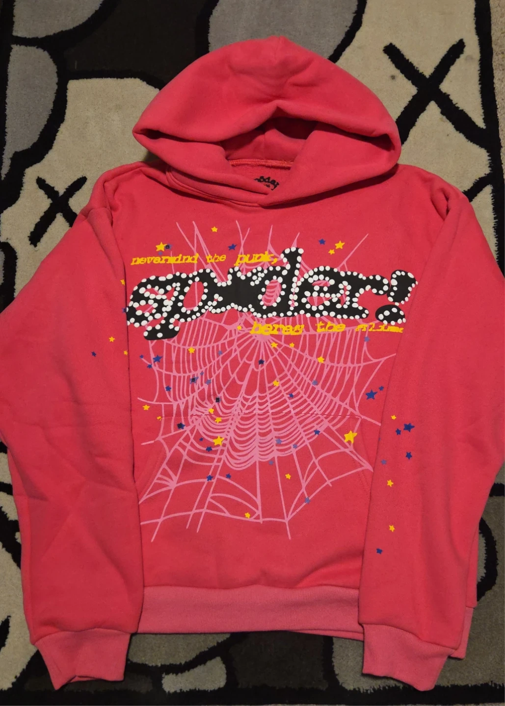 This is a pink Spider hoodie with a web graphic and text on the front. It's a size medium and comes in its original packaging. The material is soft and comfortable.