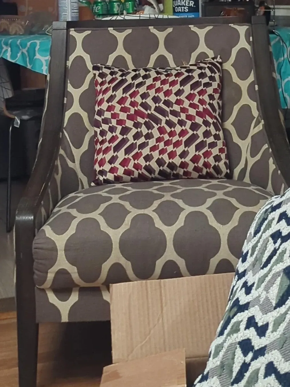This armchair features a stylish quatrefoil pattern on the upholstery and a matching accent pillow. The dark wood frame adds a classic touch. Upholstery material is fabric.