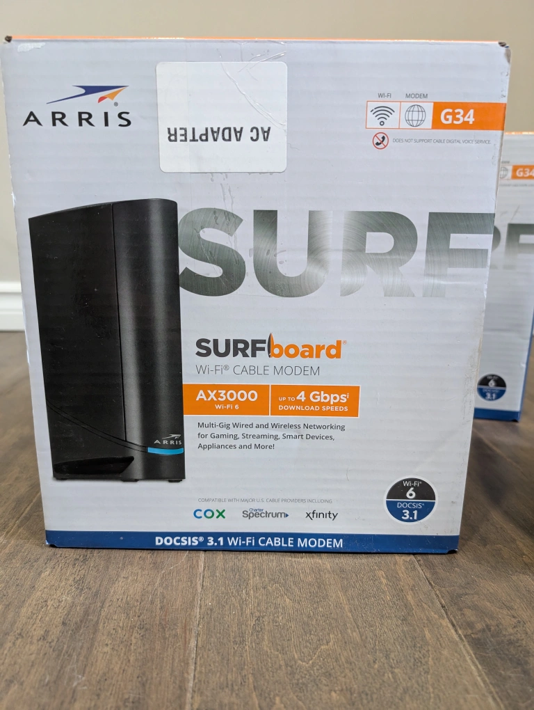 Brand new Arris Surfboard AX3000 G34 cable modem router combo for sale. Fast DOCSIS 3.1, gigabit Wifi 6, 3gbps 3000mbps max internet speeds, wi-fi, internet, Surf Board wired and wireless networking, ethernet, $150 FIRM each.