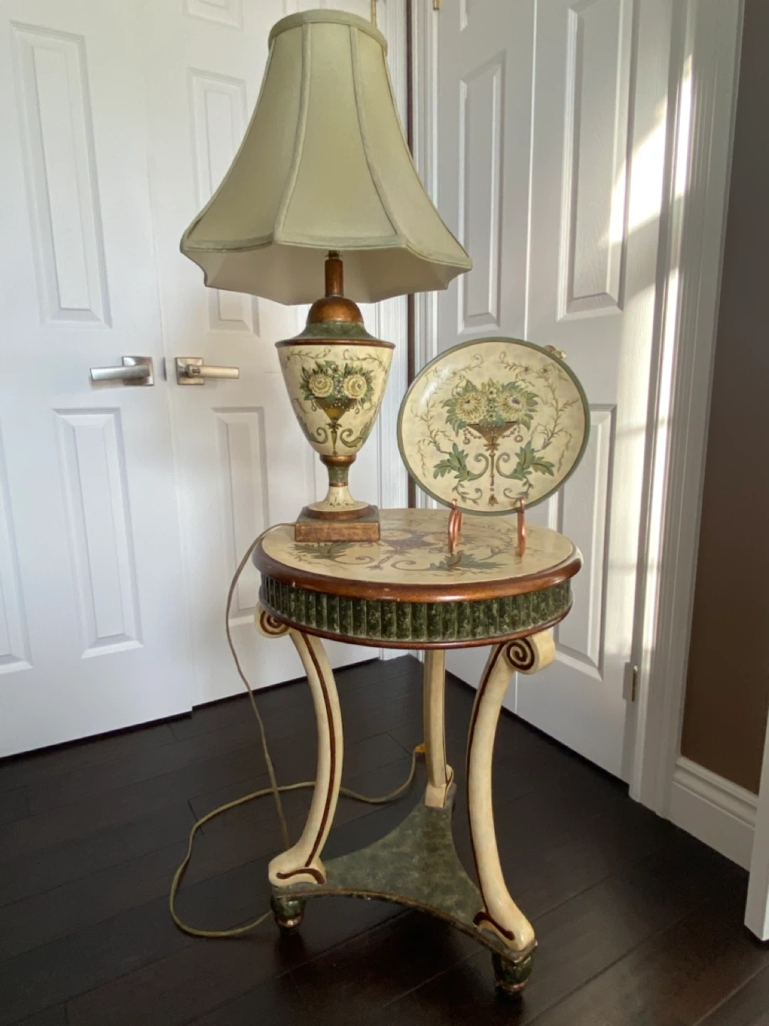 A charming decorative table lamp with a classic design. It features a painted floral motif on a cream and green base. A matching decorative plate is also included. This set would add a touch of elegance to any room!