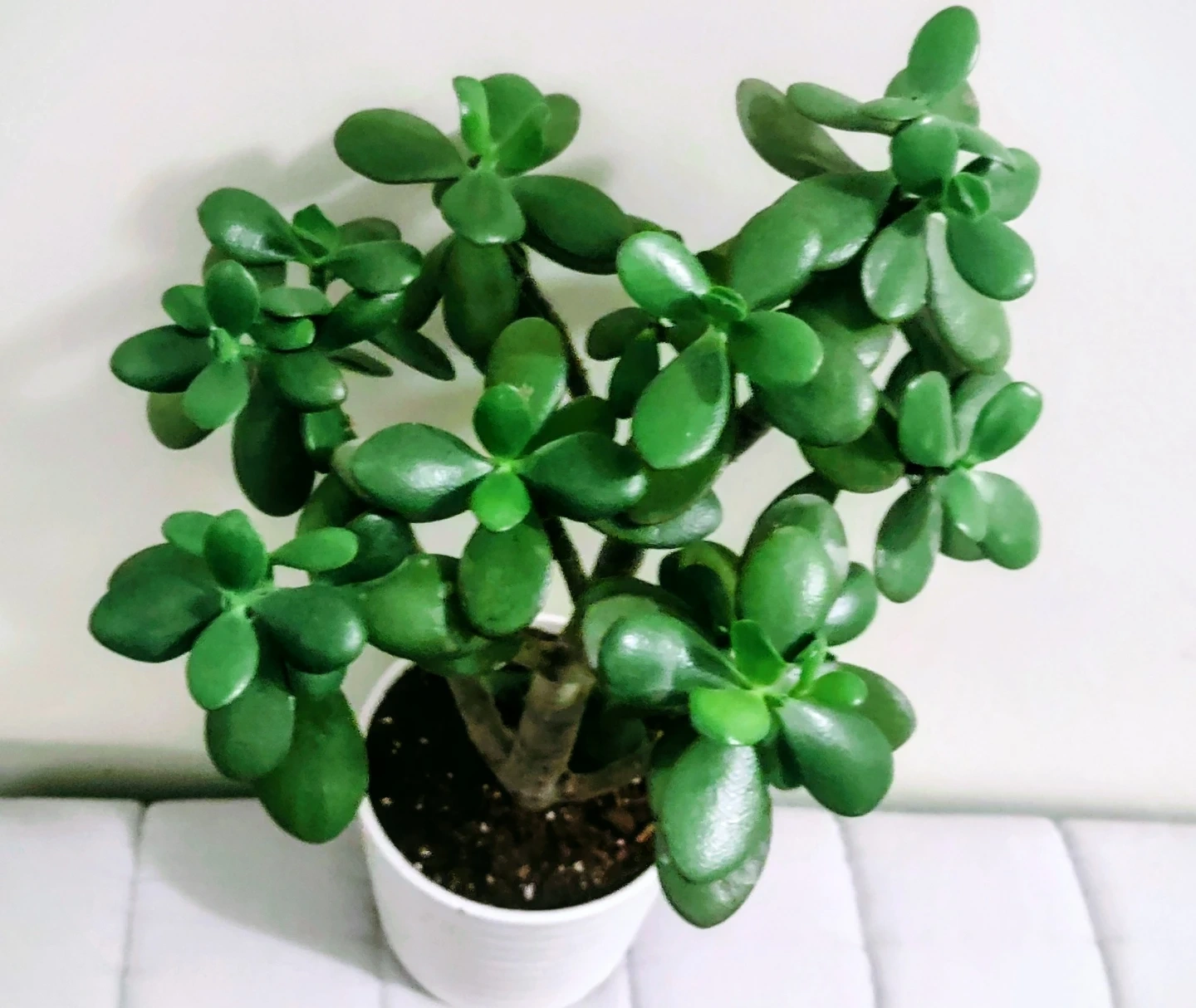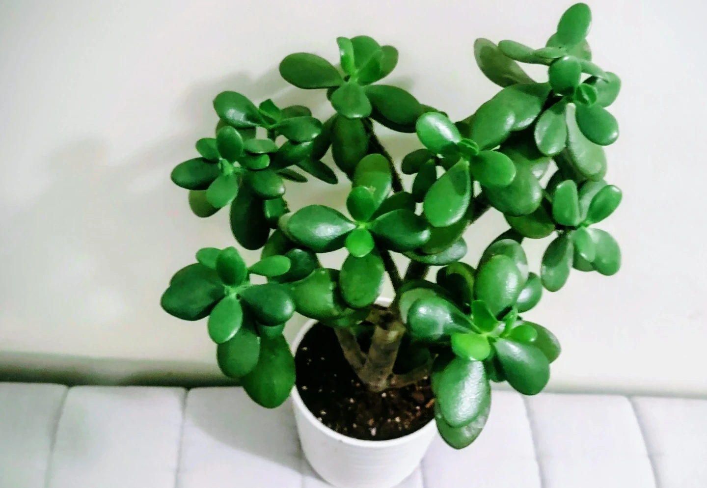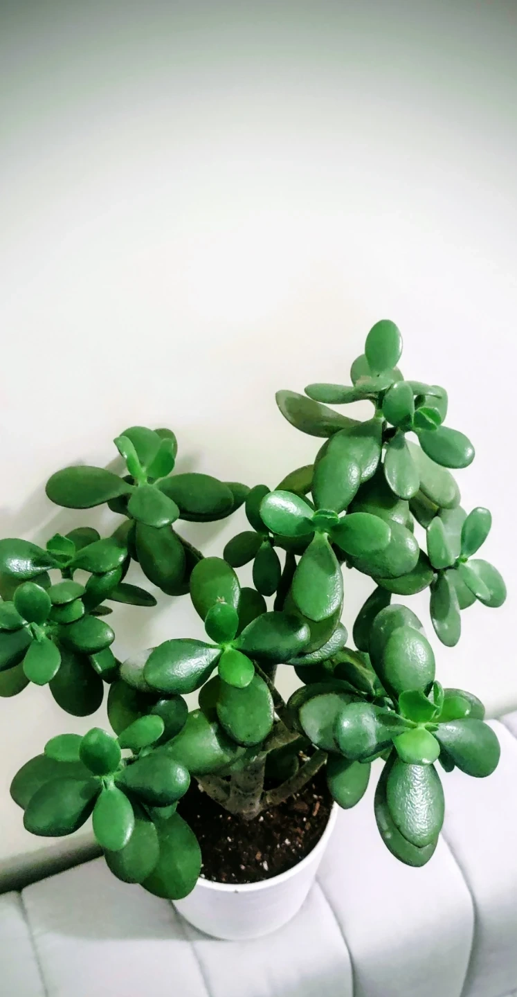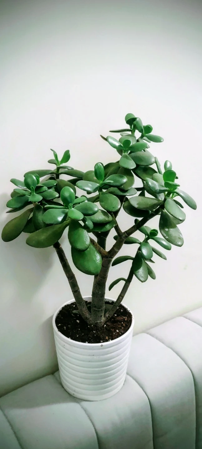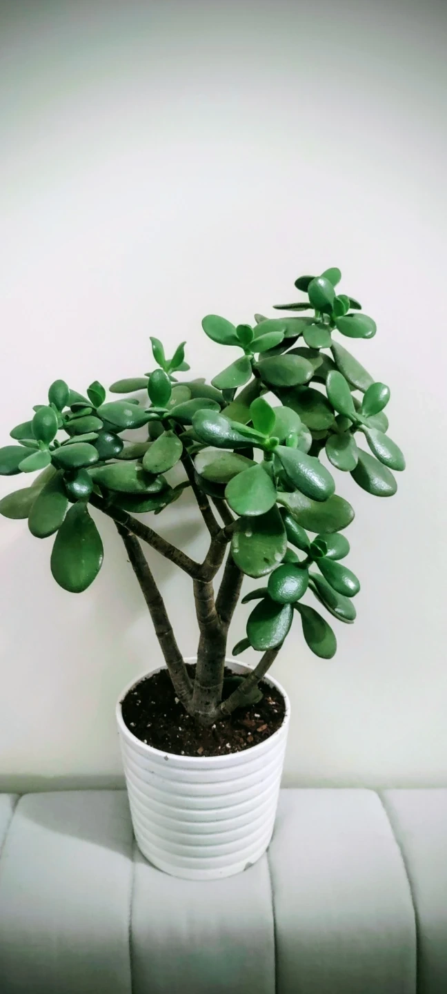 A lovely jade plant in a simple white pot, perfect for adding a touch of greenery to your space! It's healthy and thriving, ready to bring some good vibes to your home or office