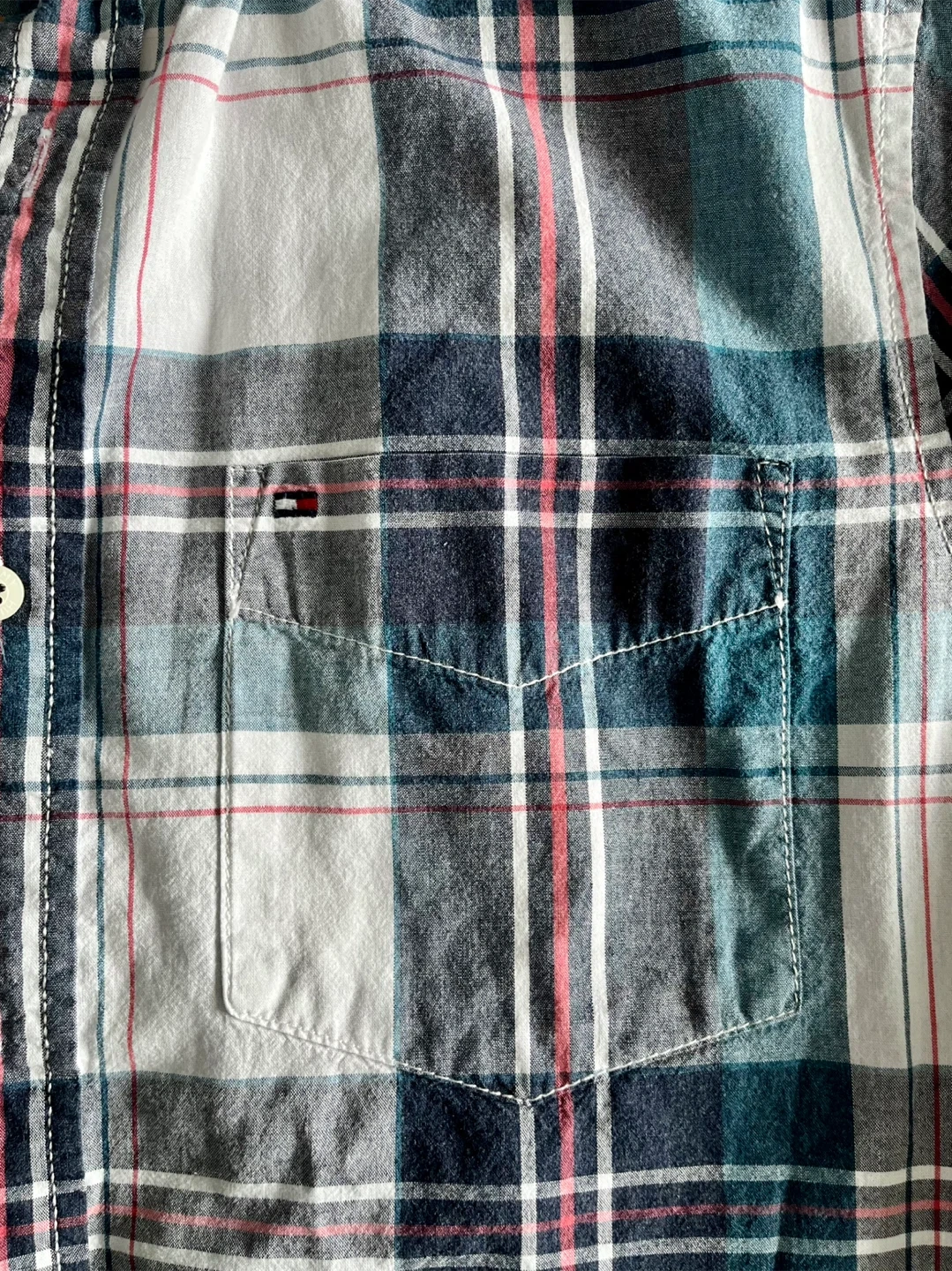 Tommy Hilfiger short sleeve button-up shirt in a custom fit. Features a classic plaid pattern with white, blue, green, and pink accents. It's made of comfortable fabric. This shirt is great for casual wear.