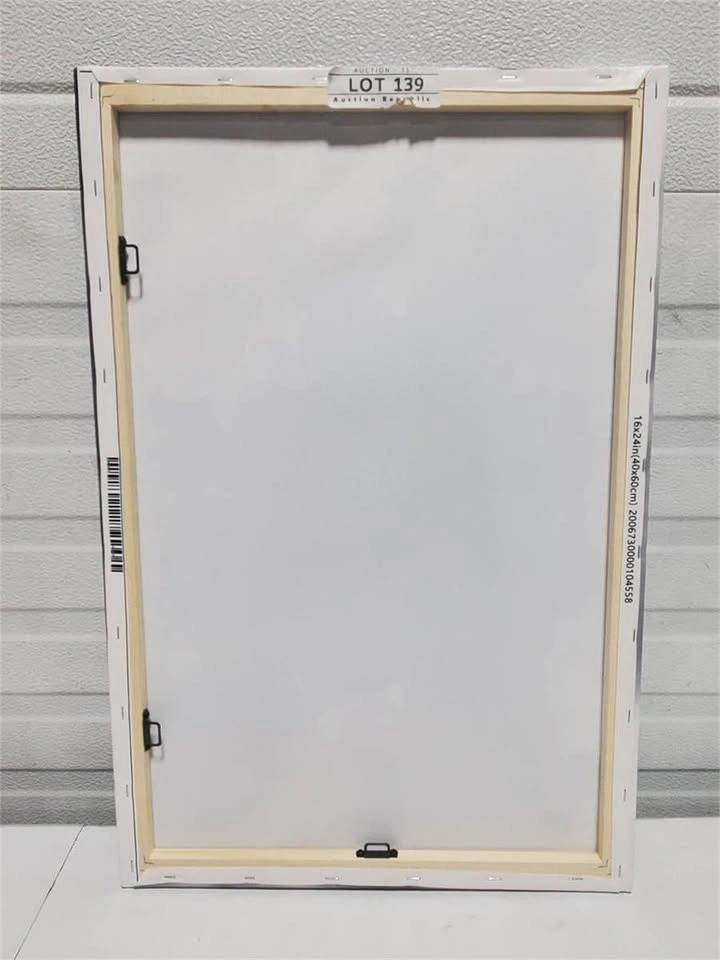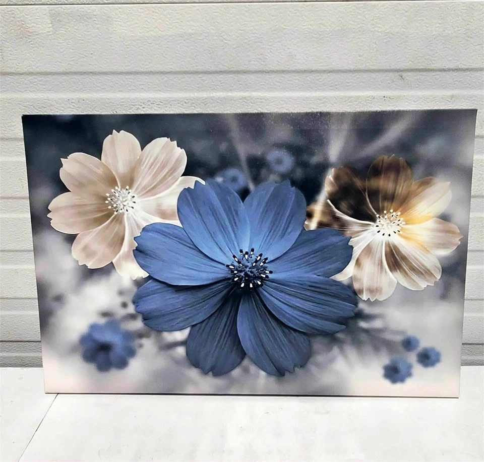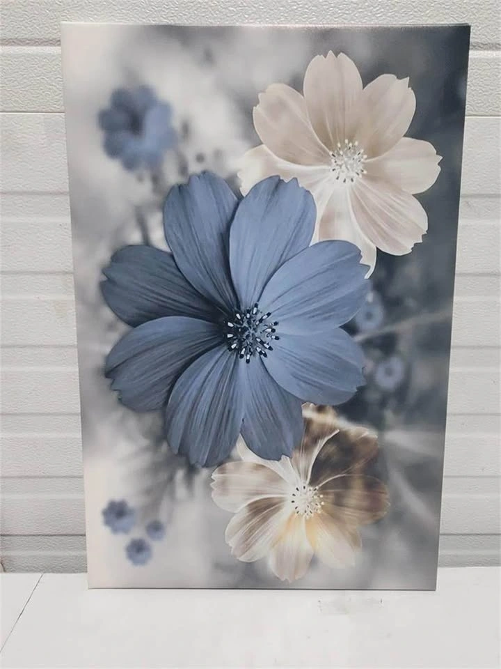 Brand new canvas wall art featuring a floral composition with blue and white blossoms against a soft, blurred background. Mounted on a wooden frame with dimensions of 16 x 24 inches.