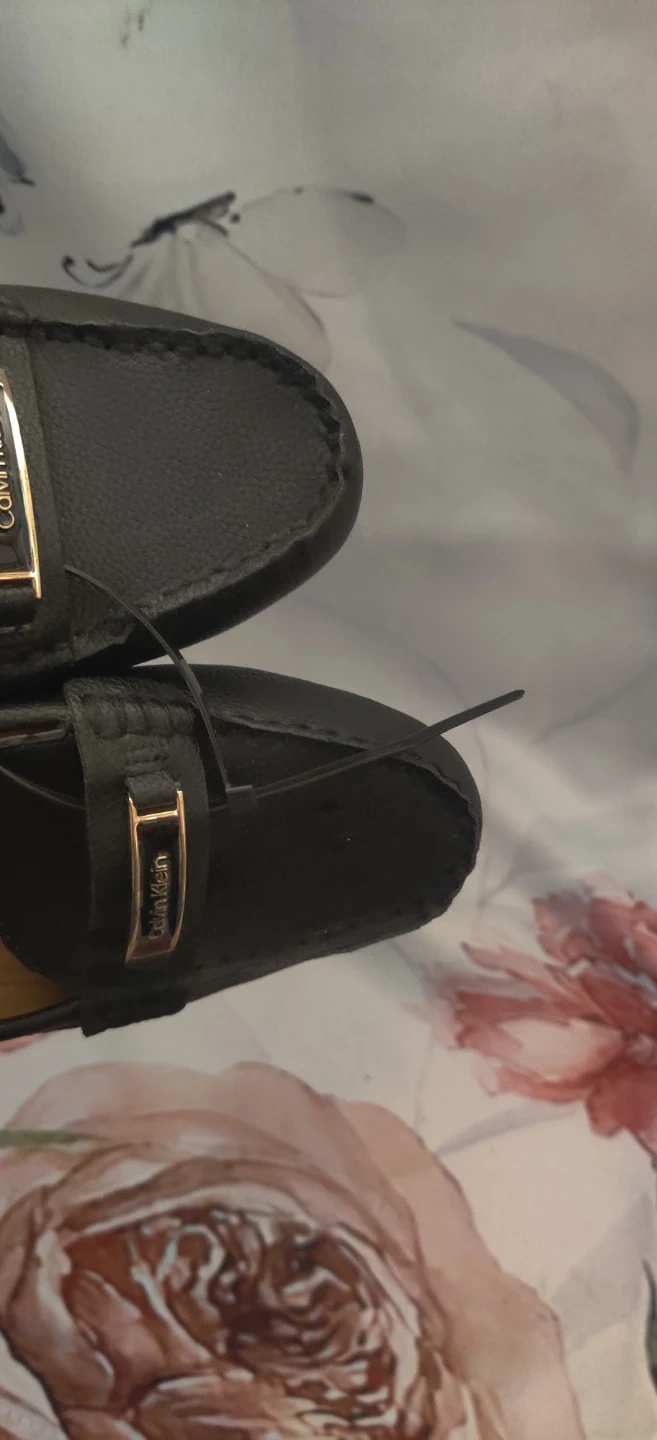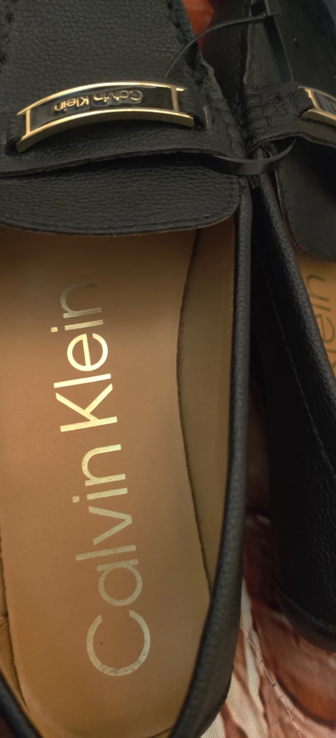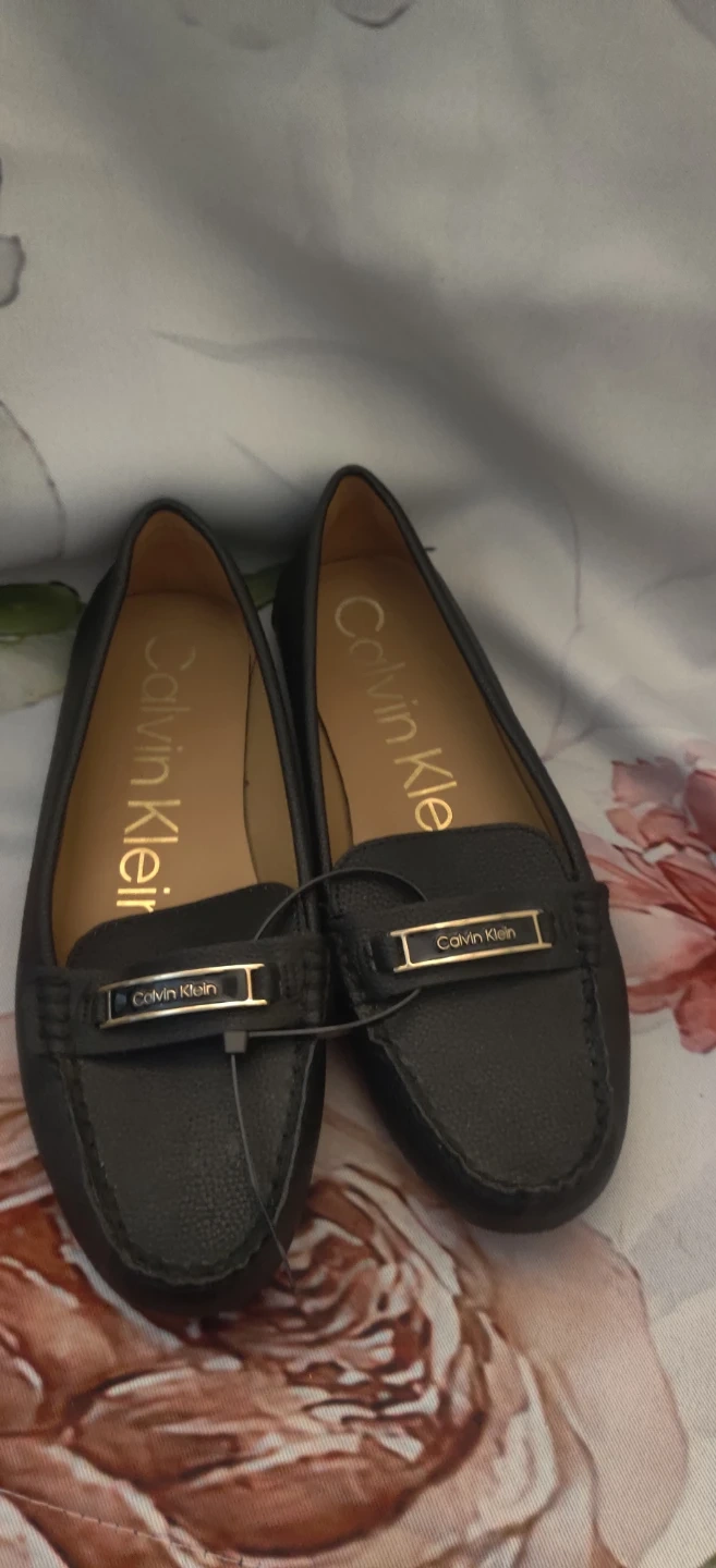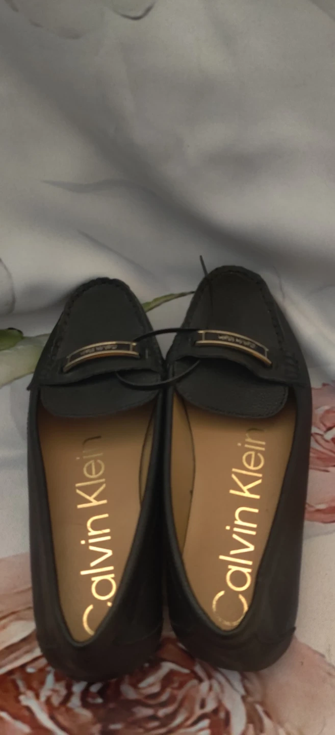 These are black Calvin Klein loafers. They appear to be made of faux leather. Easy to slip on for everyday wear!Worn once. Please look at the pics. Will reserve for only 7 days.