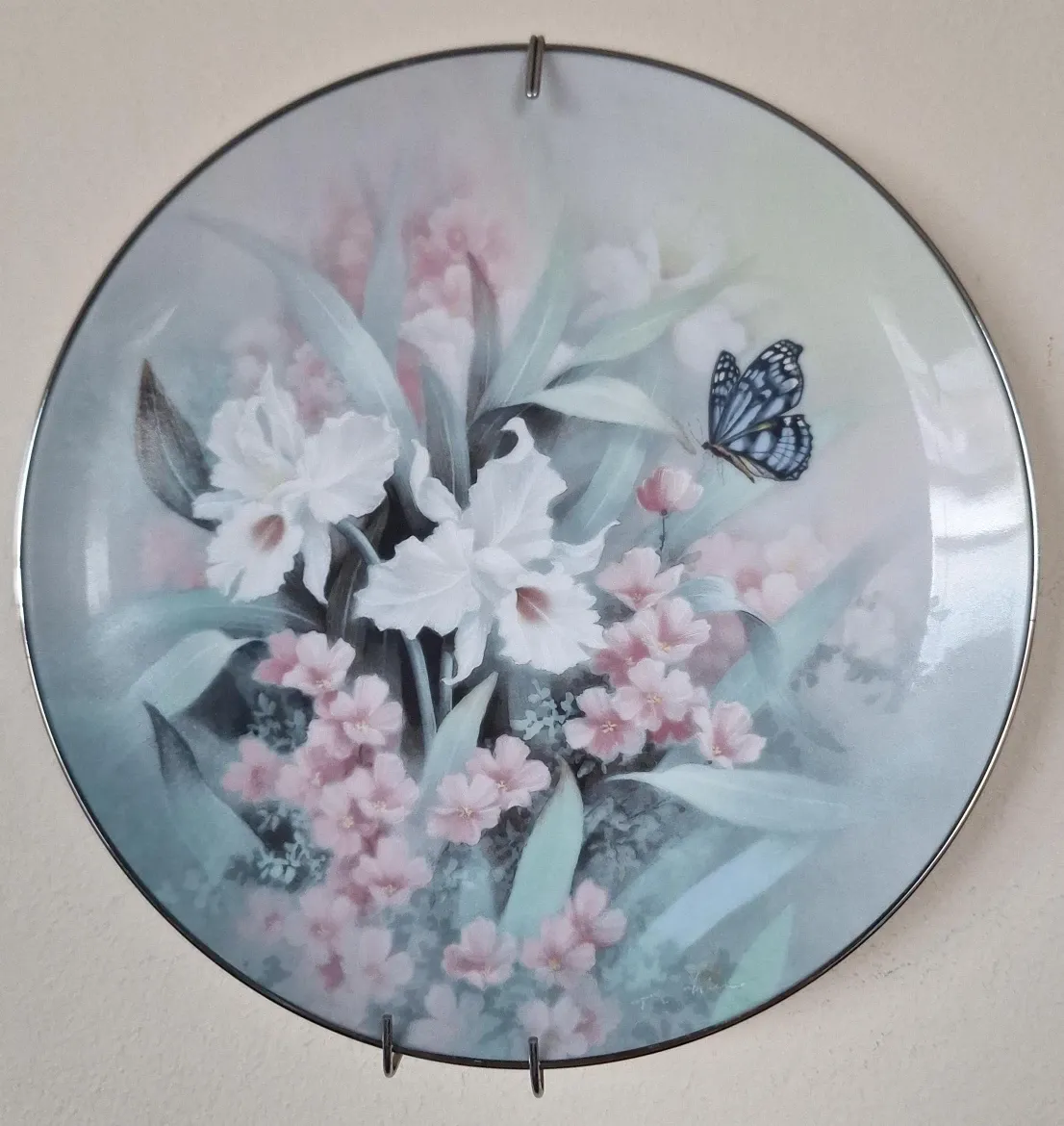This is a decorative collector's plate featuring a beautiful floral arrangement with white orchids and pink flowers, accented by a blue butterfly. It has a metallic rim. This plate is perfect for display on a wall or shelf. 8 1/2 inches
