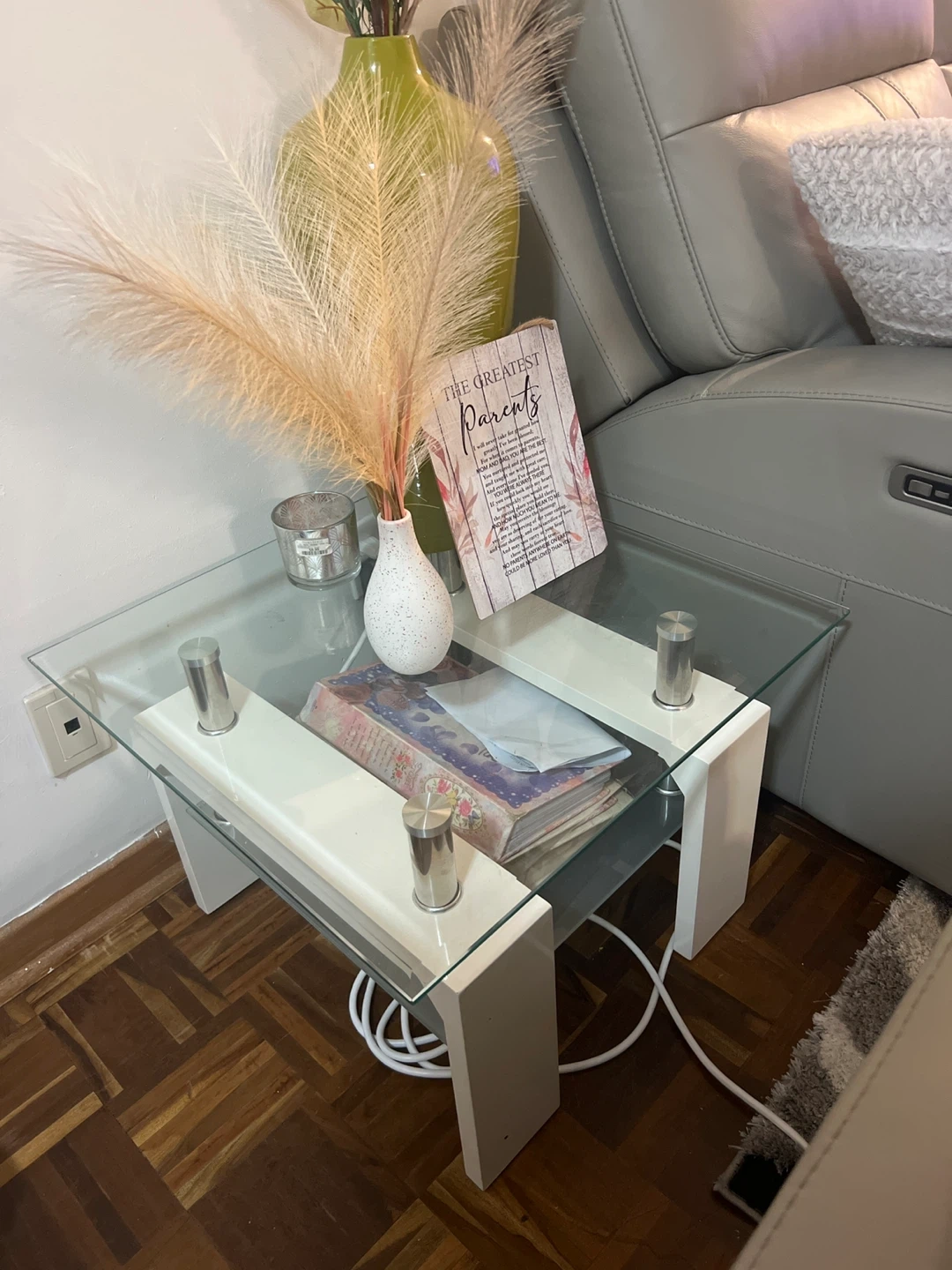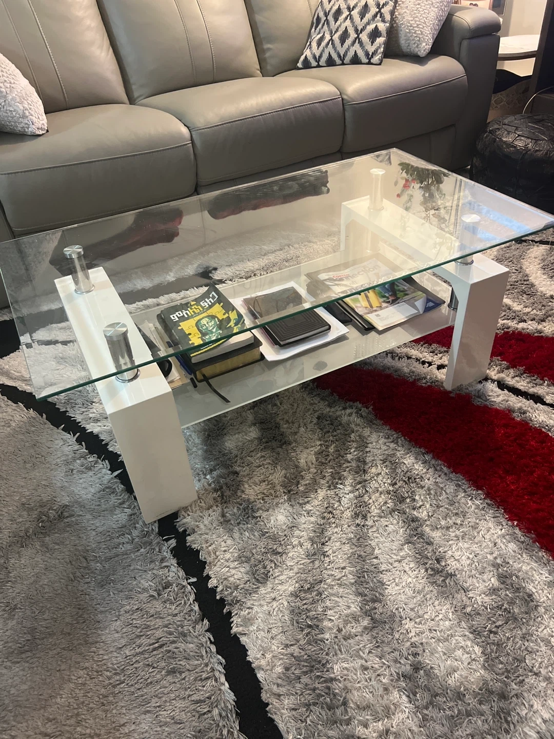 This table and coffee table features a sleek design with a clear glass top and a white base. It has a lower shelf for extra storage. It's perfect for a modern living room setting.
