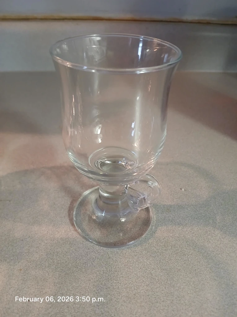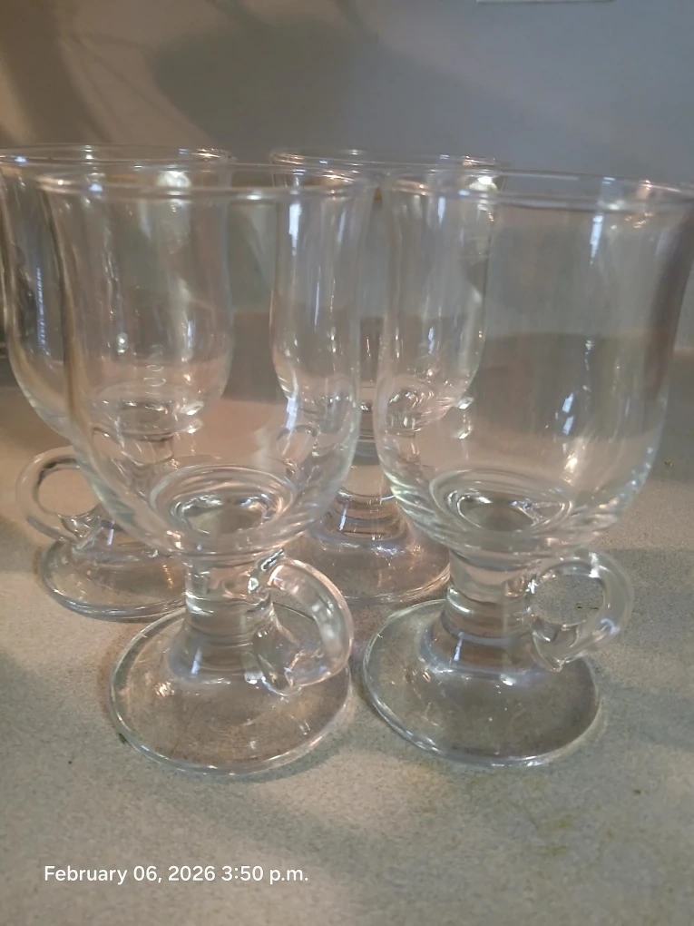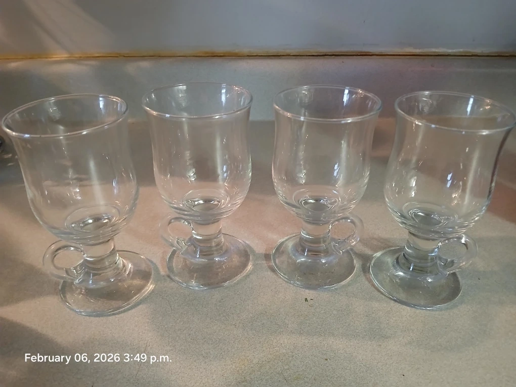 Four clear glass mugs with a footed base and small handles. These glasses are perfect for serving hot beverages like coffee, tea, or mulled wine. Glass construction.π