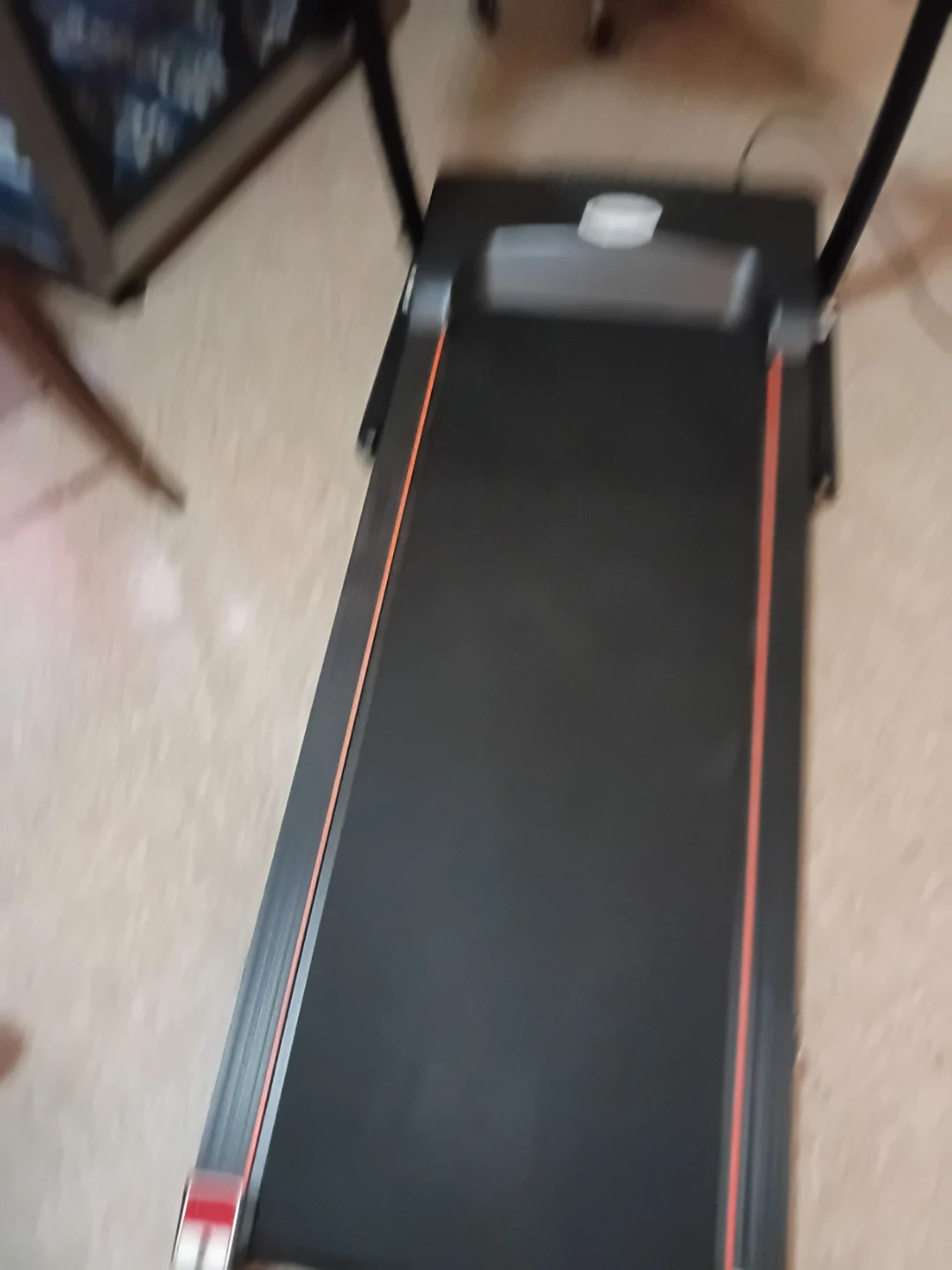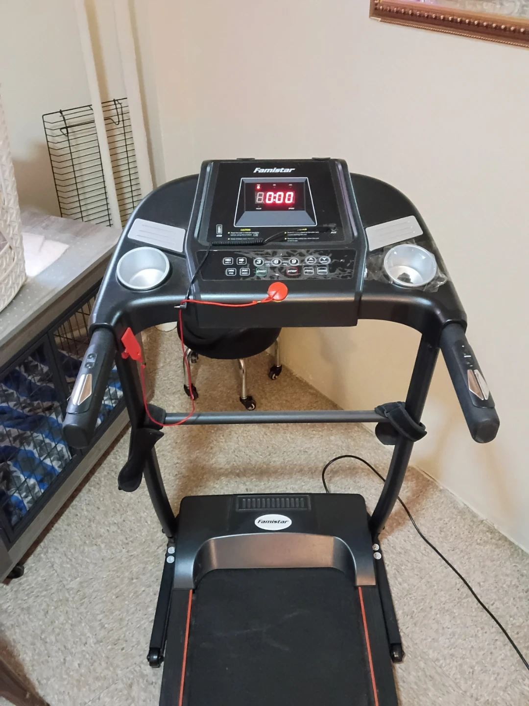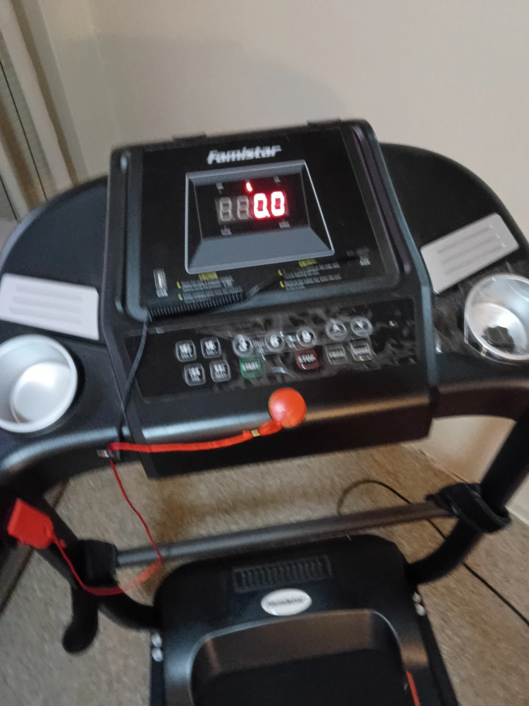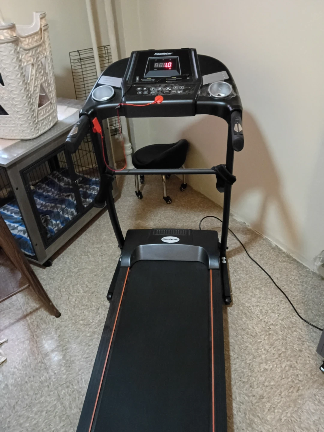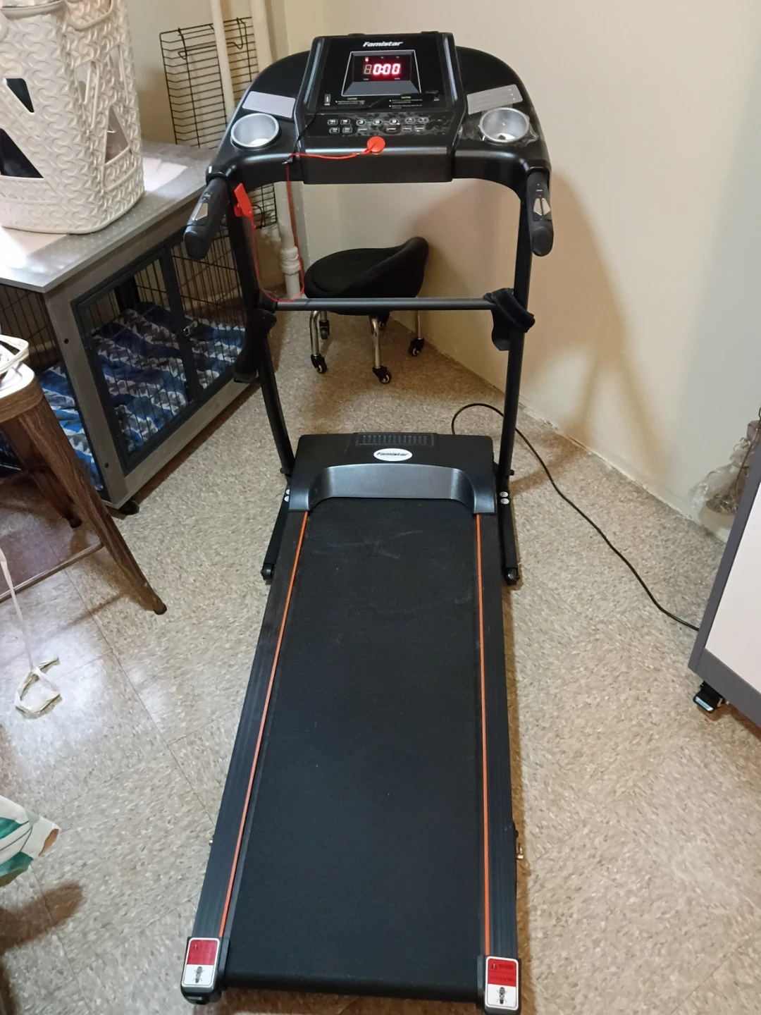 This is a Famistar treadmill. It's a black treadmill with orange trim on the belt. It features a digital display for tracking workouts.