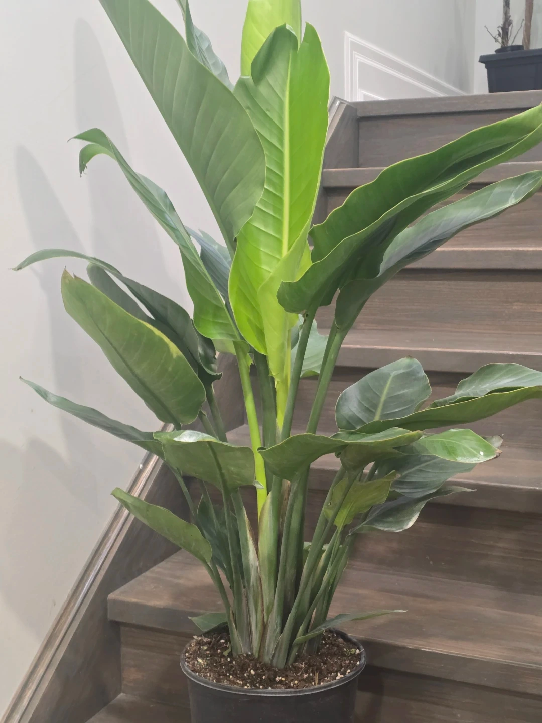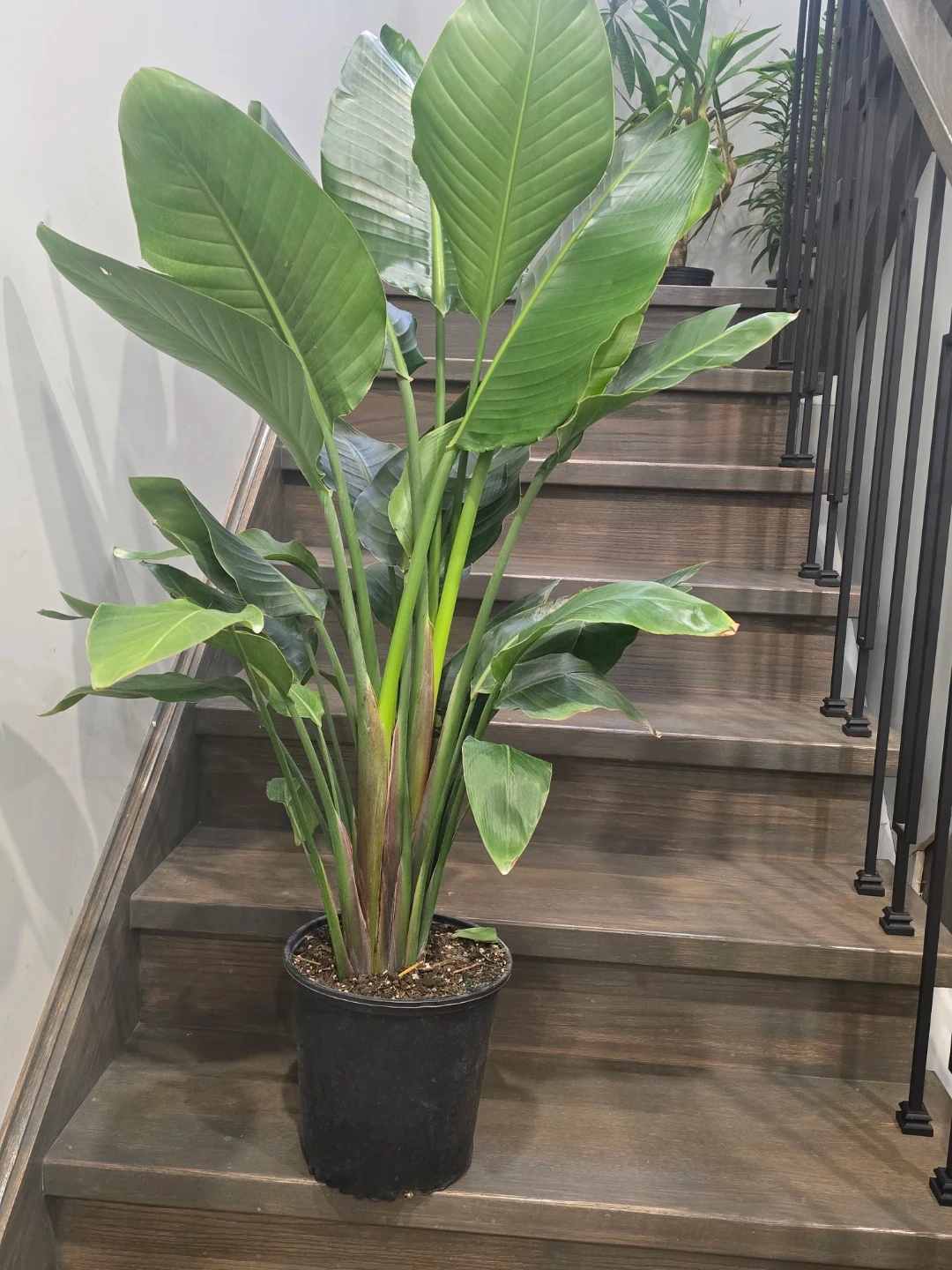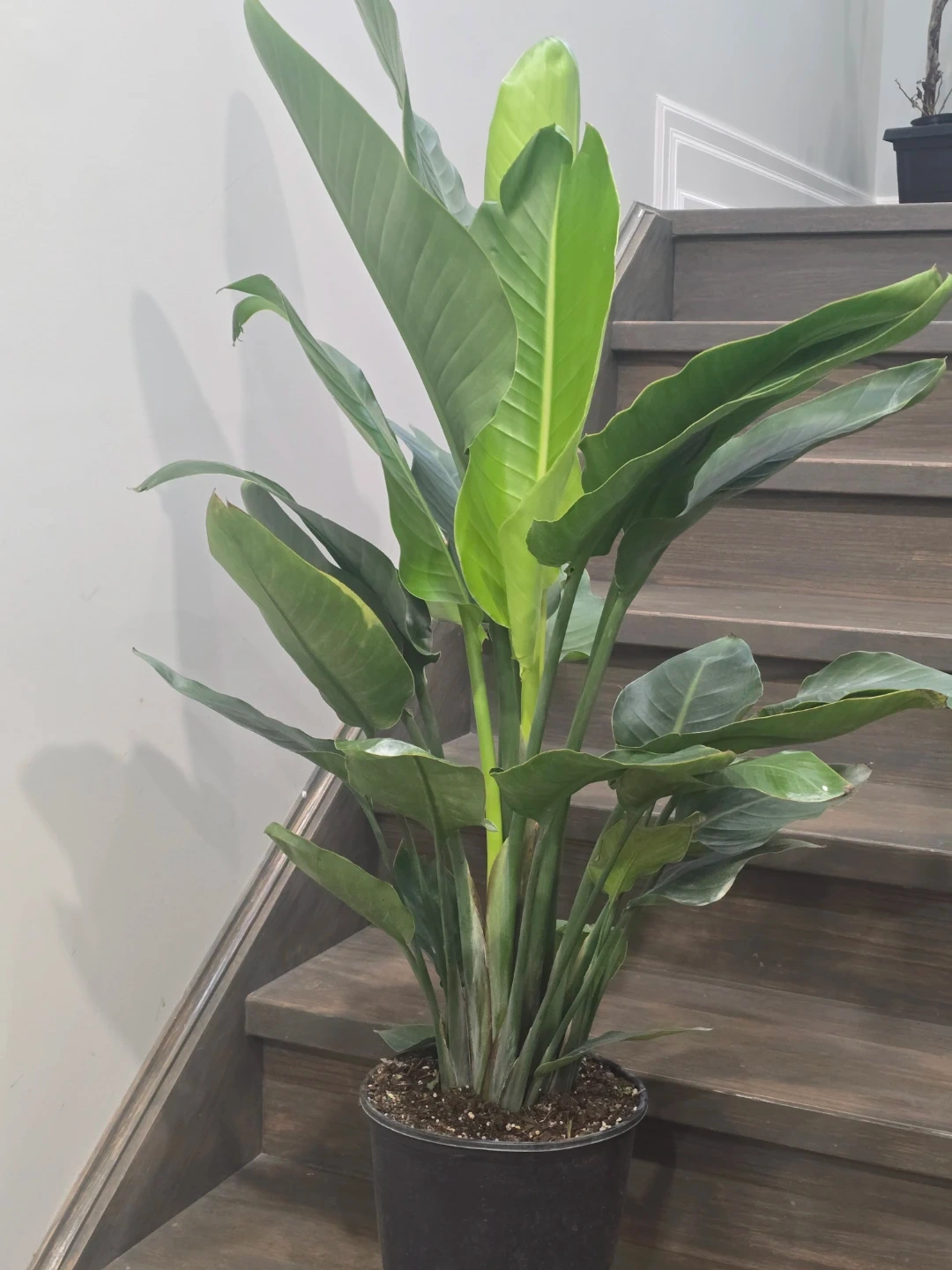 A lovely Bird of Paradise plant in a black pot. It's a healthy houseplant with large green leaves. This plant adds a tropical feel to any space!