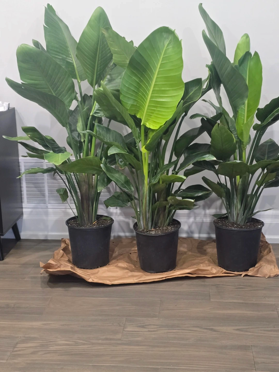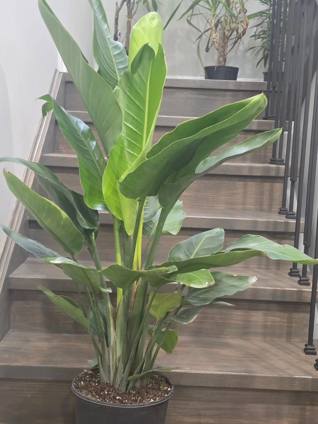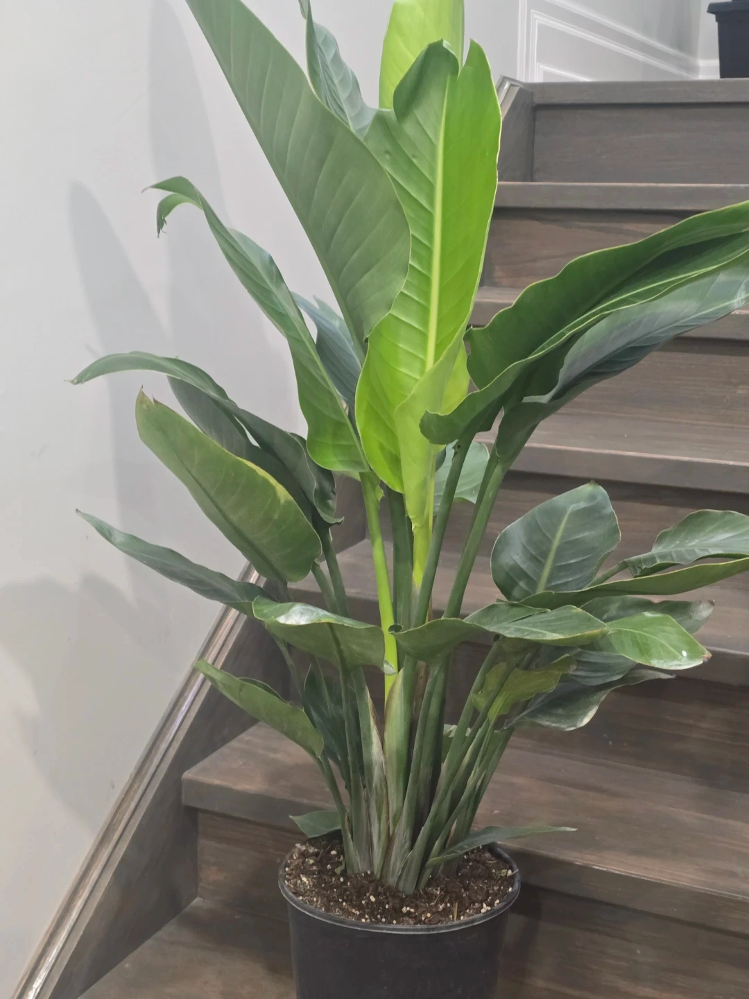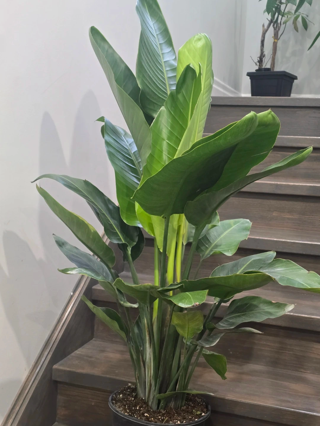 A lovely Bird of Paradise plant in a black pot. It's a healthy houseplant with large green leaves. This plant adds a tropical feel to any space!