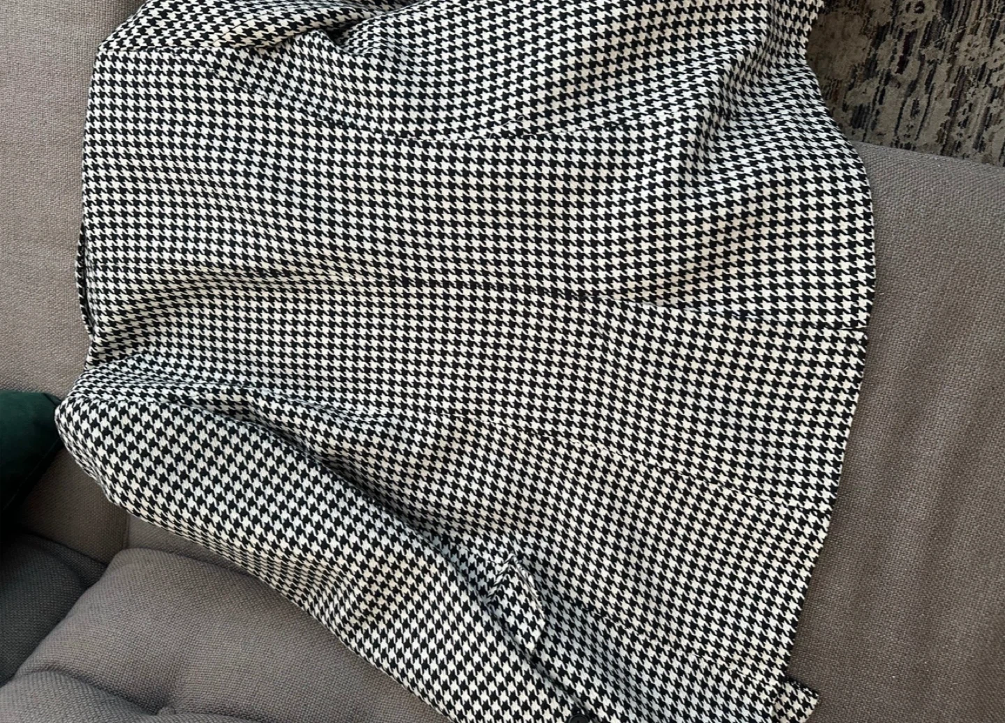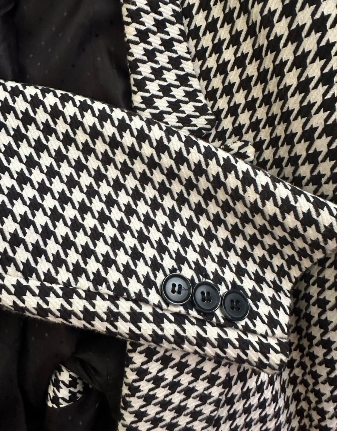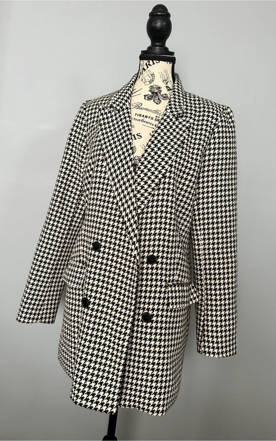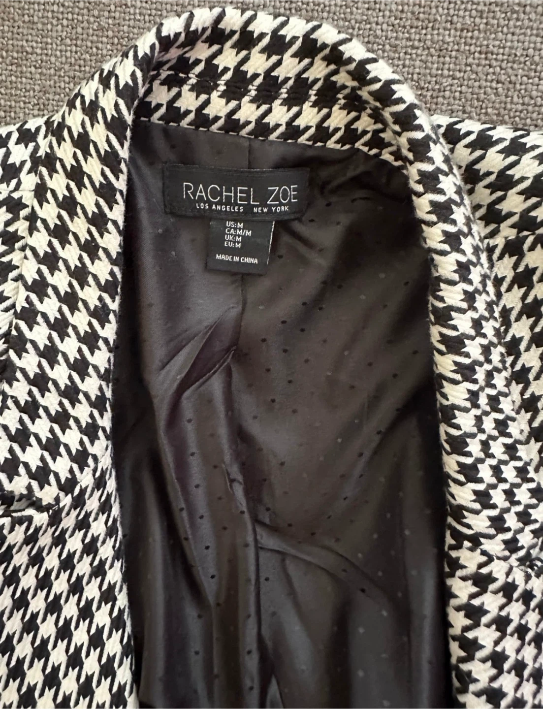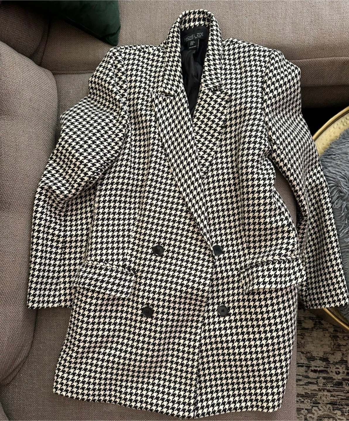 Selling a Rachel Zoe blazer in a classic houndstooth pattern! It's a size medium and has a double-breasted style with black buttons. The material is comfortable and perfect for layering