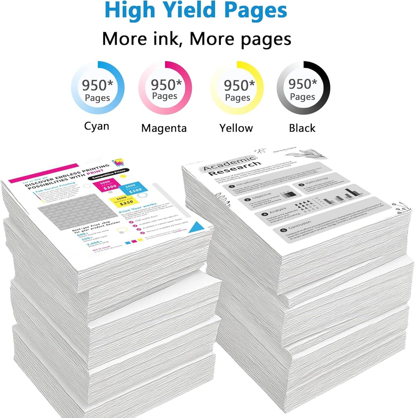 This pack contains black, cyan, magenta, and yellow cartridges. Each cartridge is designed to print a high yield of pages, ensuring you get more ink and more pages per cartridge.