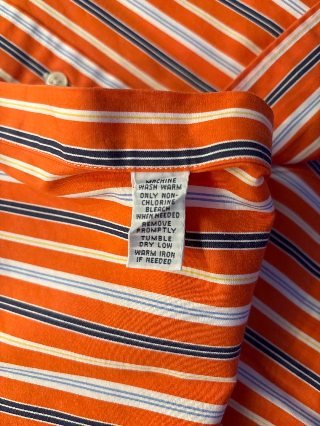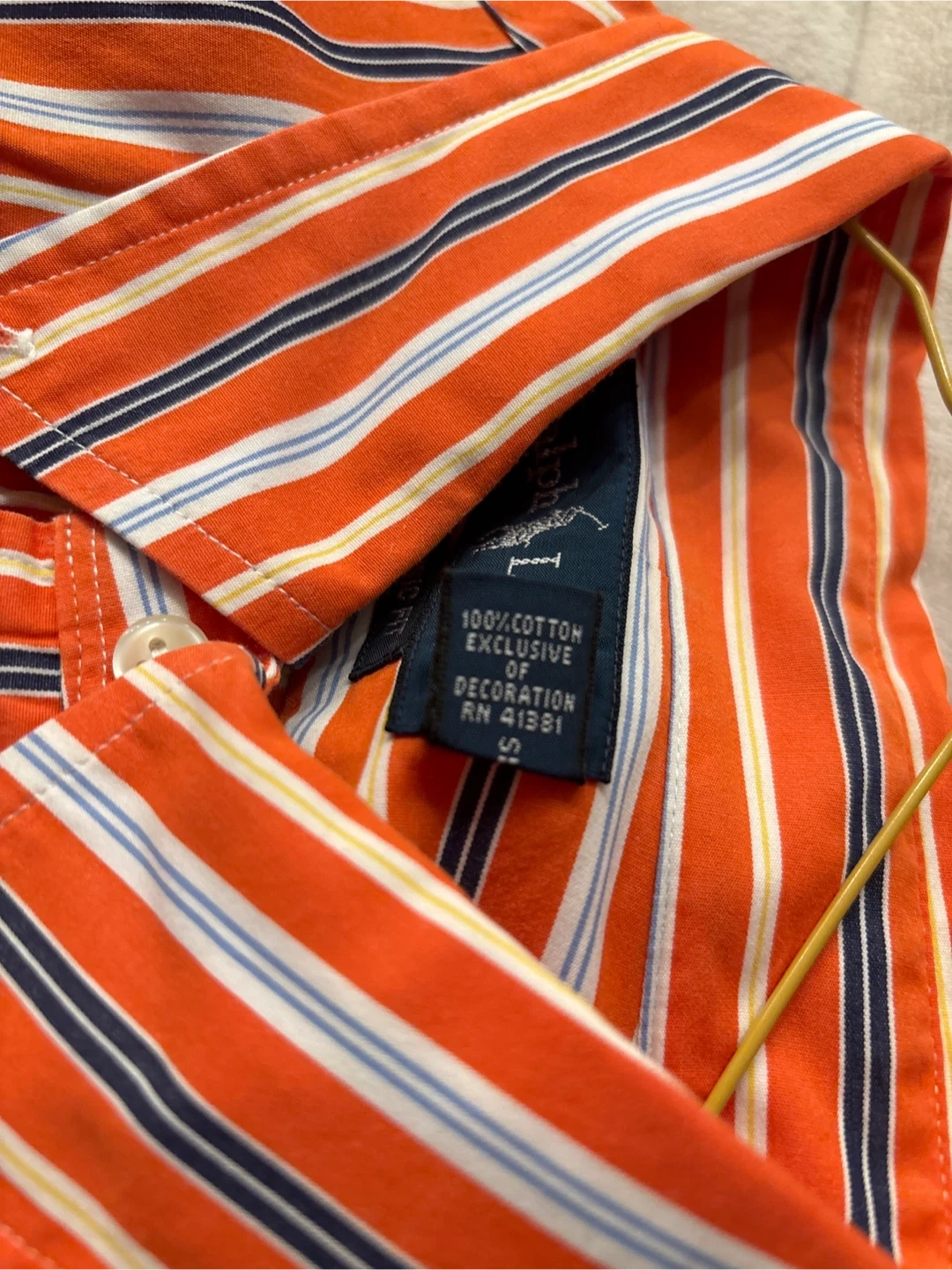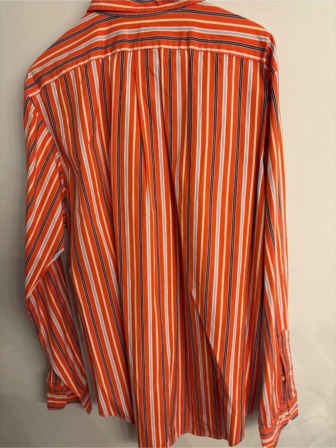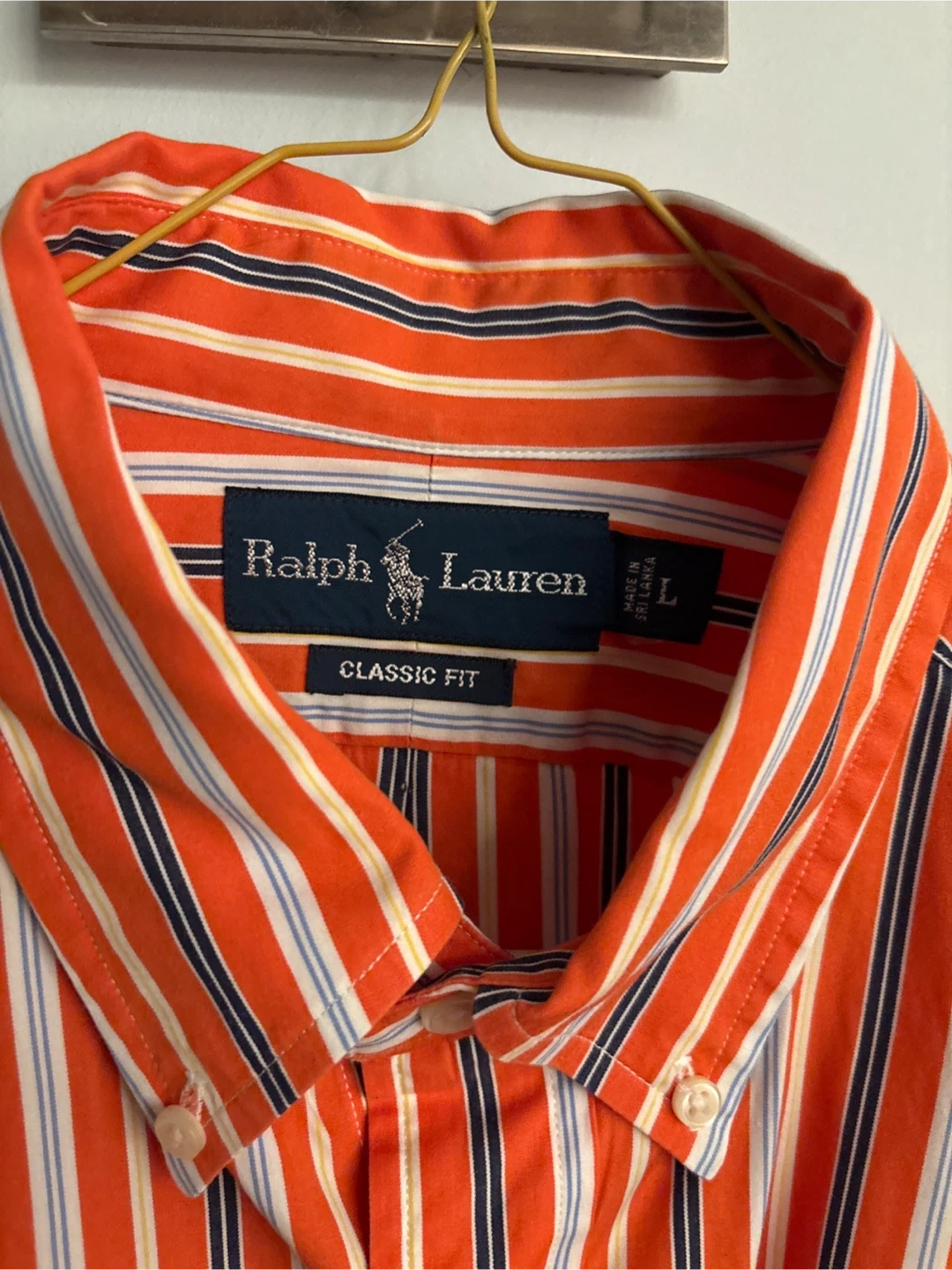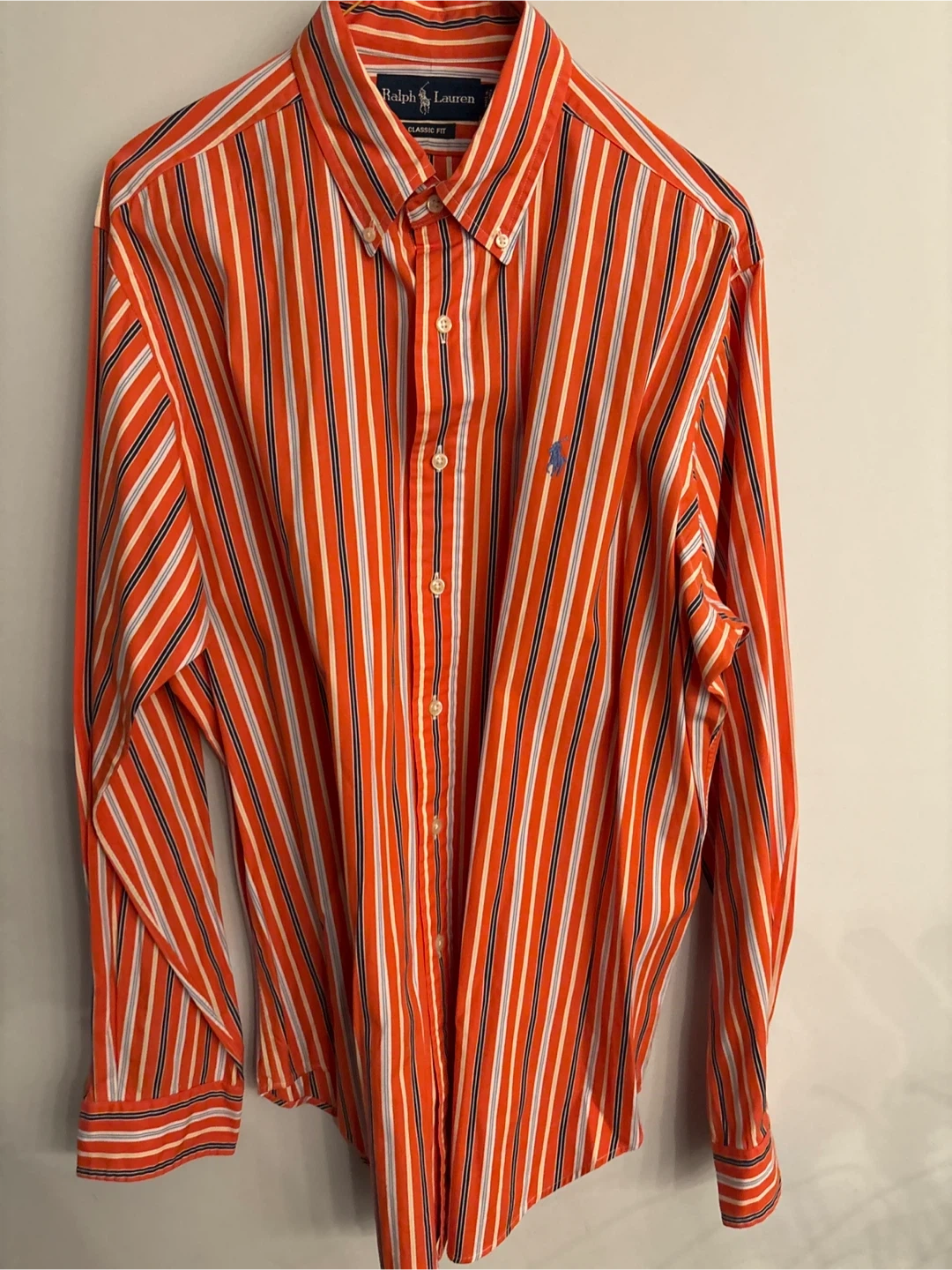 Selling a Ralph Lauren classic fit shirt in size L. It features an orange and white striped pattern with blue accents. Perfect for a casual or semi-formal look! 100% cotton. Comes from smoke and pet free home.