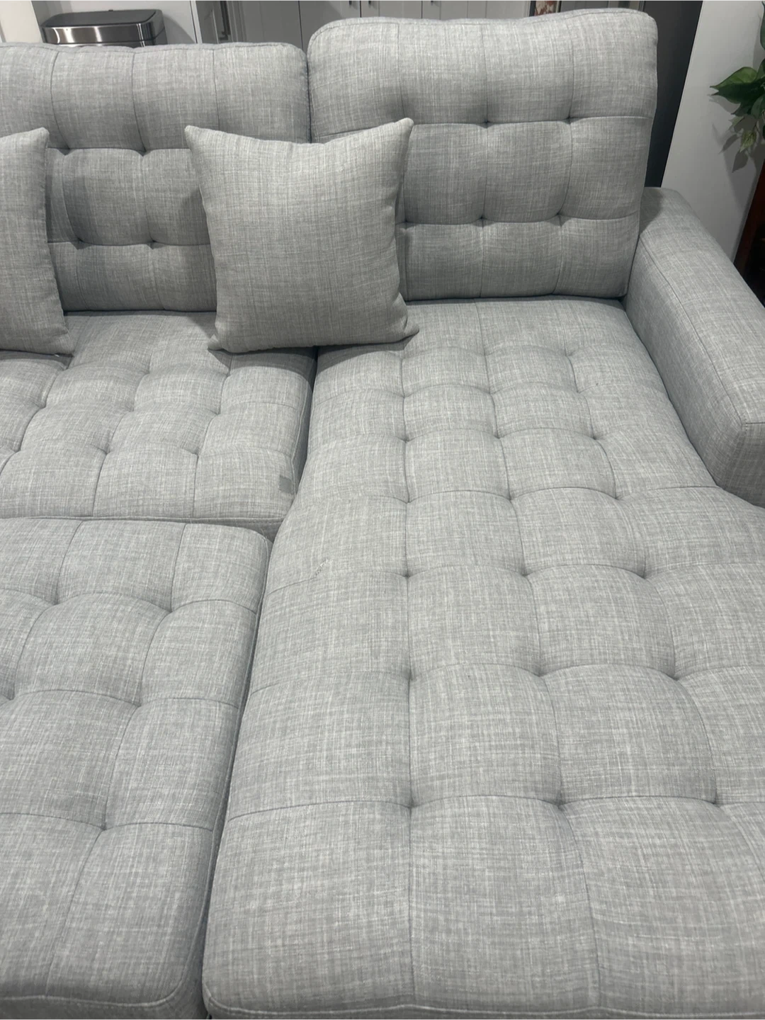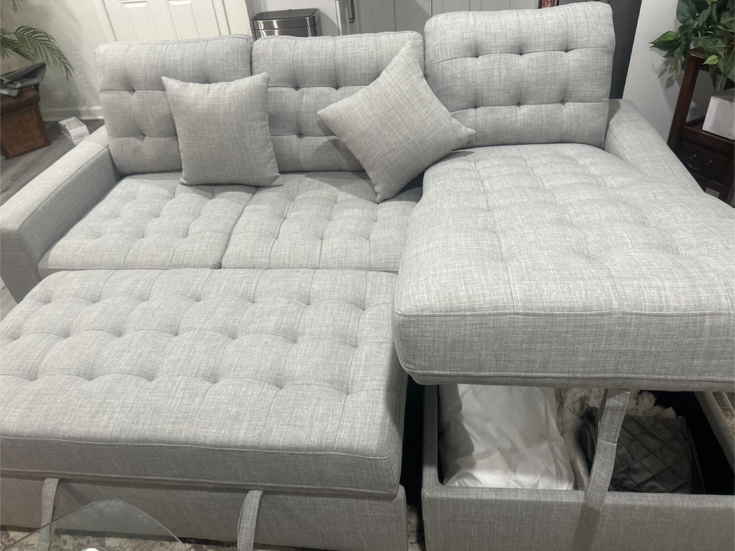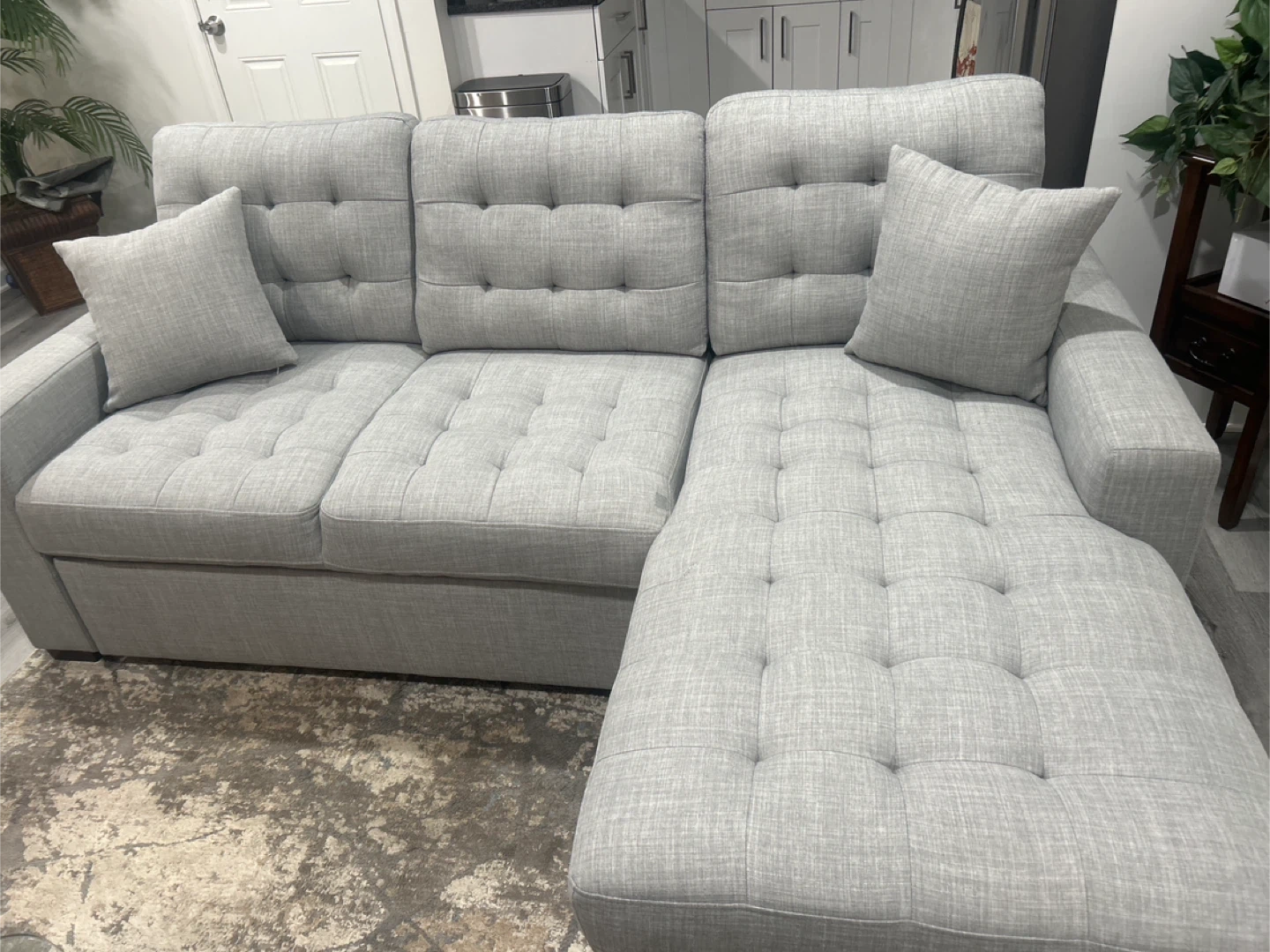 Selling a comfortable gray sectional sofa from Raymour & Flanigan only 3 months of use, that includes an ottoman. It become a queen size bed. It features a tufted design and comes with throw pillows. The ottoman also has storage space underneath. It's in great condition!