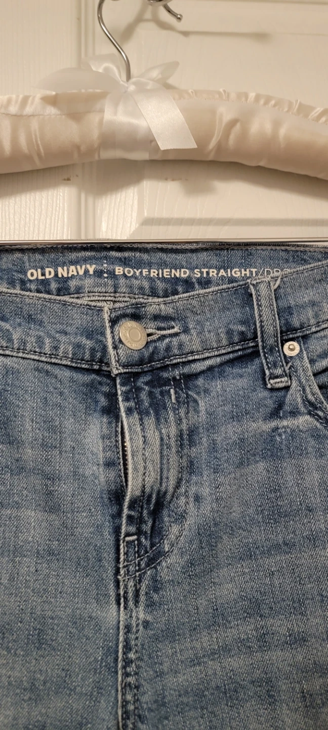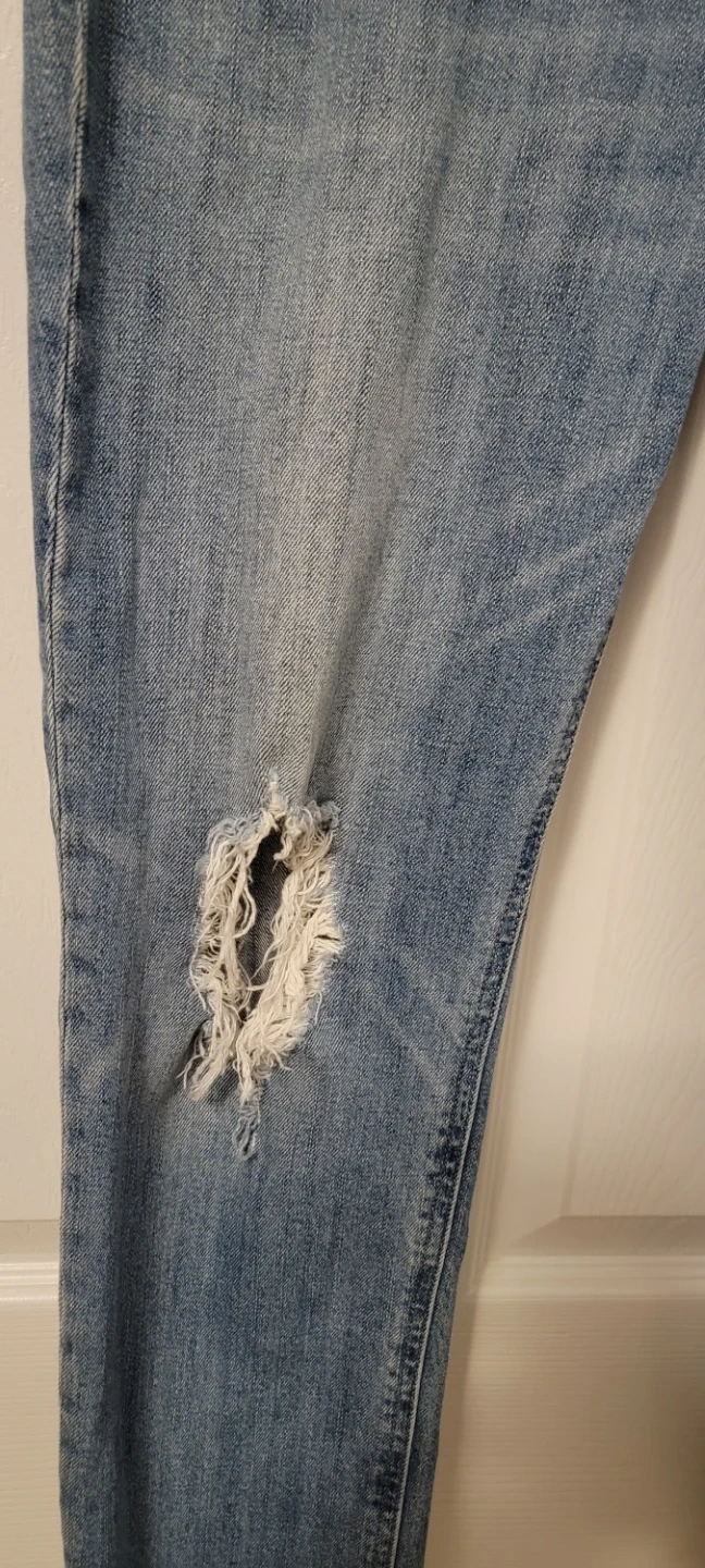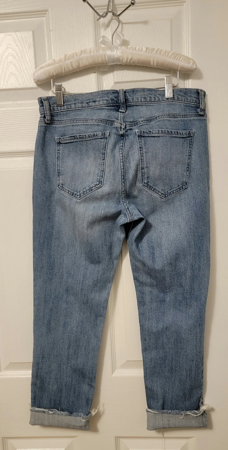 These are light wash denim boyfriend straight jeans. They've got ripped detailing on the front. The hem is cuffed.
