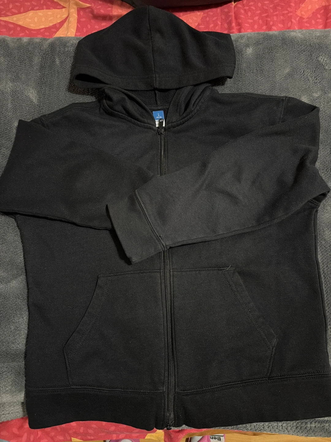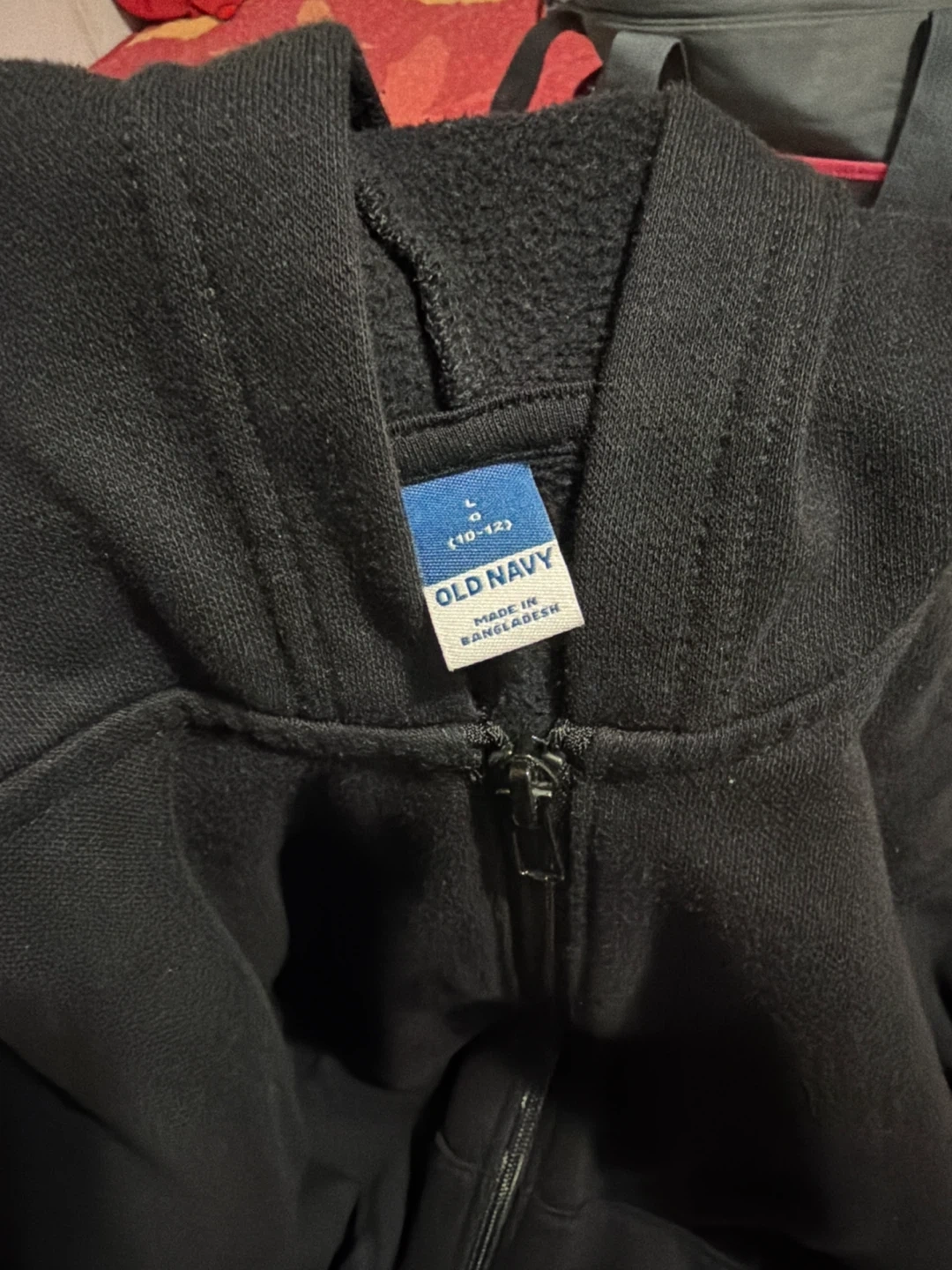 This is a black zip-up hoodie from Old Navy. It's a size L, fitting kids' sizes 10-12. It's made with a soft material, perfect for everyday wear.