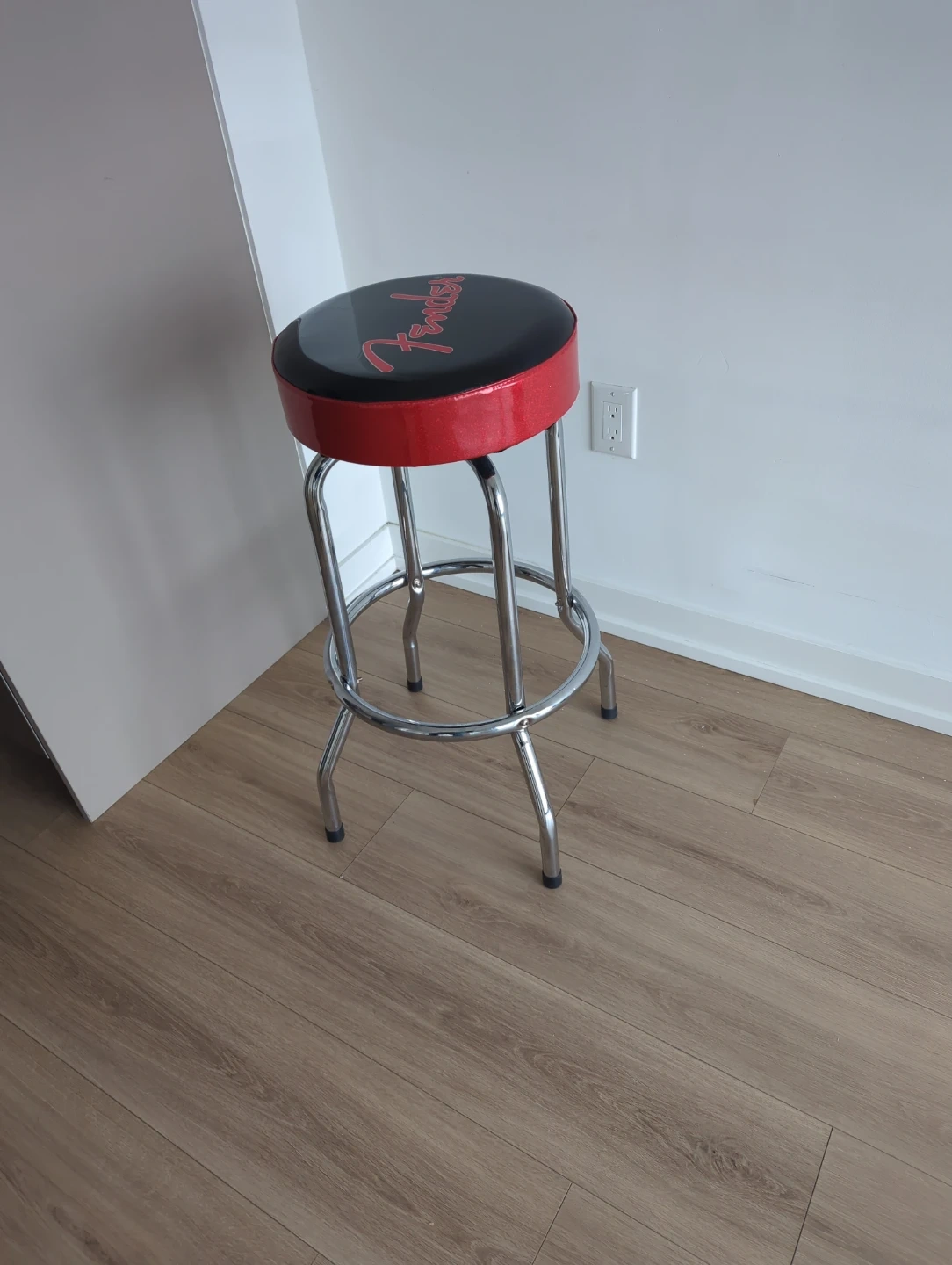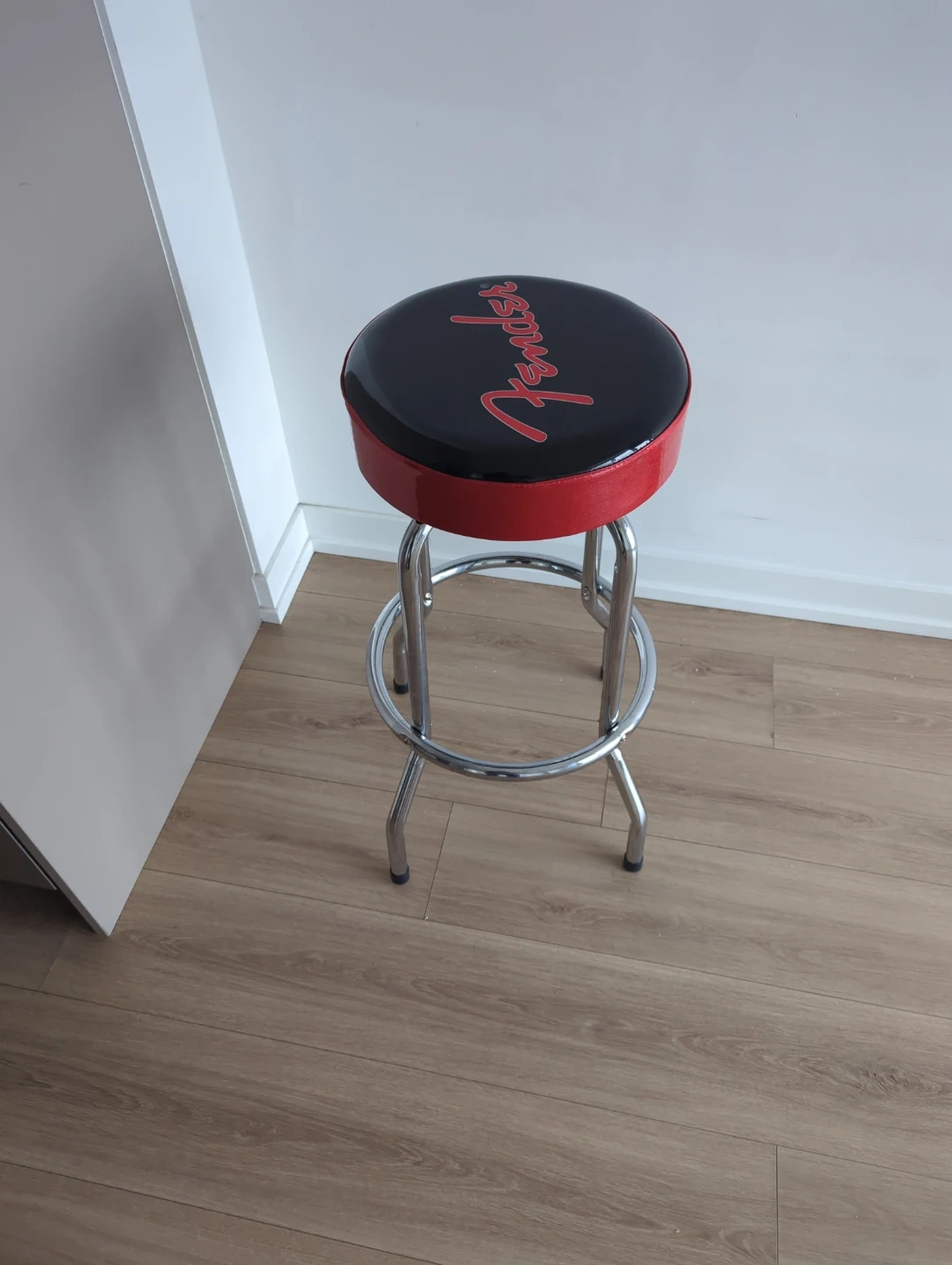 This is a Fender bar stool. It features a chrome base and a red and black padded seat with the Fender logo. It's a great addition to any music room or garage!