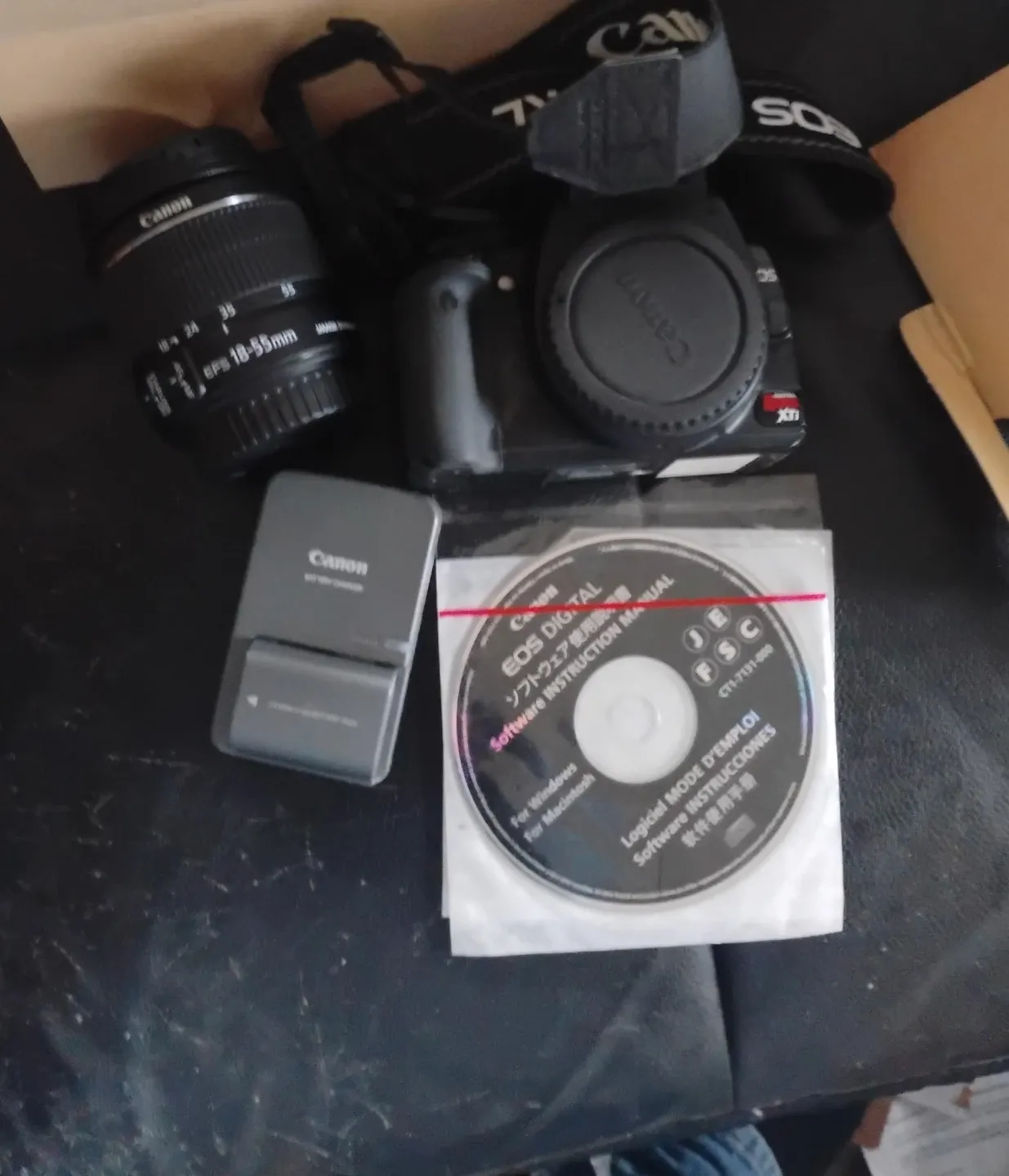 This is a Canon EOS Digital Rebel XTi DSLR camera with an 18-55mm lens. It comes with a battery charger, software instruction manual on CD & in box. This camera is suitable for photography enthusiasts looking to upgrade their gear.