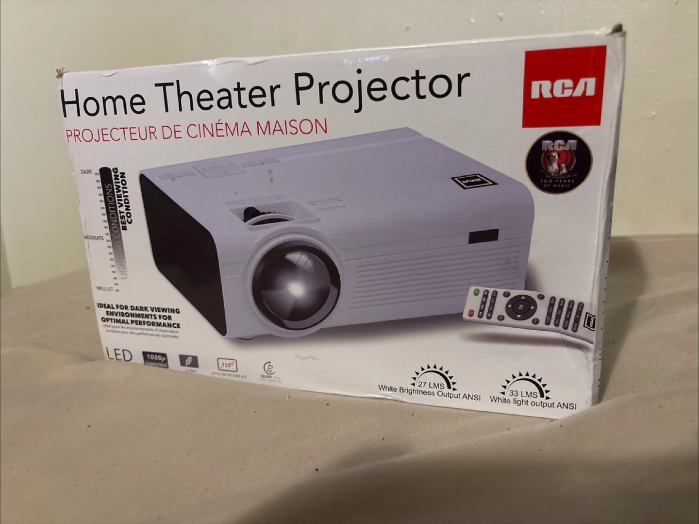 Selling an RCA Home Theater Projector that's practically brand new! It's ideal for dark viewing environments, perfect for setting up your own cinema at home. Key features include: - LED lamp - 1080p supported - Up to 150" picture size - 27 LMS White Brightness Output ANSI - 33 LMS White light output ANSI Comes with the original box and remote control