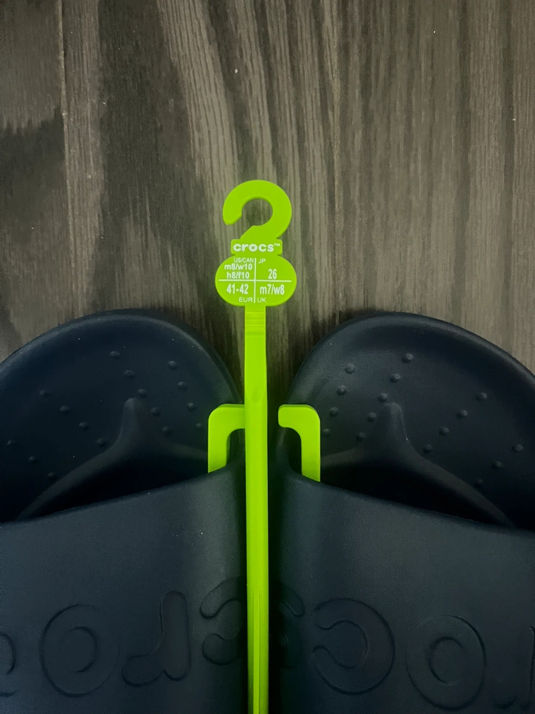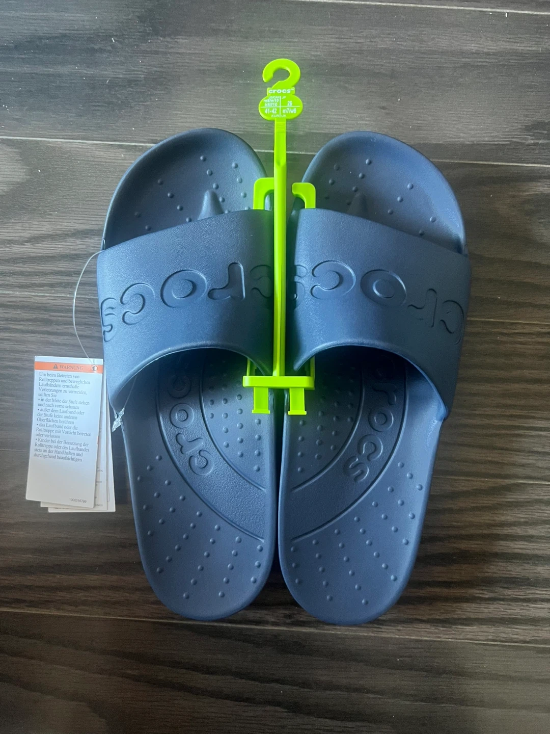 Selling a brand new pair of Crocs slides! They are a men's size 8 and women's size 10. The colour is a nice navy blue and they are still in the original packaging