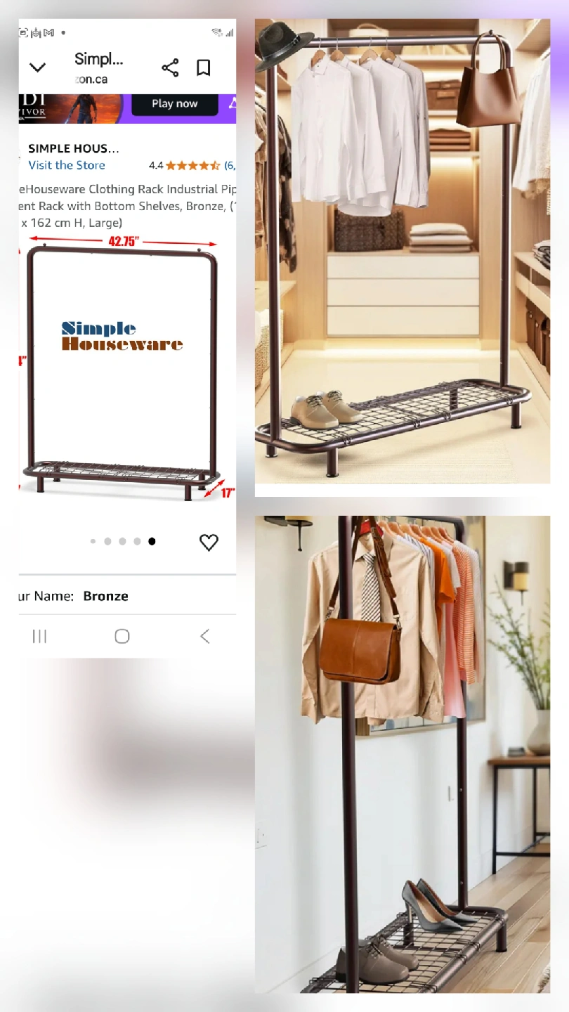Selling a BRAND NEW Simple Houseware clothing rack in bronze. It's an industrial pipe garment rack with bottom shelves. Dimensions are approximately 108 cm W x 162 cm H. Great for extra storage!NEVER USED.