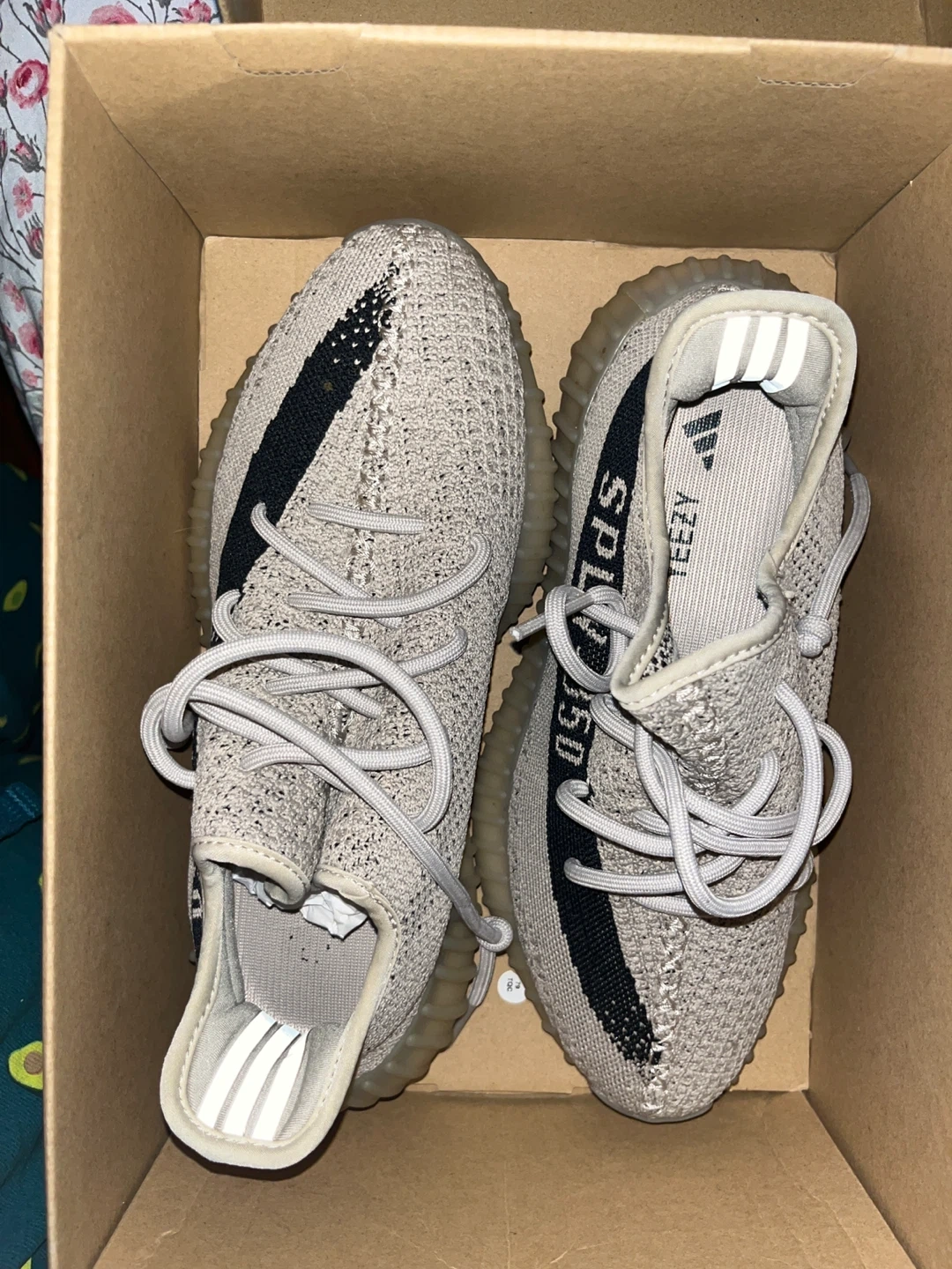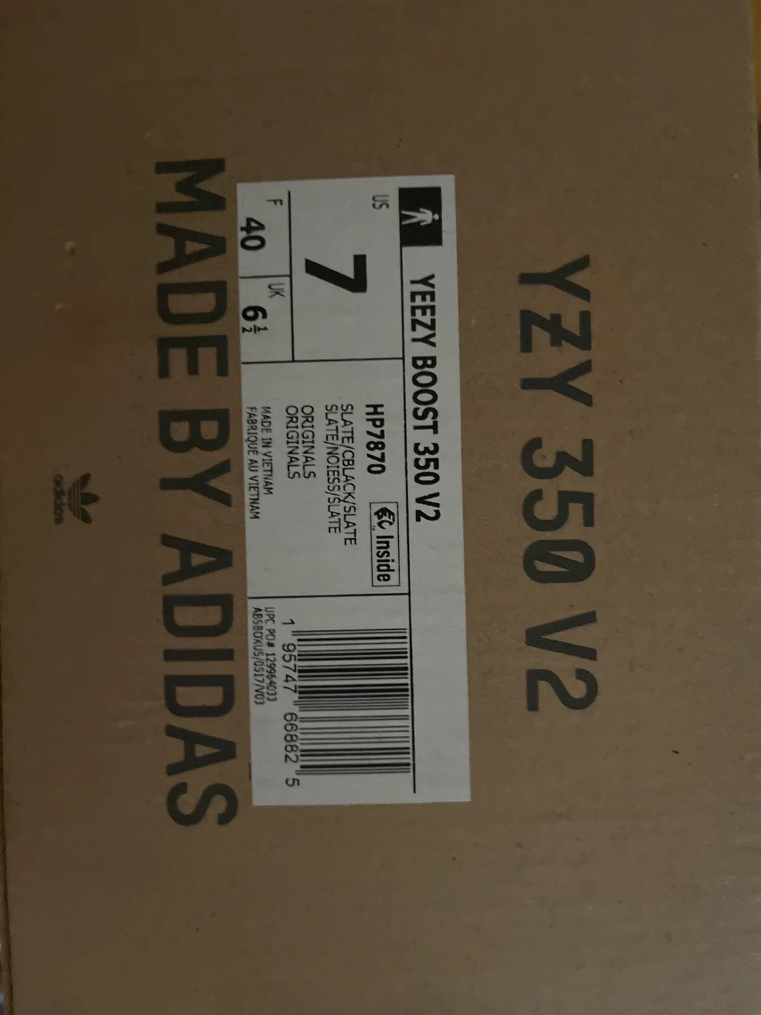 Adidas Yeezy Boost 350 V2 in the 'Slate' colorway. Original box included. These shoes feature a Primeknit upper with a signature side stripe. Made in Vietnam.