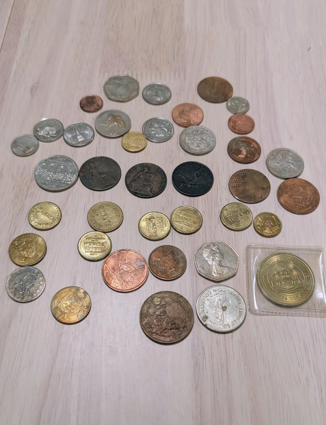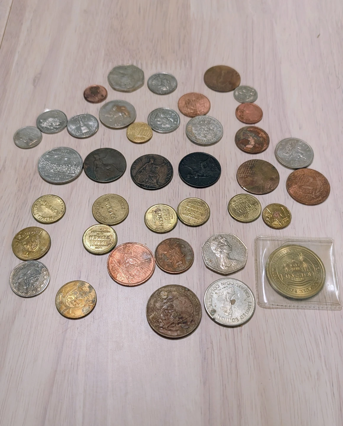 A collection of various vintage coins. This assortment includes coins of different denominations and origins. Great for collectors or anyone interested in numismatics!