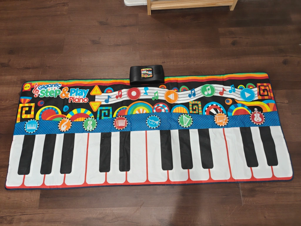 This is the Gigantic Step & Play Piano mat. It features colourful keys and musical notes. Kids can step on the keys to create music! It's a fun way to play and explore sounds. Pick up Near Yonge and Finch
