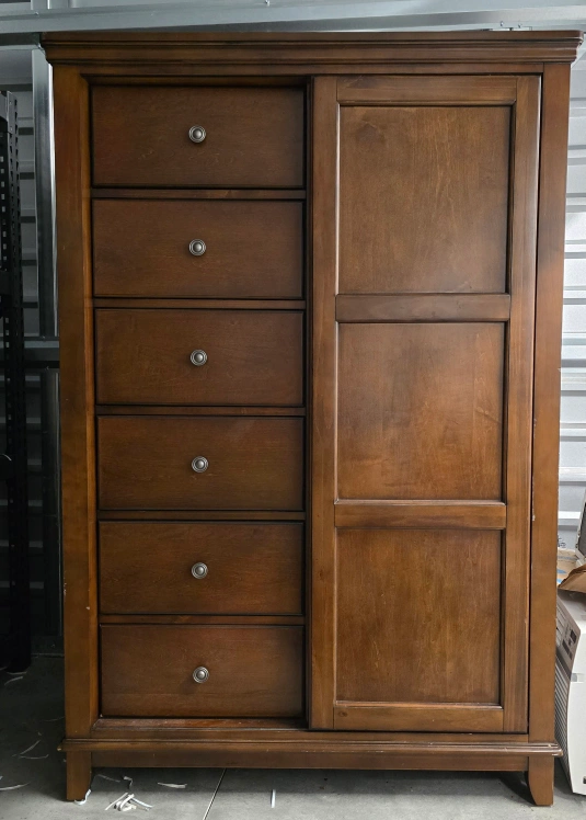10This is a Real wood wardrobe with a sliding door and drawers. It has a nice, classic look and provides ample storage space. It would be perfect for organizing your clothes and other items in a bedroom or closet. It's in good condition and ready for a new home!