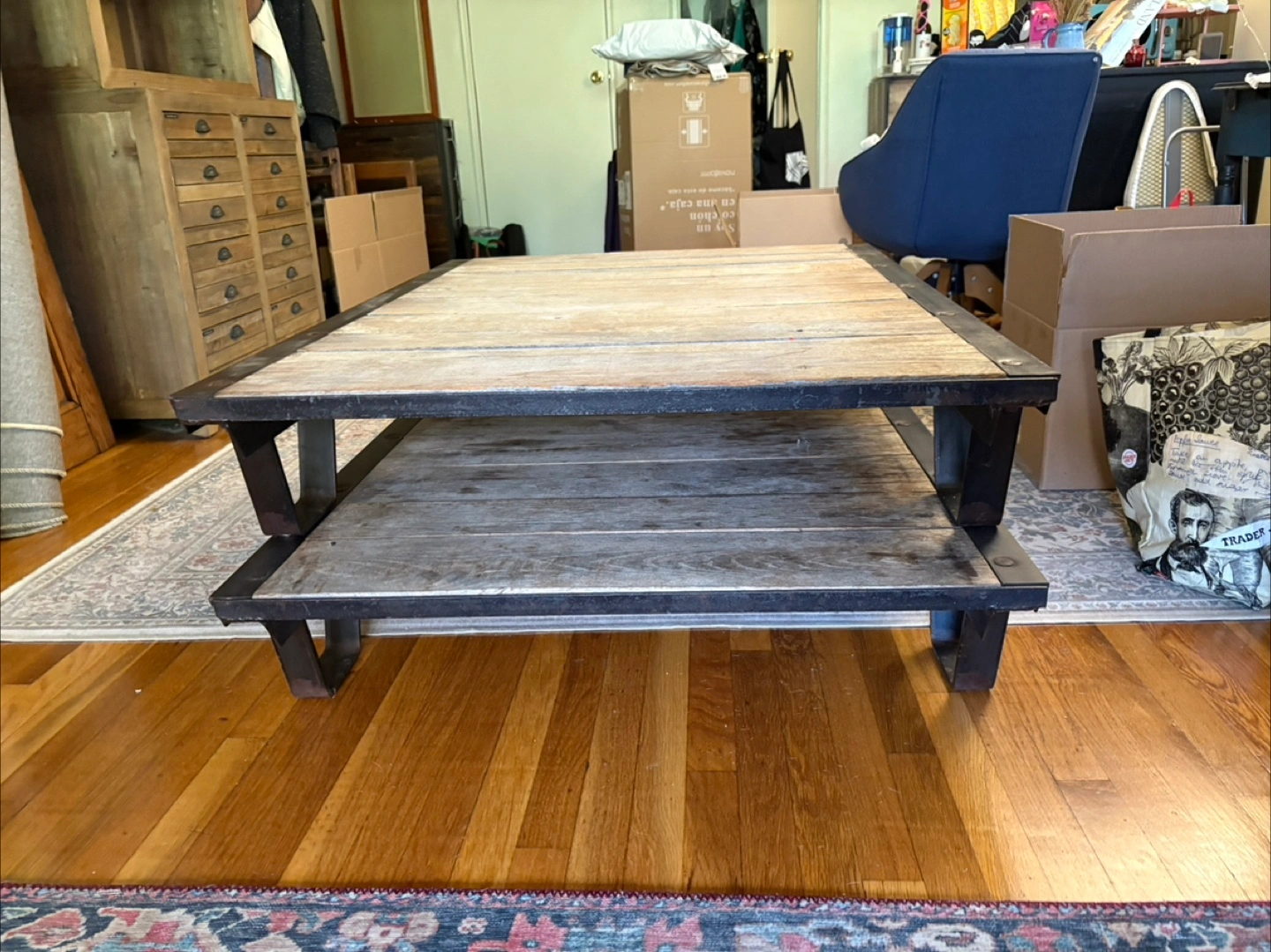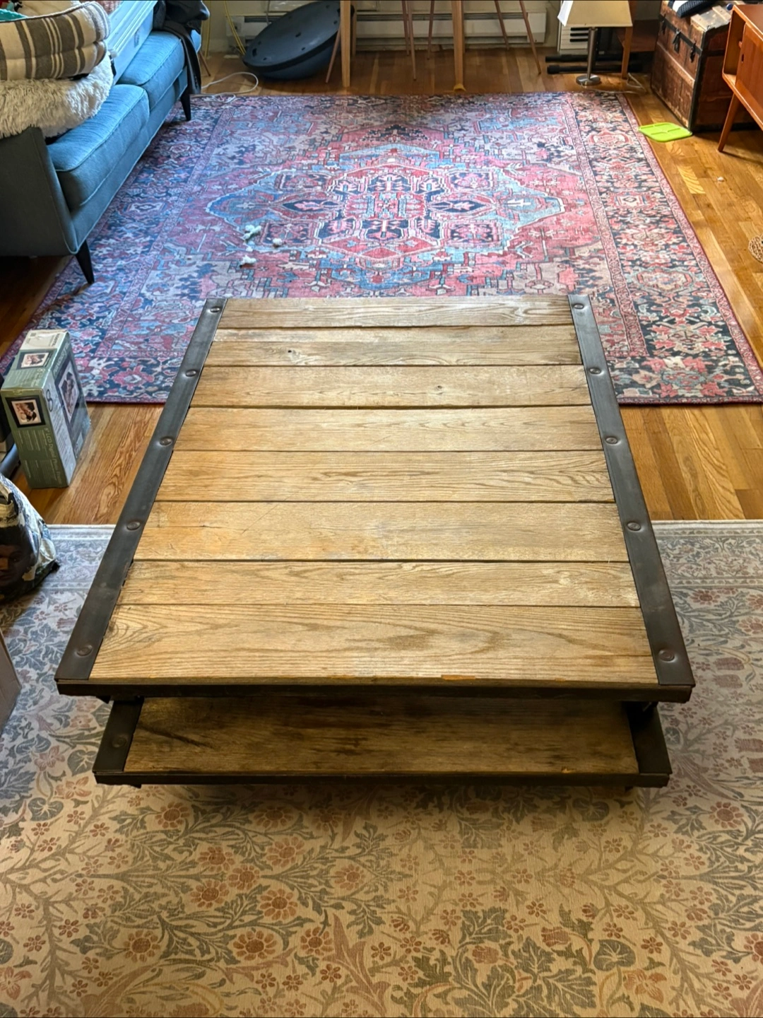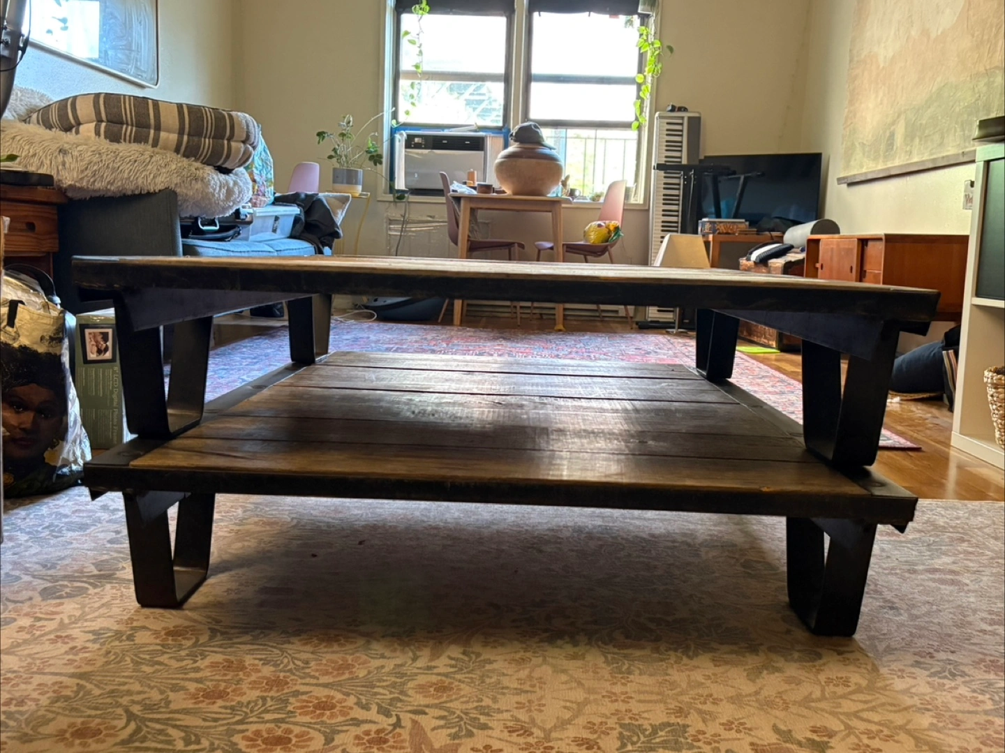 Reclaimed railroad iron + wood = major coffee table goals 🙌 Heavy, industrial, solid, and one of a kind. Comes in 2 layers (see last photo) but when stacked, is the perfect coffee table height. I’m sad to say goodbye to this incredible piece, but I’m moving to a smaller place that can’t accommodate it. ***please note this is SERIOUSLY HEAVY*** I would NOT recommend in a space where you anticipate moving the coffee table often as you need 2 people. The top layer is in excellent condition (w small natural blemishes). The lower layer shows signs of use. If you want a statement piece to live semi-permanently in its spot this is the perfect table for you!