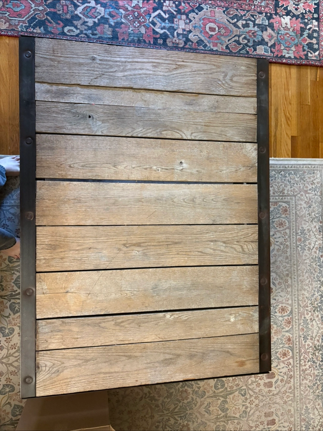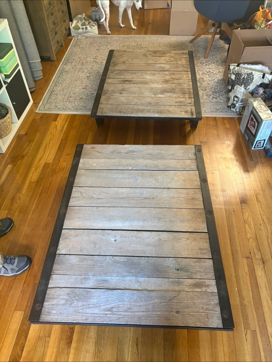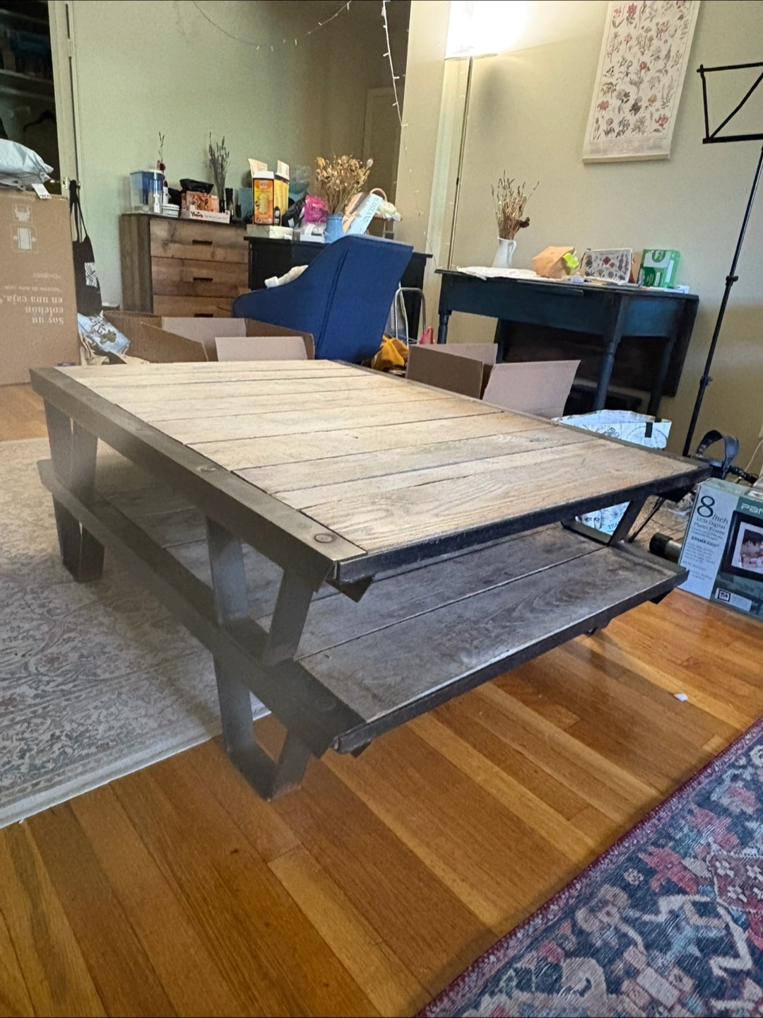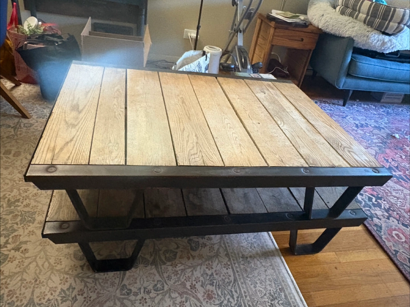 Reclaimed railroad iron + wood = major coffee table goals 🙌 Heavy, industrial, solid, and one of a kind. Comes in 2 layers (see last photo) but when stacked, is the perfect coffee table height. I’m sad to say goodbye to this incredible piece, but I’m moving to a smaller place that can’t accommodate it. ***please note this is SERIOUSLY HEAVY*** I would NOT recommend in a space where you anticipate moving the coffee table often as you need 2 people. The top layer is in excellent condition (w small natural blemishes). The lower layer shows signs of use. If you want a statement piece to live semi-permanently in its spot this is the perfect table for you!