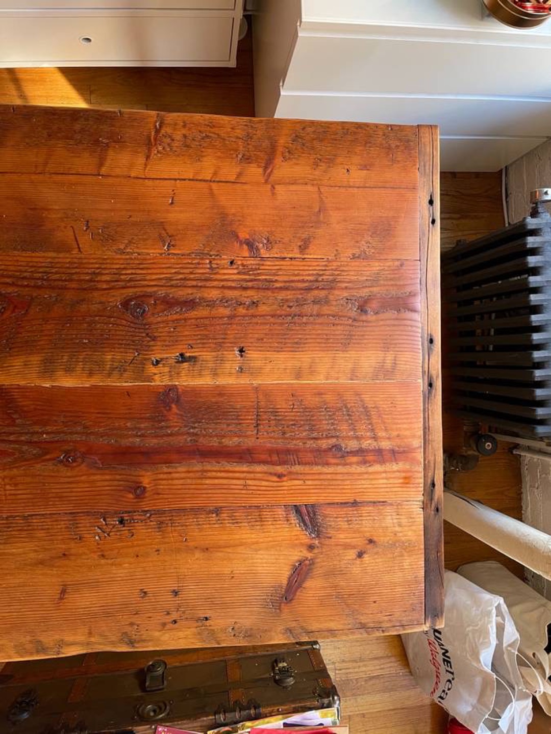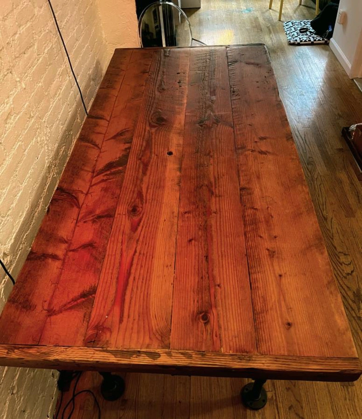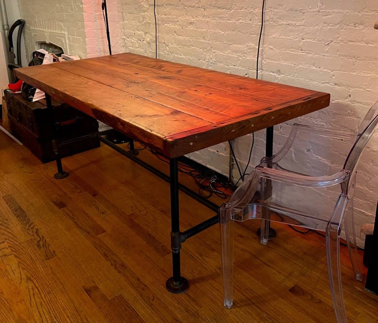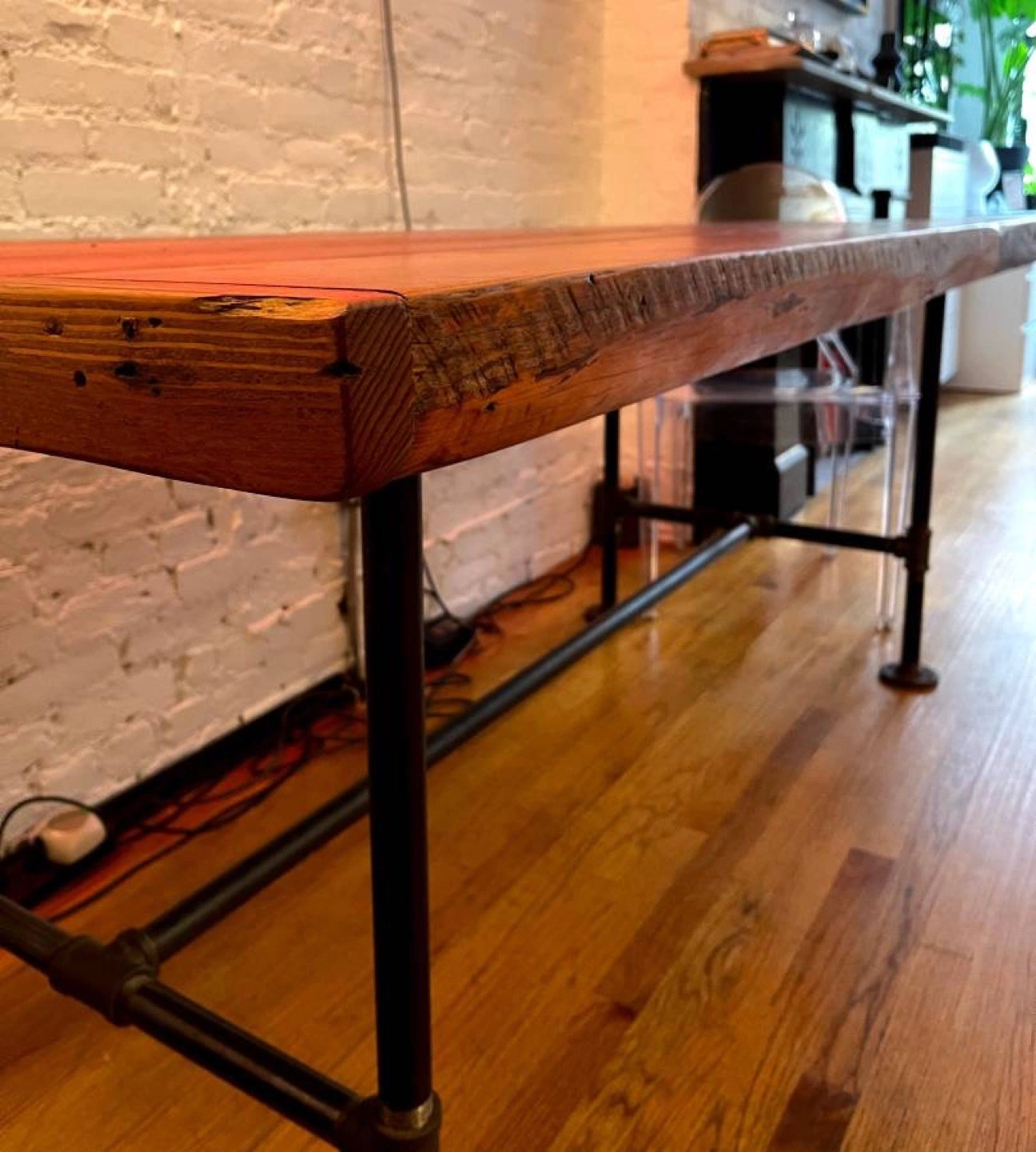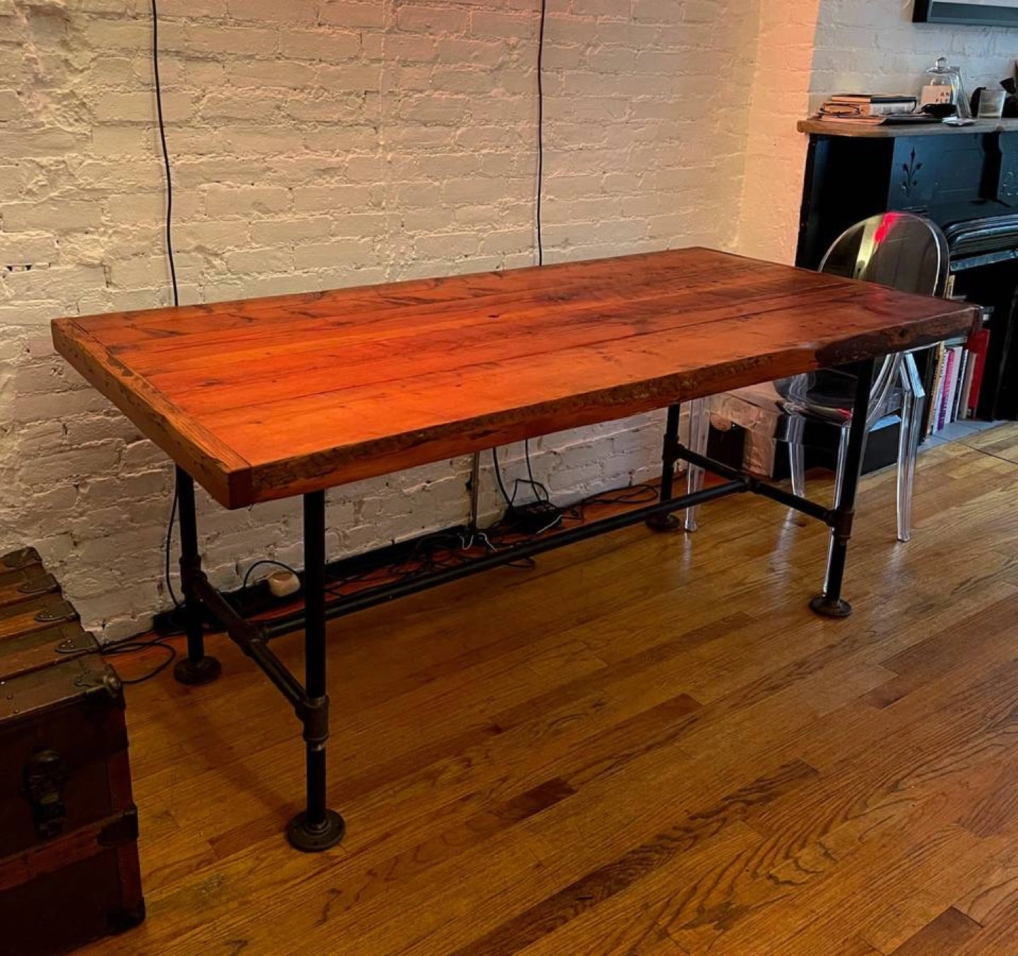 This table is made from thick slabs of Douglas fir (2.5 inches thick), originally sourced from a cabin built in the 1700s from upstate NY. Gorgeous wood grain features and chestnut brown finish Galvanized black pipe legs with easy adjustments for stabilization Removable metal trim on the ends (pictured here without the trim) Metal feet of table have felt pads attached to protect wood flooring from scratches. Table easily seats 6 - 8 . Thes table is heavy to transport - the pipe legs can be removed Dimensions: Table: 73" long x 36" wide x 31.5" height $700 OBO