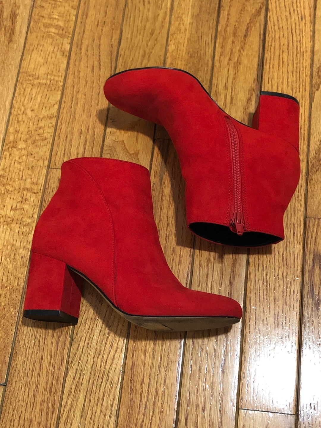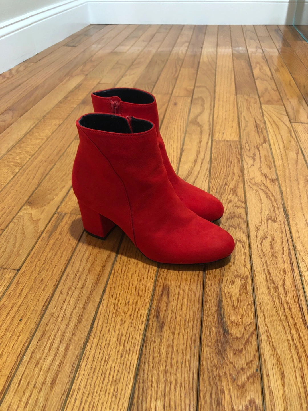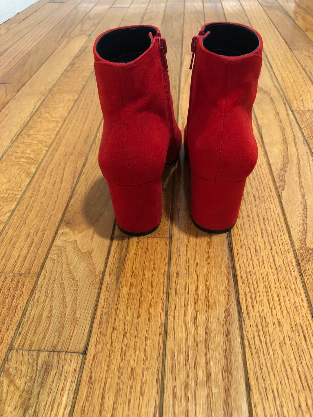 Selling a pair of red ankle boots by I.N.C! They have a block heel and a zipper closure. Perfect for adding a pop of color to any outfit