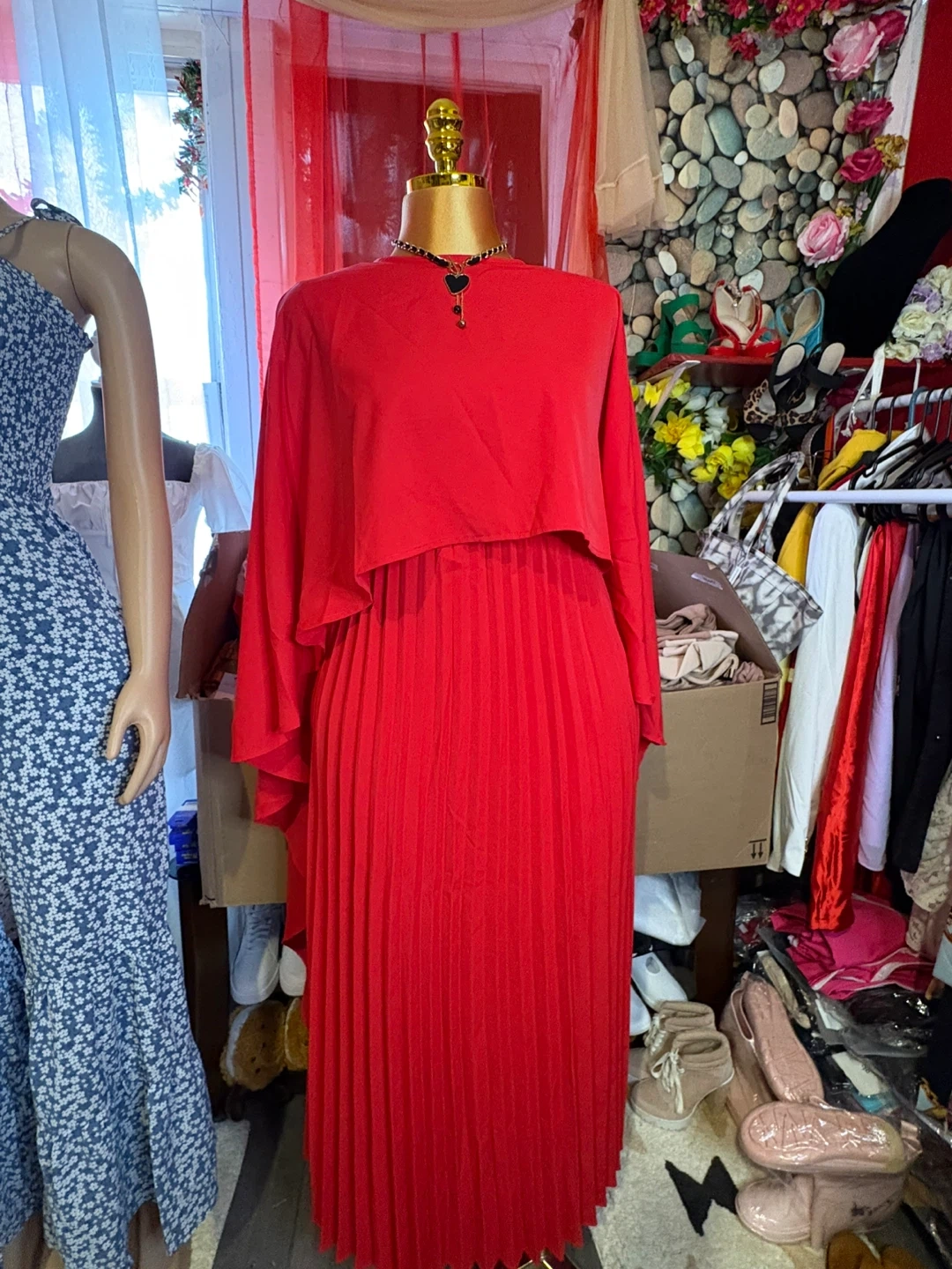 153This is a beautiful red dress with a pleated skirt and a cape-like overlay on top. It's in great condition and ready for a new home! The vibrant red color is sure to make a statement