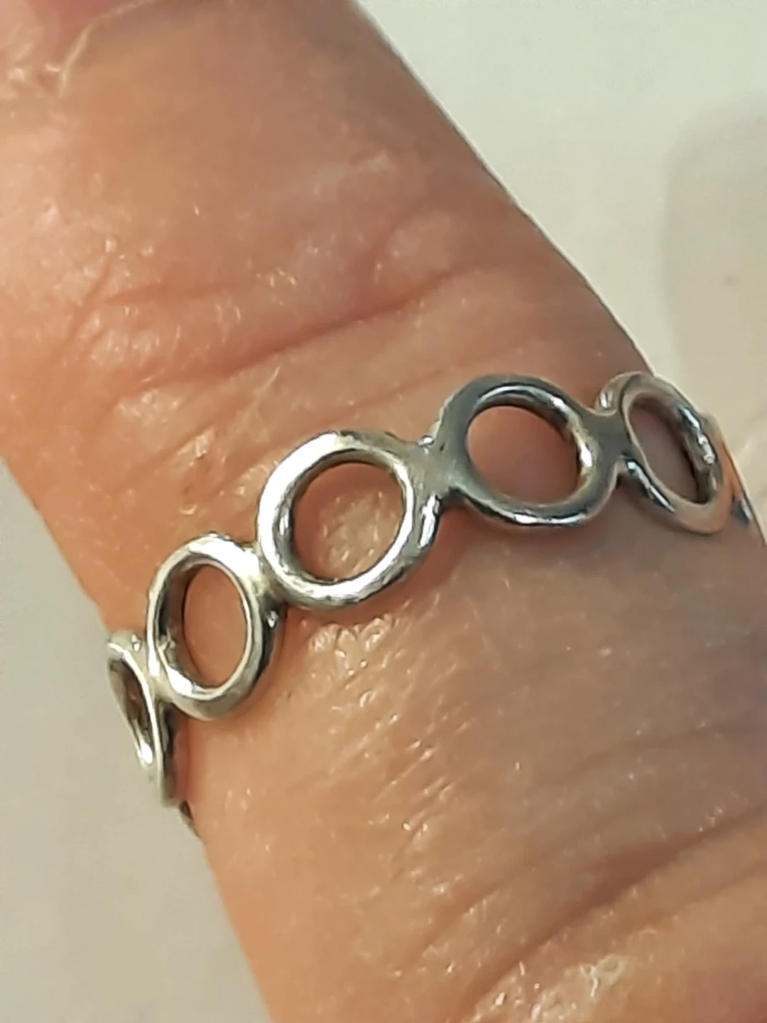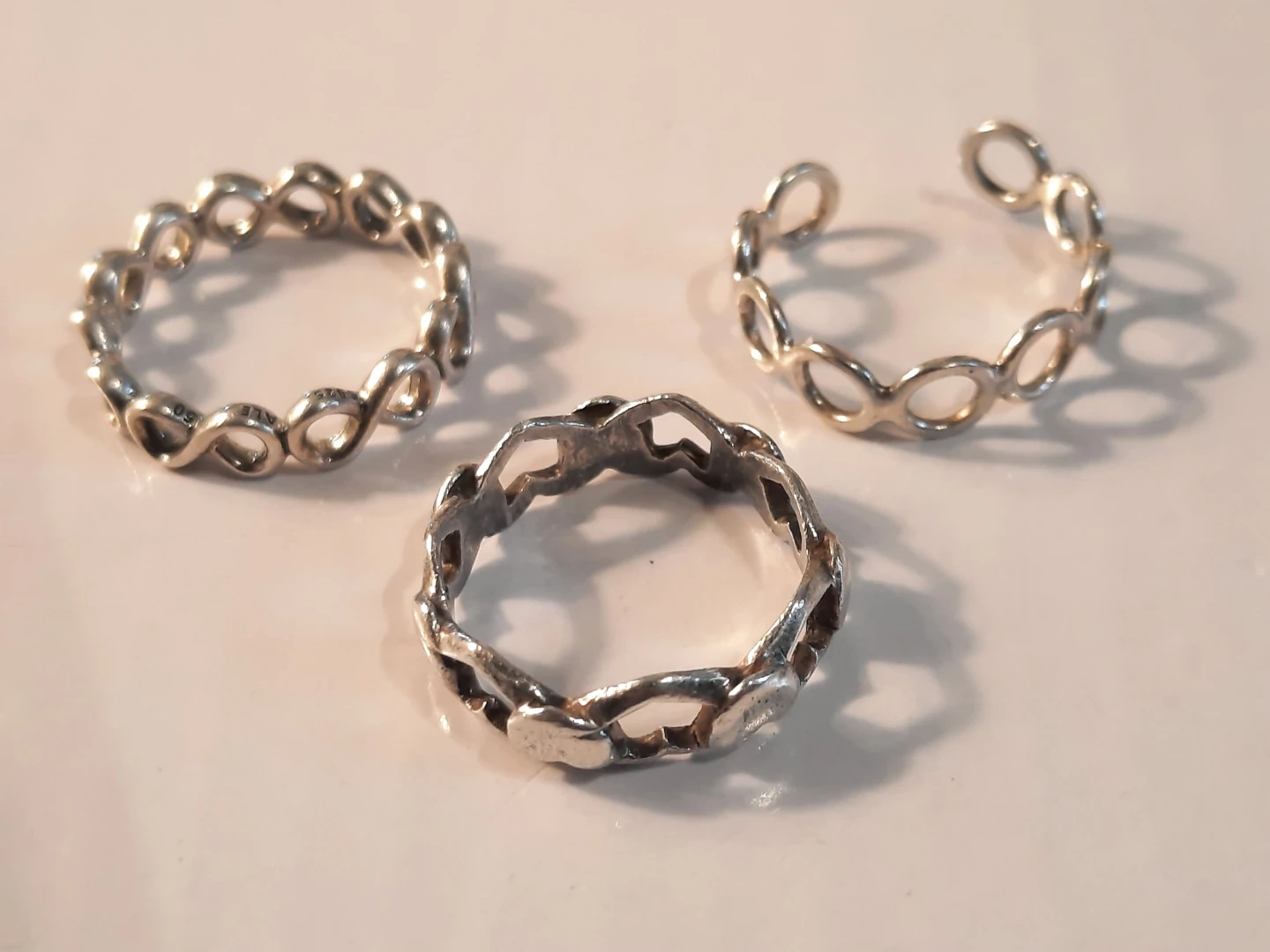 This ring features a delicate design with interconnected infinity symbols. It's a stylish accessory for everyday wear. The ring appears to be made of sterling silver, though one is PANDORA ALE 925 and 2 others 925 silver to match.Pandora only thus Infinity sells like 125 US dollar.here for less all 3 any 149